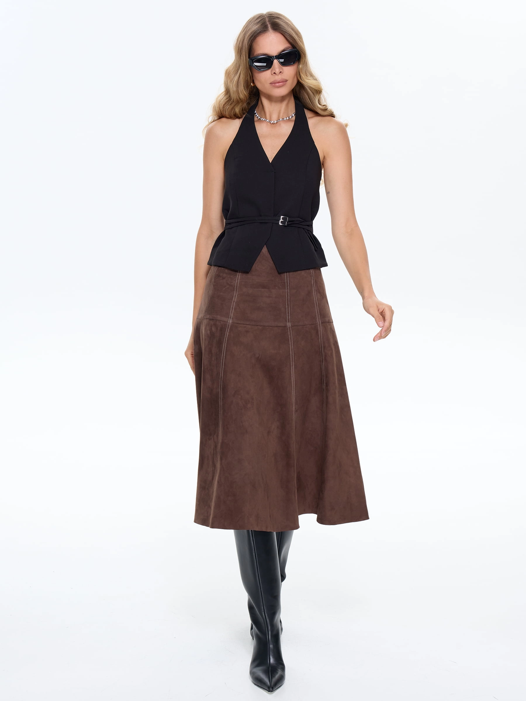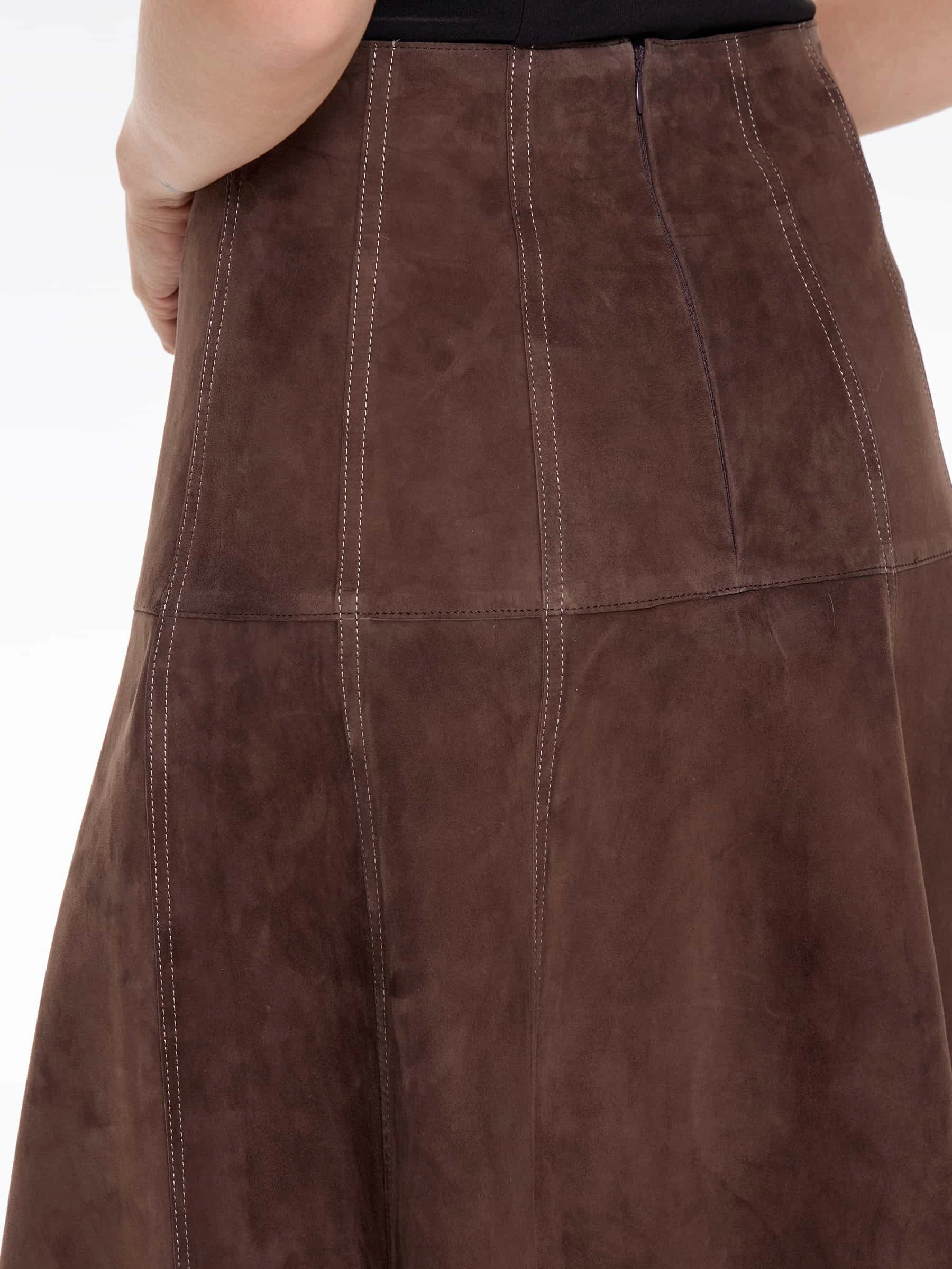 Юбка-миди из мягкой натуральной замши в насыщенном светло-коричневом цвете с контрастной отстрочкой сочетает полуприлегающий крой с элегантным клешем. Контрастная строчка и потайная застежка добавляют модели изысканности, а универсальный оттенок делает ее идеальной для создания разных образов — от повседневных с объемными свитерами до вечерних с шелковыми блузами. Качественная замша гарантирует комфорт и долговечность.