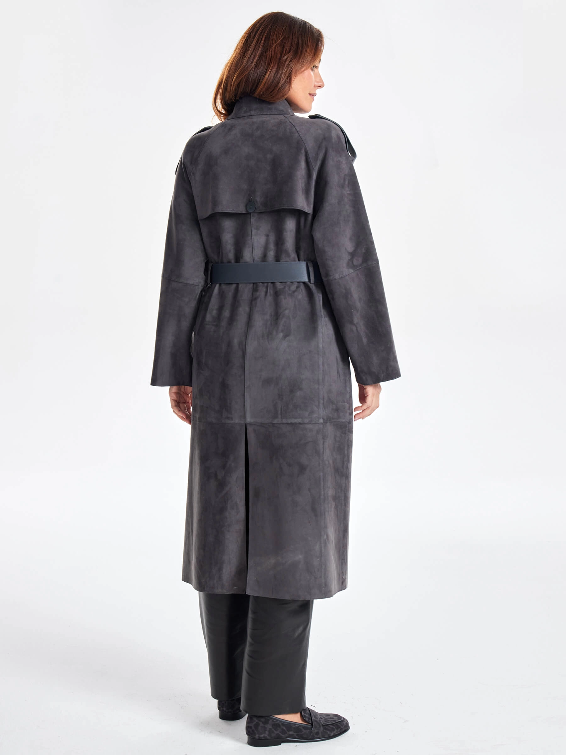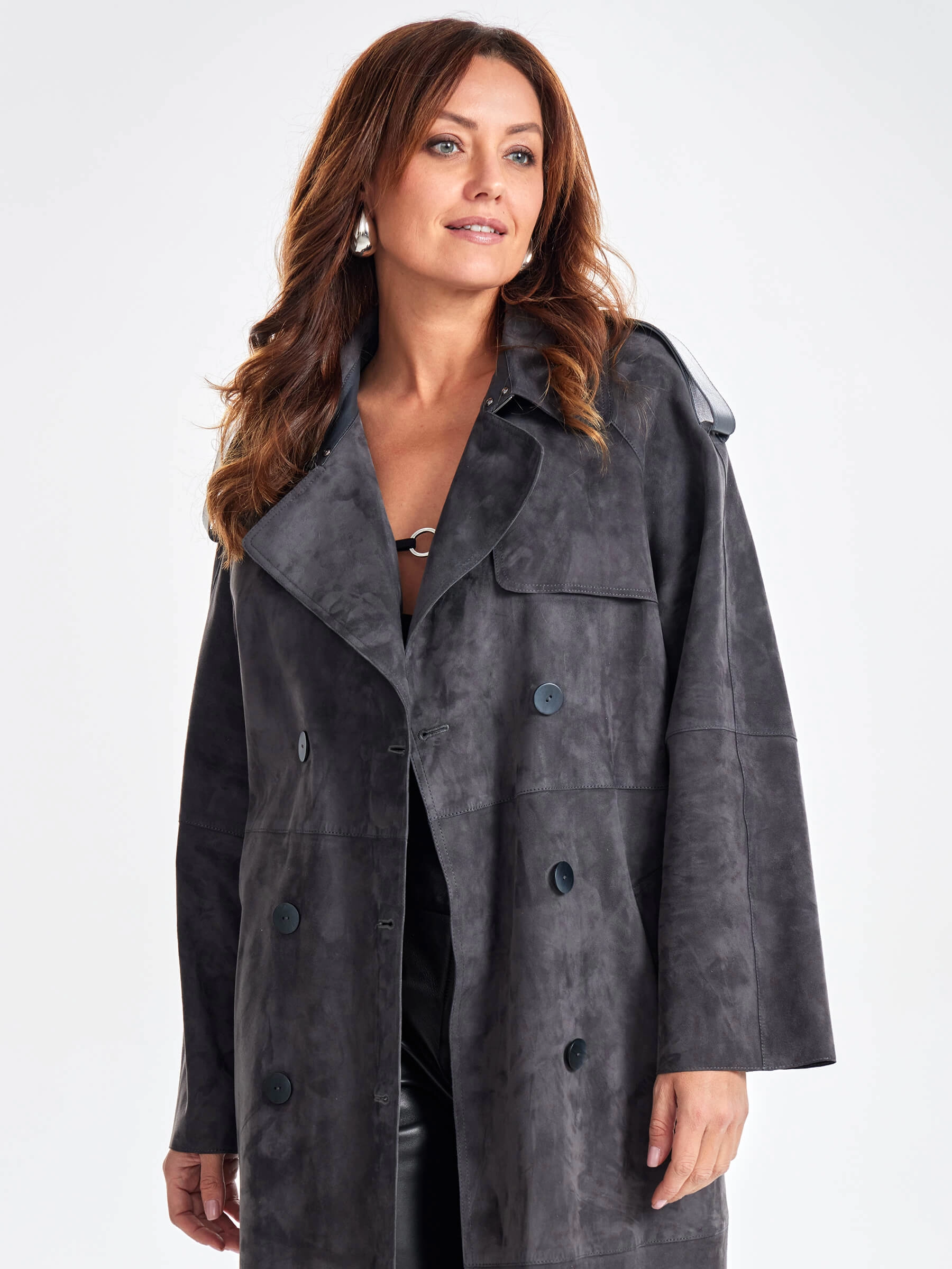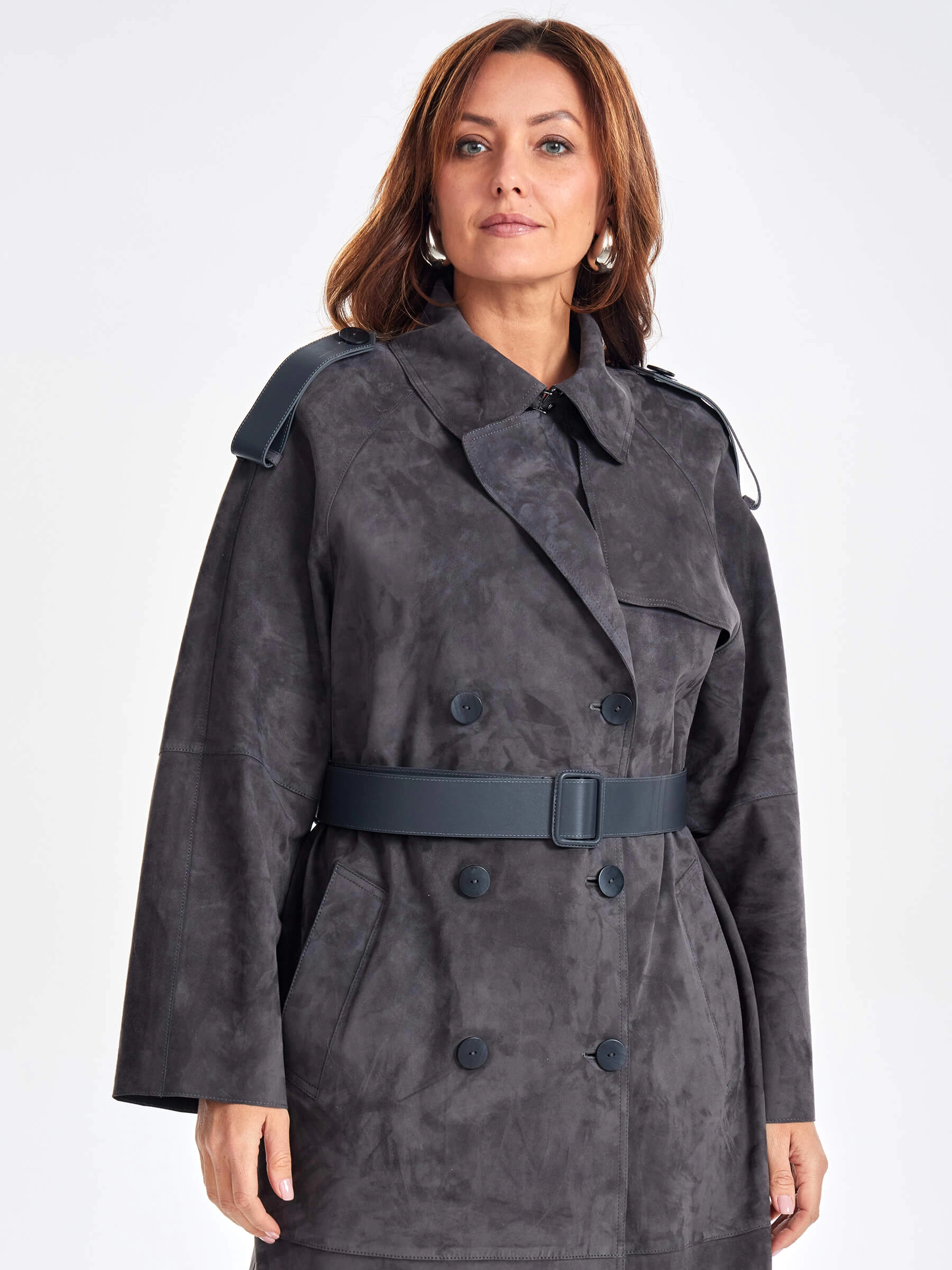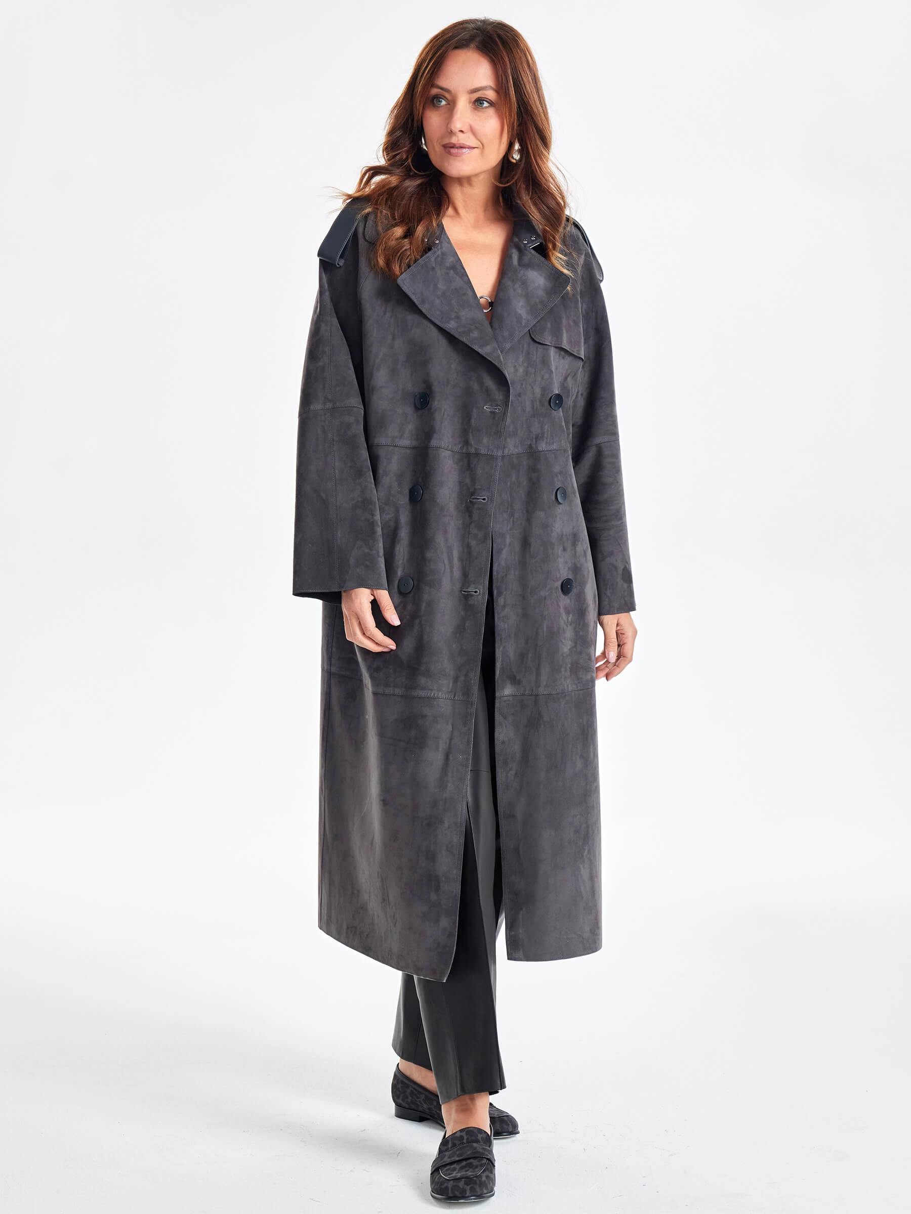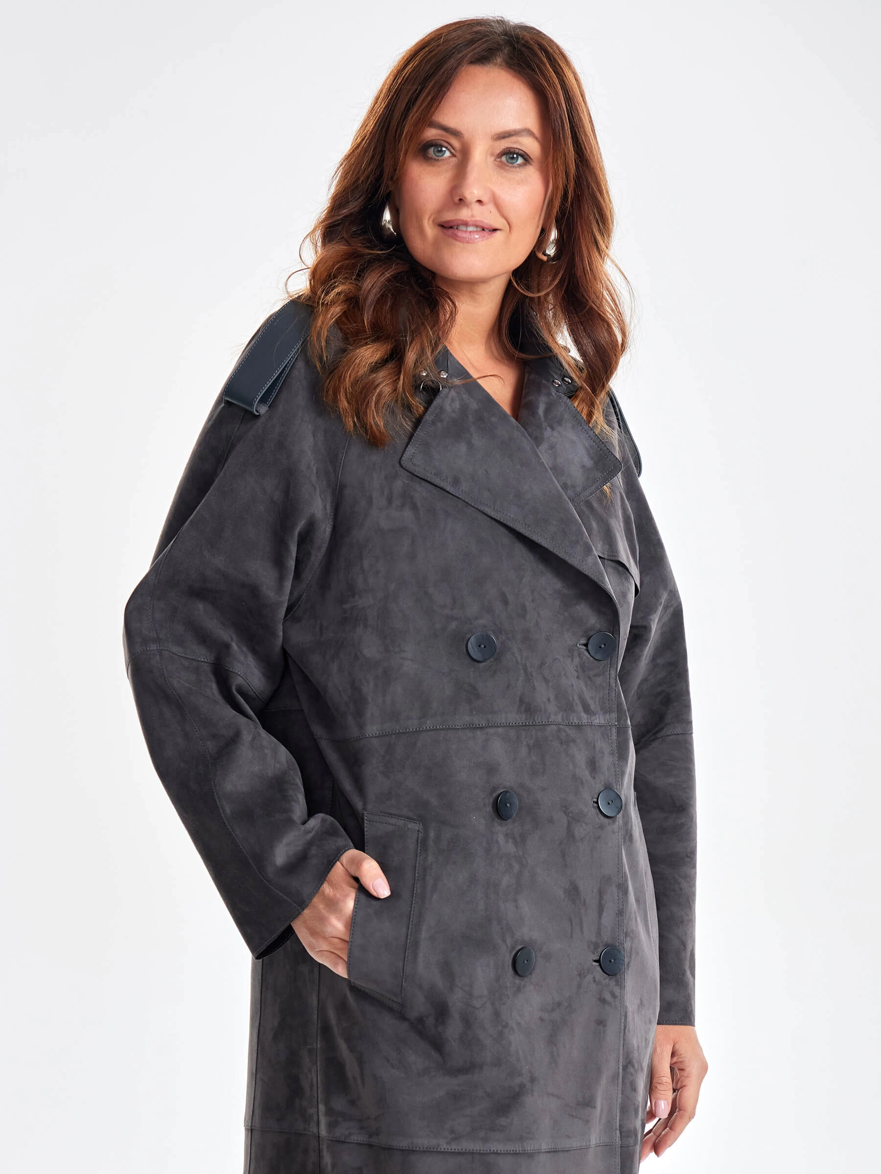 Товар замшевое двубортное женское пальто френч премиум класса 3070з, темно-серое, размер 44, артикул 63370 выполнен из натуральной замши с застежкой пуговицы. Рассчитан на сезон: весна-лето. Длина изделия 120 см, силуэт прямой.