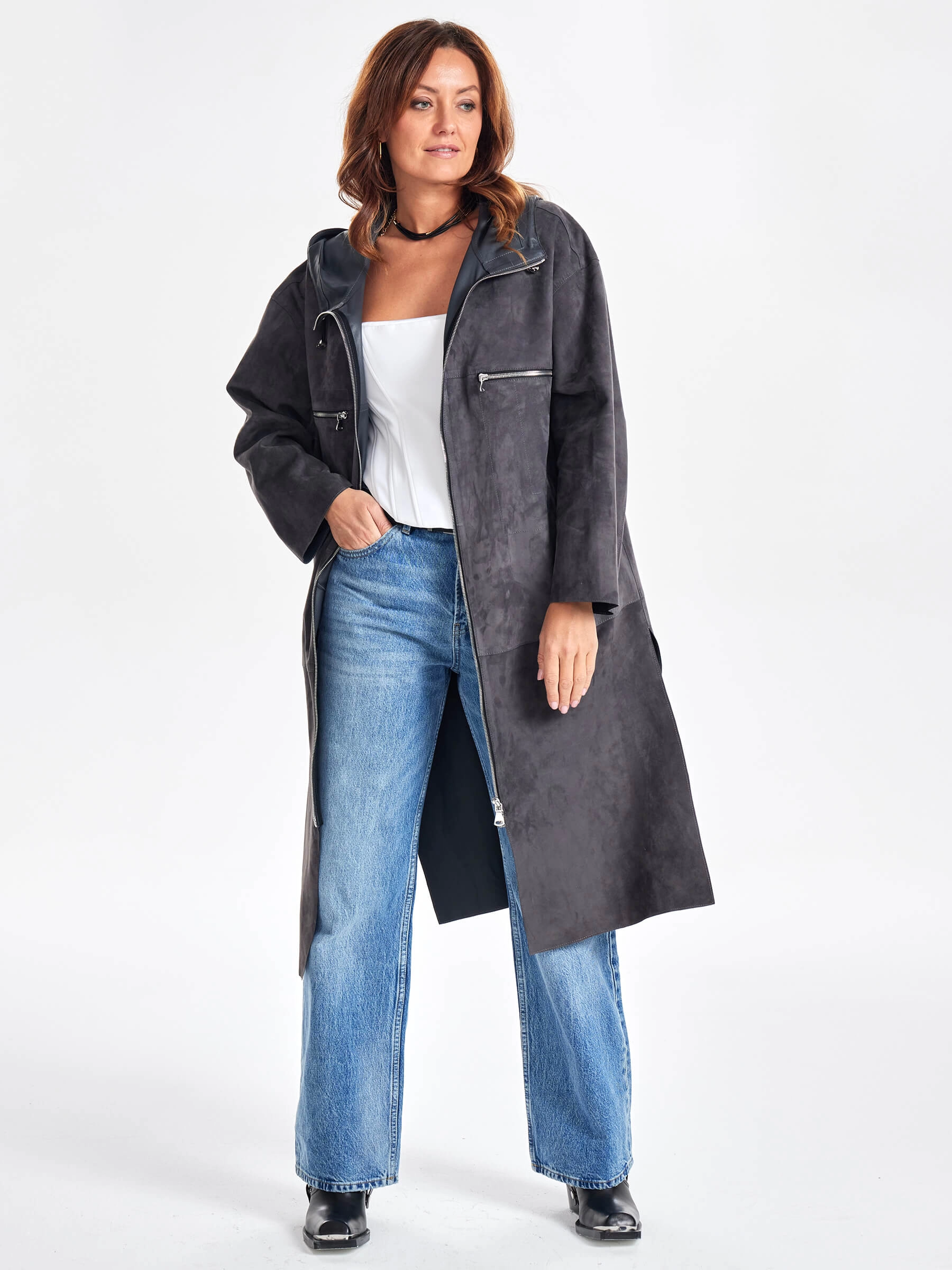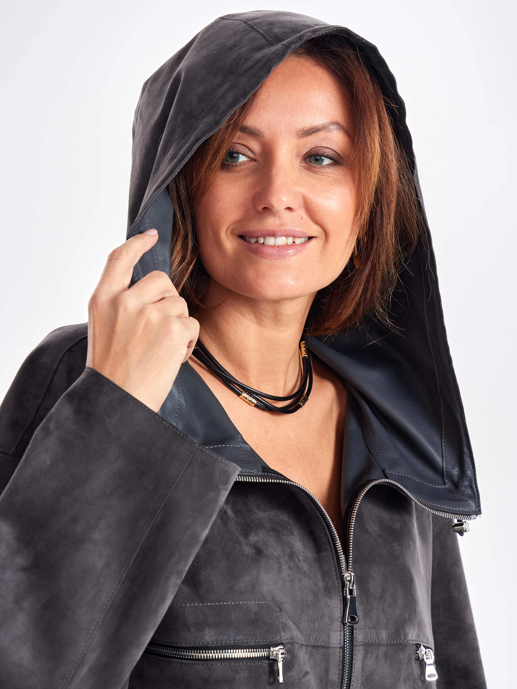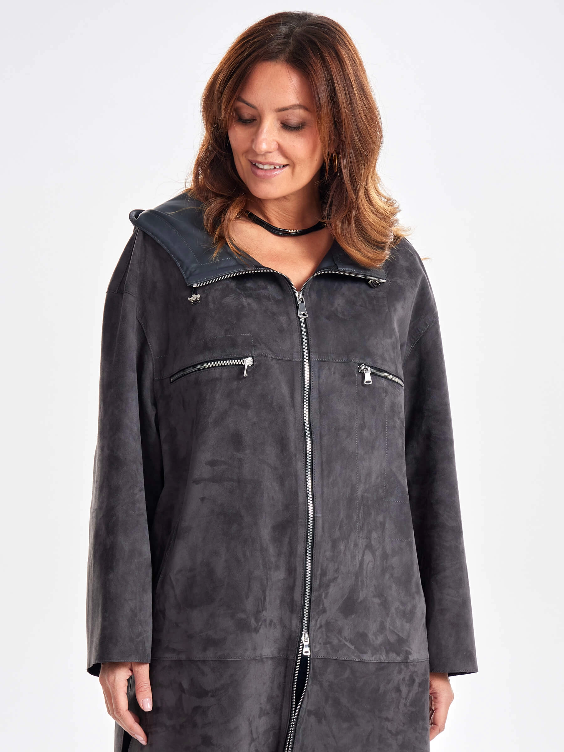 Товар замшевое женское пальто оверсайз с капюшоном на молнии премиум класса 3058з, темно-серое, размер 50, артикул 25690 выполнен из натуральной замши с застежкой молния. Рассчитан на сезон: весна-лето. Длина изделия 110 см, силуэт оверсайз.