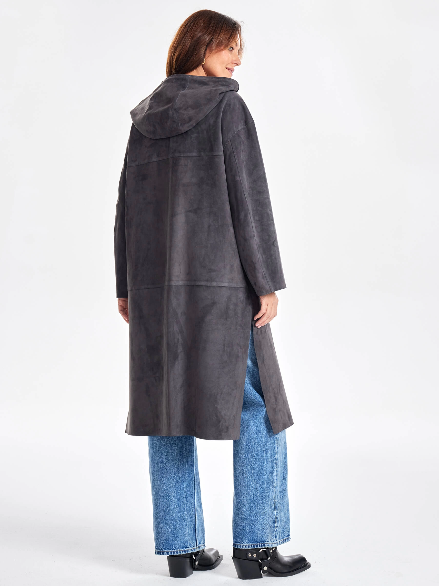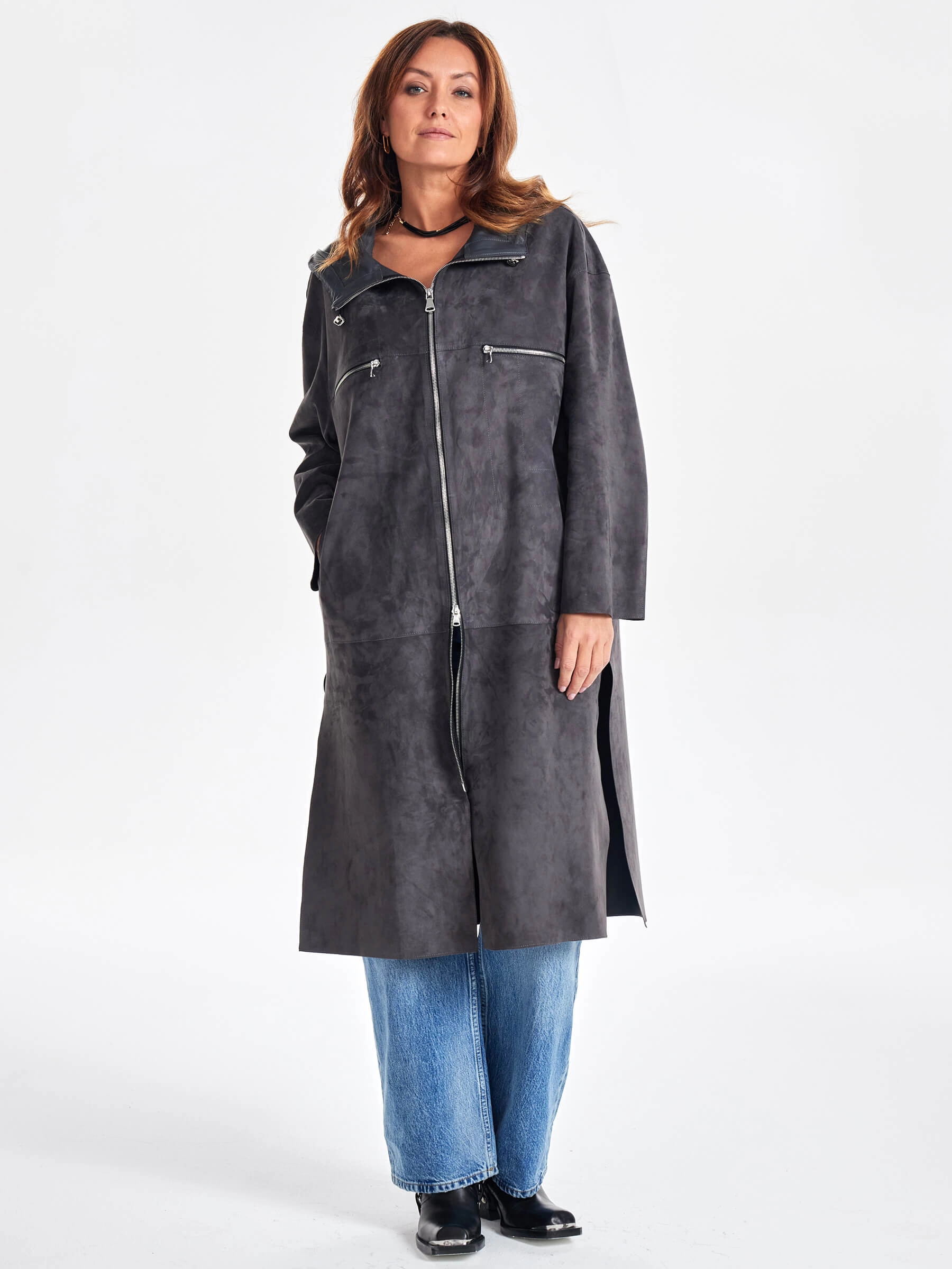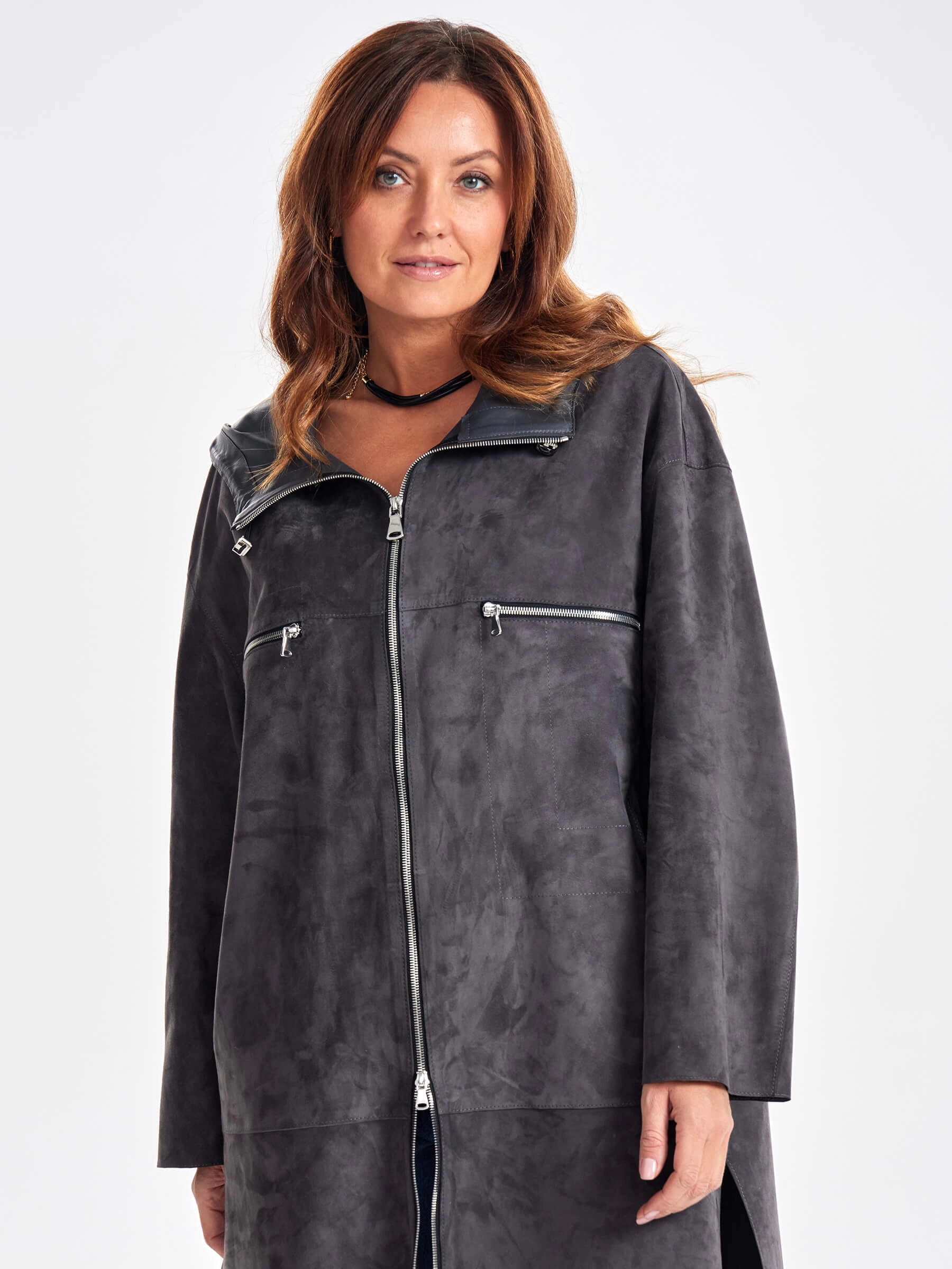 Товар замшевое женское пальто оверсайз с капюшоном на молнии премиум класса 3058з, темно-серое, размер 50, артикул 25690 выполнен из натуральной замши с застежкой молния. Рассчитан на сезон: весна-лето. Длина изделия 110 см, силуэт оверсайз.