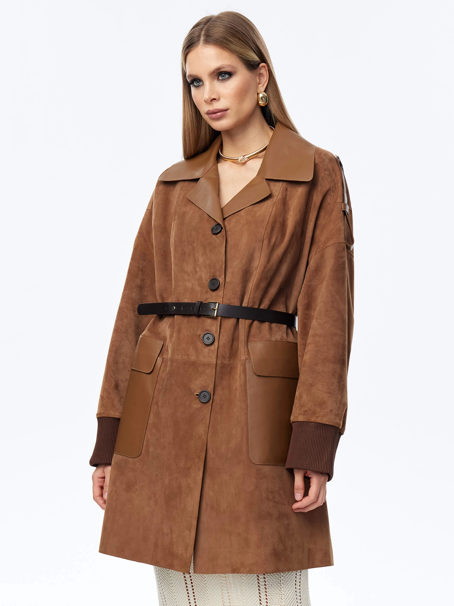 Стильный женственный образ подчеркнет укороченный плащ выполненный из тонкой натуральной замши премиум класса. Свободный силуэт изделия удобно садится по фигуре не сковывая движения. Английский воротник. Спущенная линия плеч. Дополнительный комфорт рукавам добавят плотные трикотажные манжеты. Модель дополнили накладными карманами с клапанами и узким поясом.