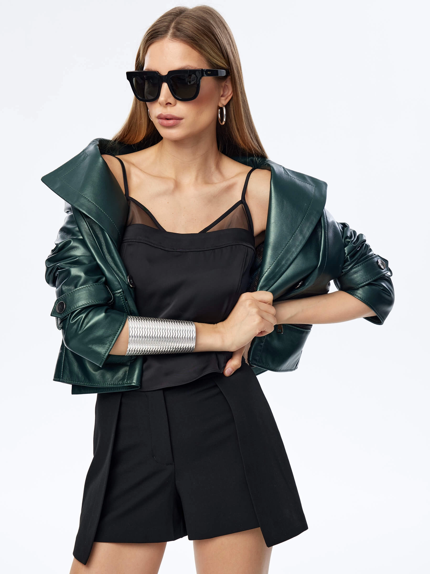 Этот женский двухбортный пиджак из глянцевой зелёной кожи — смелое утверждение индивидуальности и безупречного стиля. Короткая длина (57 см) прямого силуэта с акцентированной линией плеч и классическим английским воротником подчеркивает фигуру, а двурядная застёжка на пуговицах добавляет образу чёткости и динамики. Выразительный изумрудный оттенок натуральной кожи придаёт модели особую глубину и современное звучание. Благодаря удобной подкладке из смеси вискозы и полиэстера (53%/47%) пиджак комфортен для повседневной носки в сезон осень-зима. Сочетайте его с нейтральным базовым топом, джинсами свободного кроя и высокими ботфортами, чтобы создать дерзкий, запоминающийся образ, в котором каждая деталь работает на ваш уверенный вкус.
