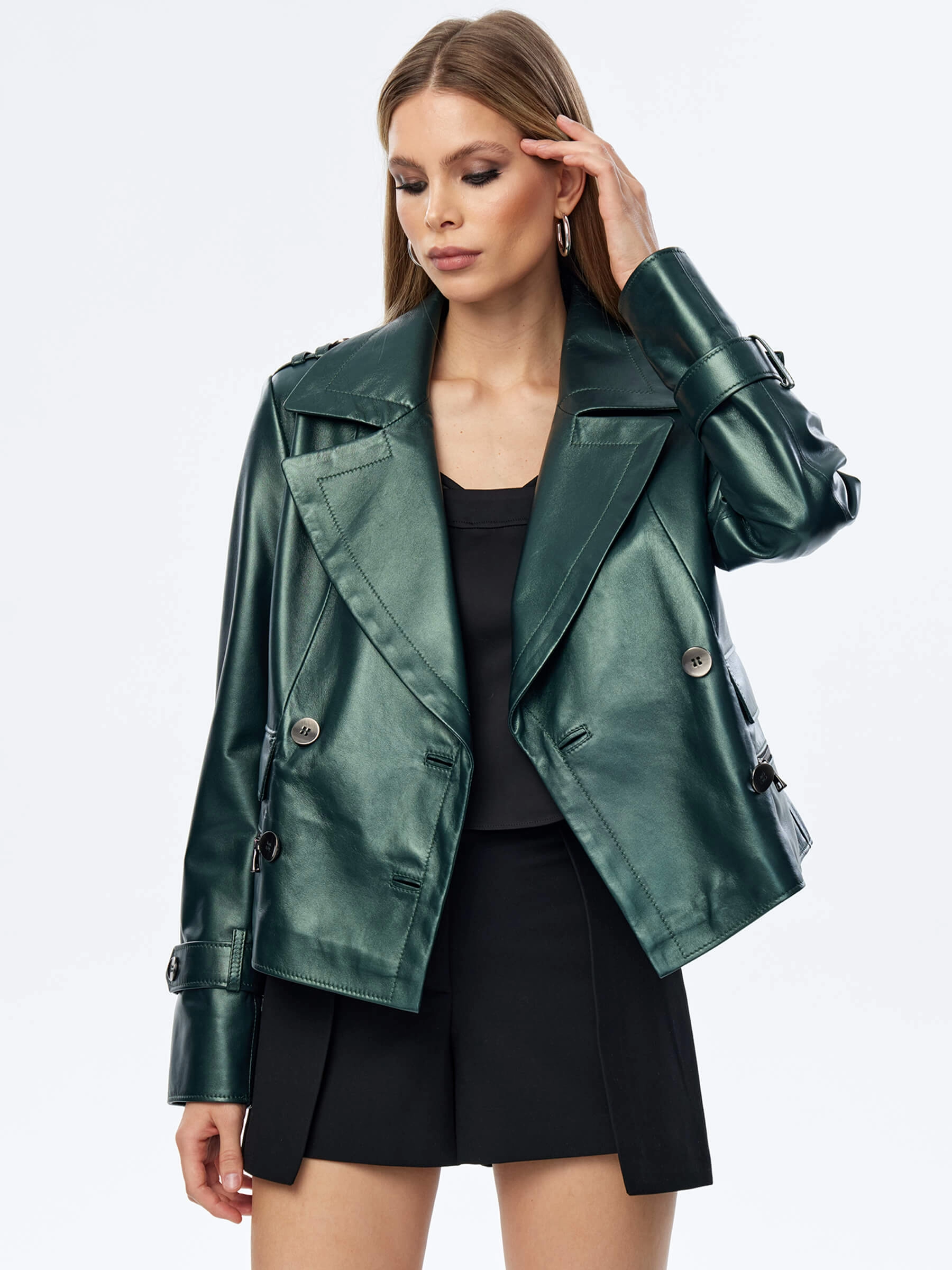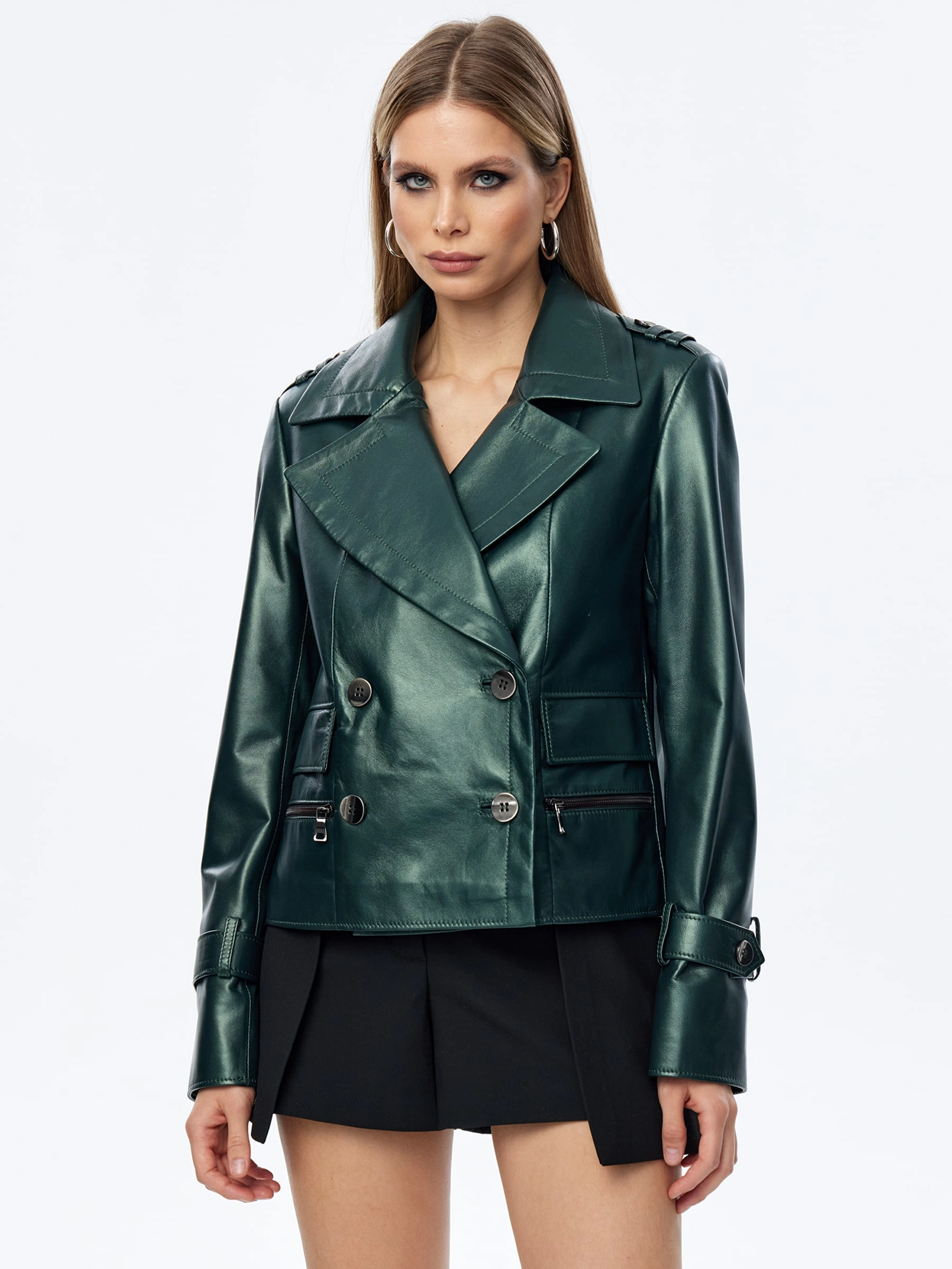 Товар зеленый женский двубортный кожаный пиджак 3014, размер 48, артикул 91730 выполнен из натуральной кожи с застежкой пуговицы. Рассчитан на сезон: осень-зима. Длина изделия 57 см, силуэт прямой.