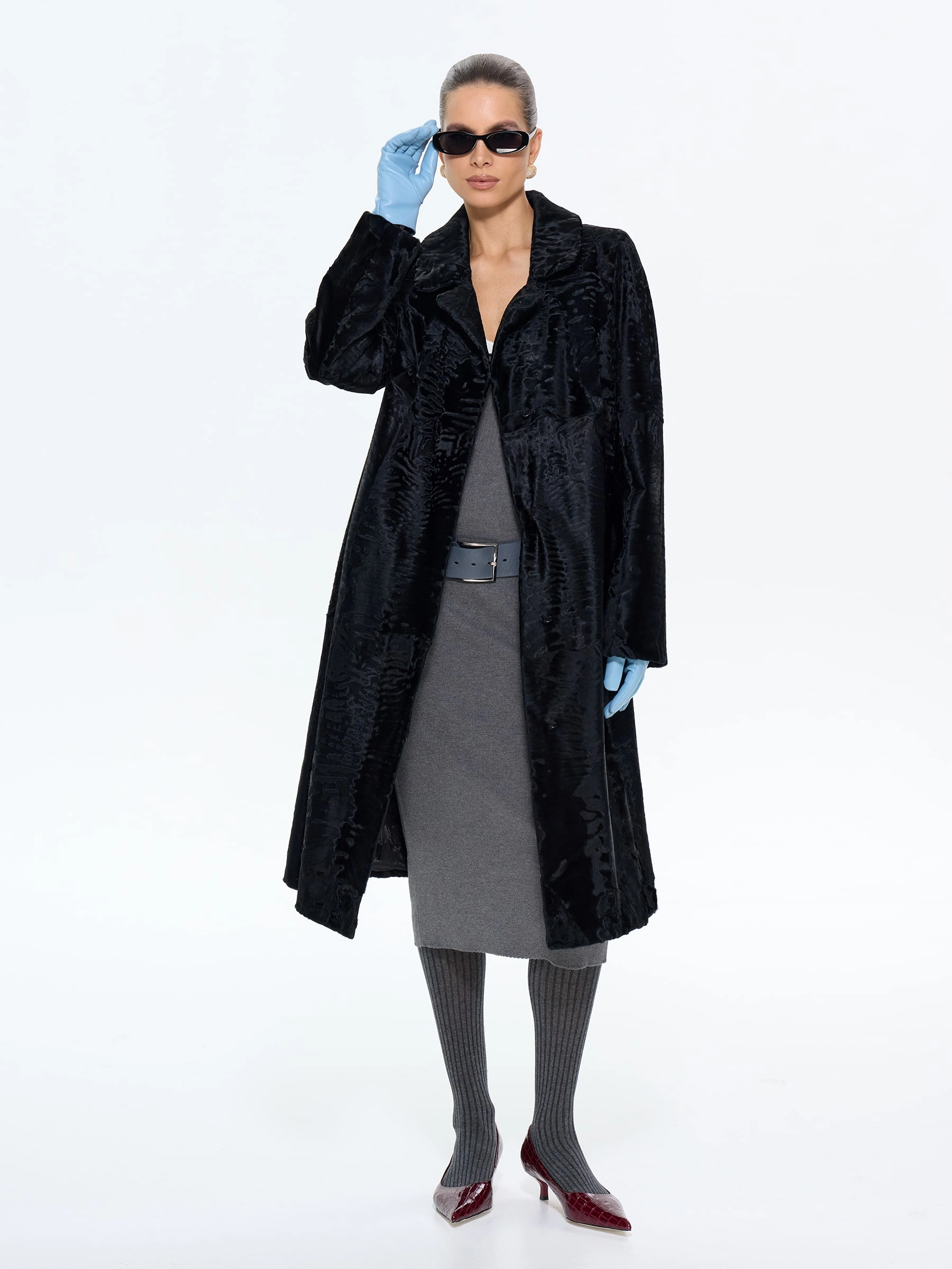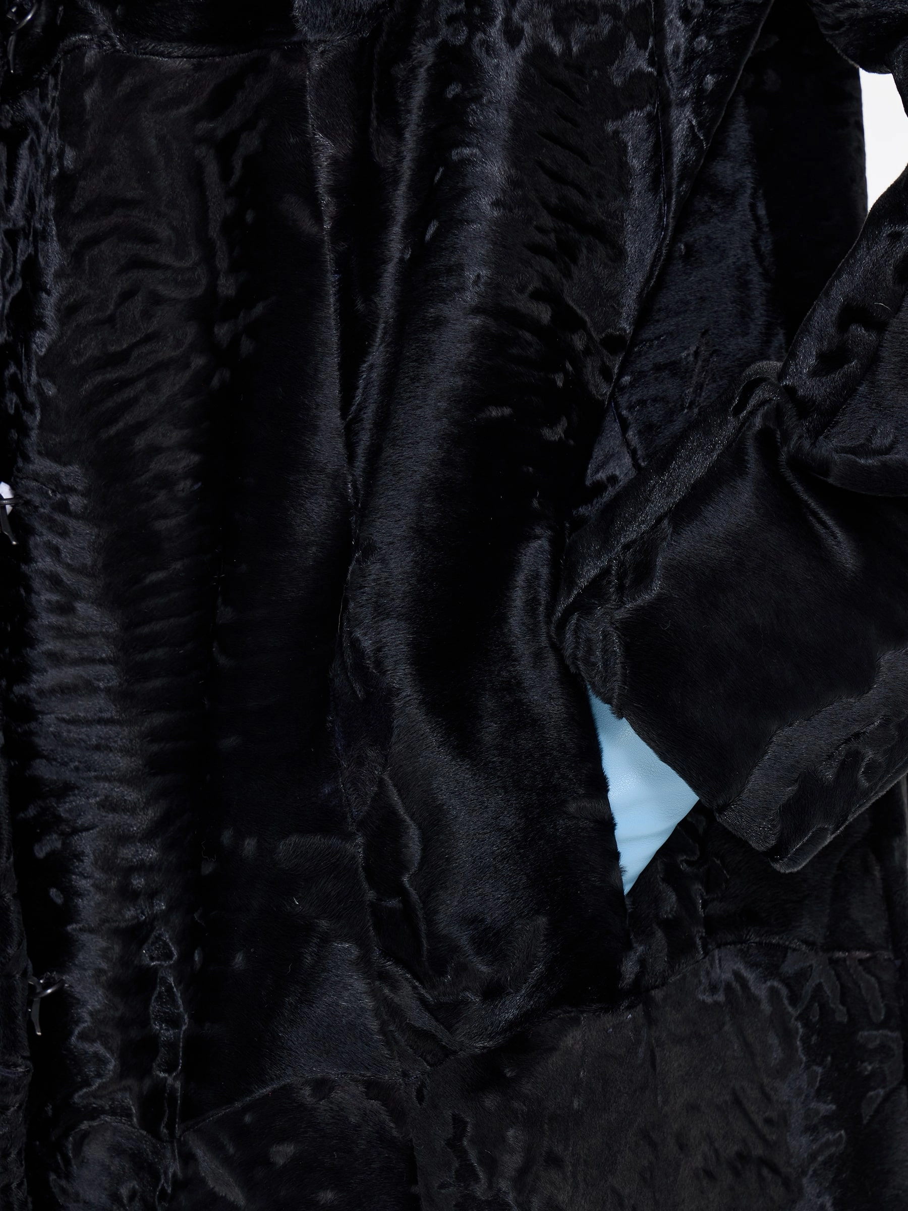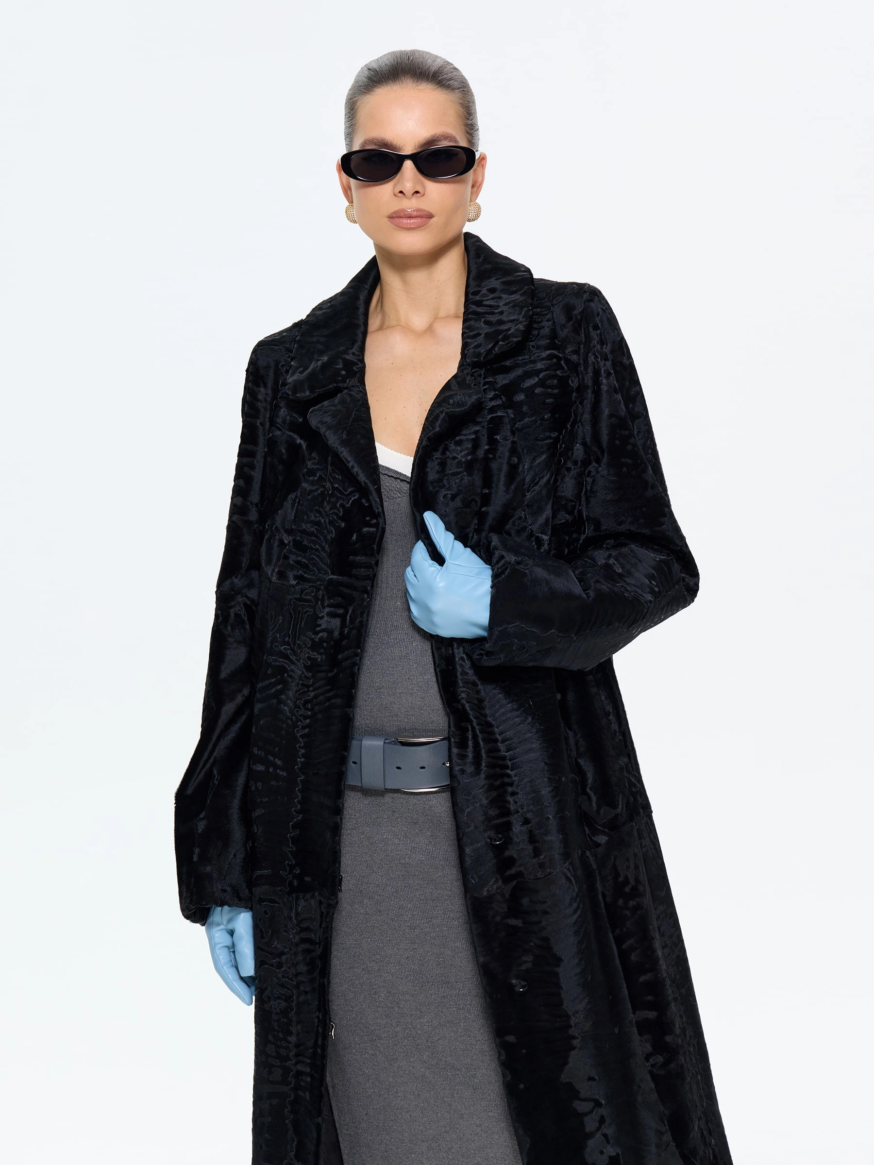 Элегантная длинная шуба из меха каракульчи премиум-класса в глубоком черном цвете с выразительным английским воротником. Модель прямого силуэта длиной 108 см создает вытянутый стройный силуэт, подчеркивая аристократическую элегантность. Стилисты рекомендуют носить эту шубу с кожаными перчатками и сапогами по колено, дополнив структурированной сумкой, или с платьем-футляром и жемчужными серьгами для вечернего выхода. Эта модель — воплощение вечной классики и неповторимого шарма, который подчеркнет ваш утонченный вкус в любом сезоне.