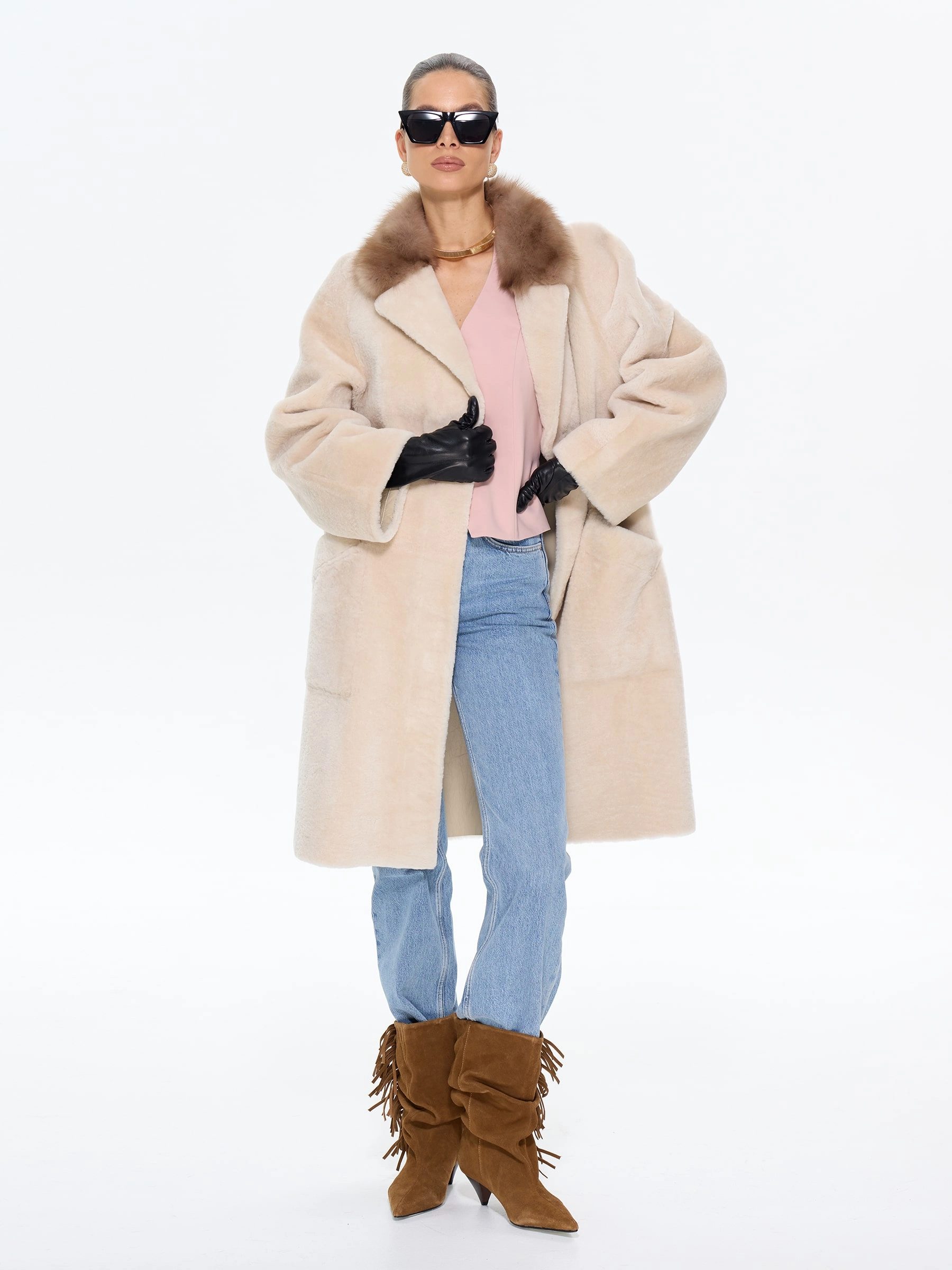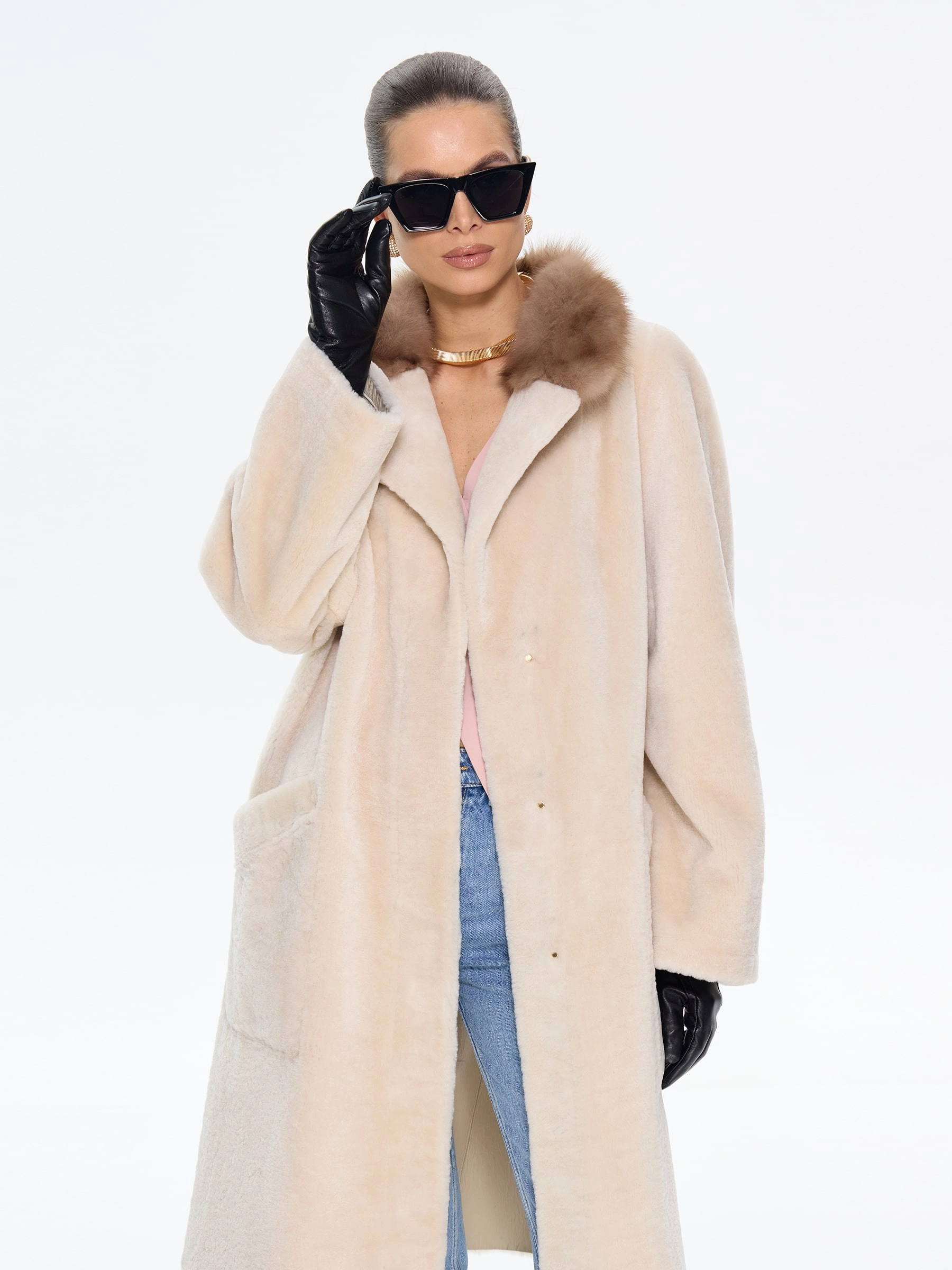 Женская дубленка свободного кроя с куницей 2070, бежевая, размер 44, артикул 65220