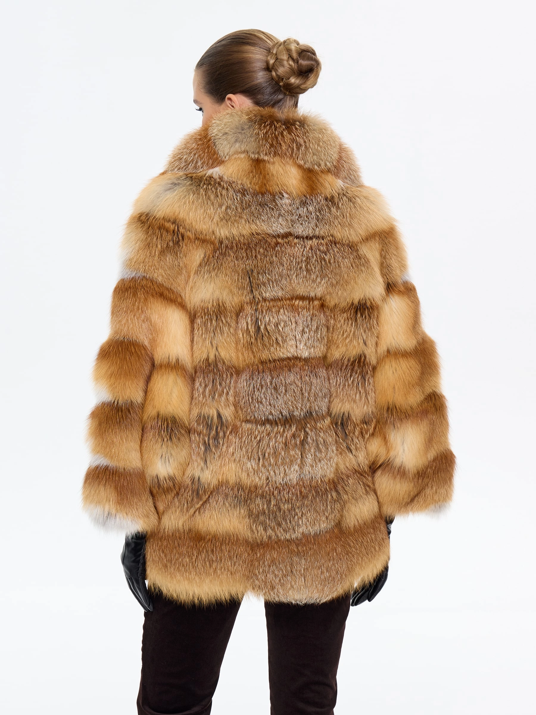 Эффектная короткая шуба из меха лисы с элегантным английским воротником — для тех, кто не боится заявить о своем стиле! Модель длиной 70 см с прямым силуэтом и смечными рукавами кимано подчеркивает индивидуальность, а роскошный мех создает объем и драматизм. Стилисты рекомендуют носить эту дерзкую модель с кожаными брюками и грубыми ботинками для создания уличного образа или с облегающим платьем и сапогами-ботфортами для вечернего выхода — она станет главным акцентом вашего гардероба, подчеркивающим смелый и современный вкус.