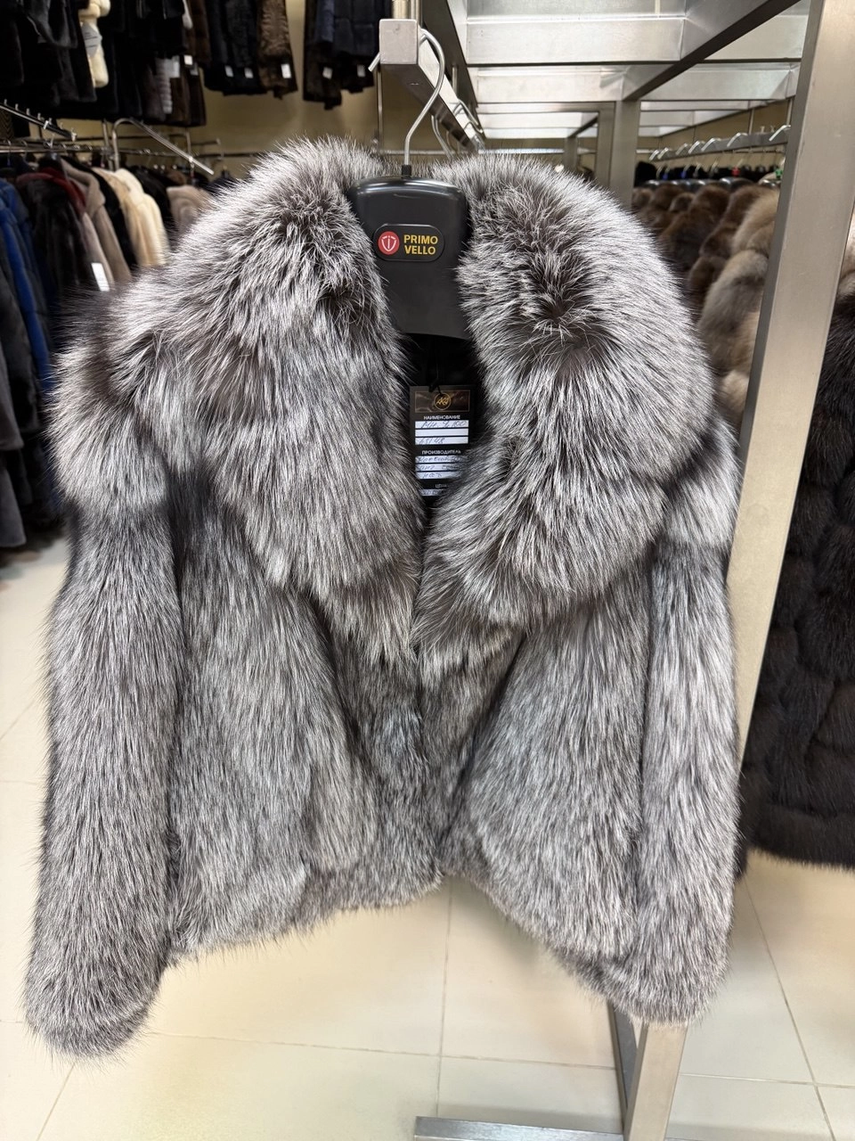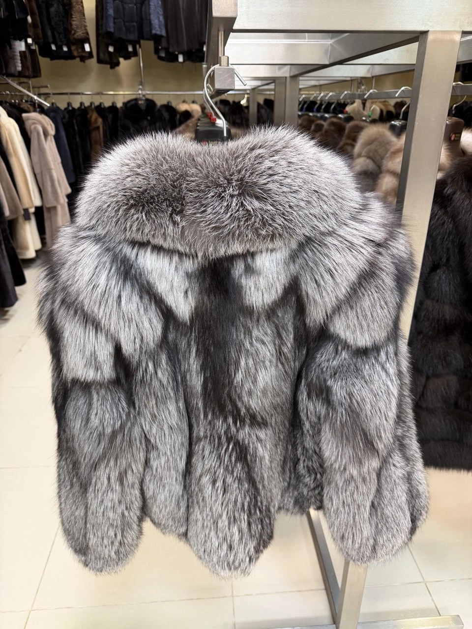 Короткая шуба из меха лисы для женщин Л1010-010, серебристо-чёрная, размер 48, артикул 65510