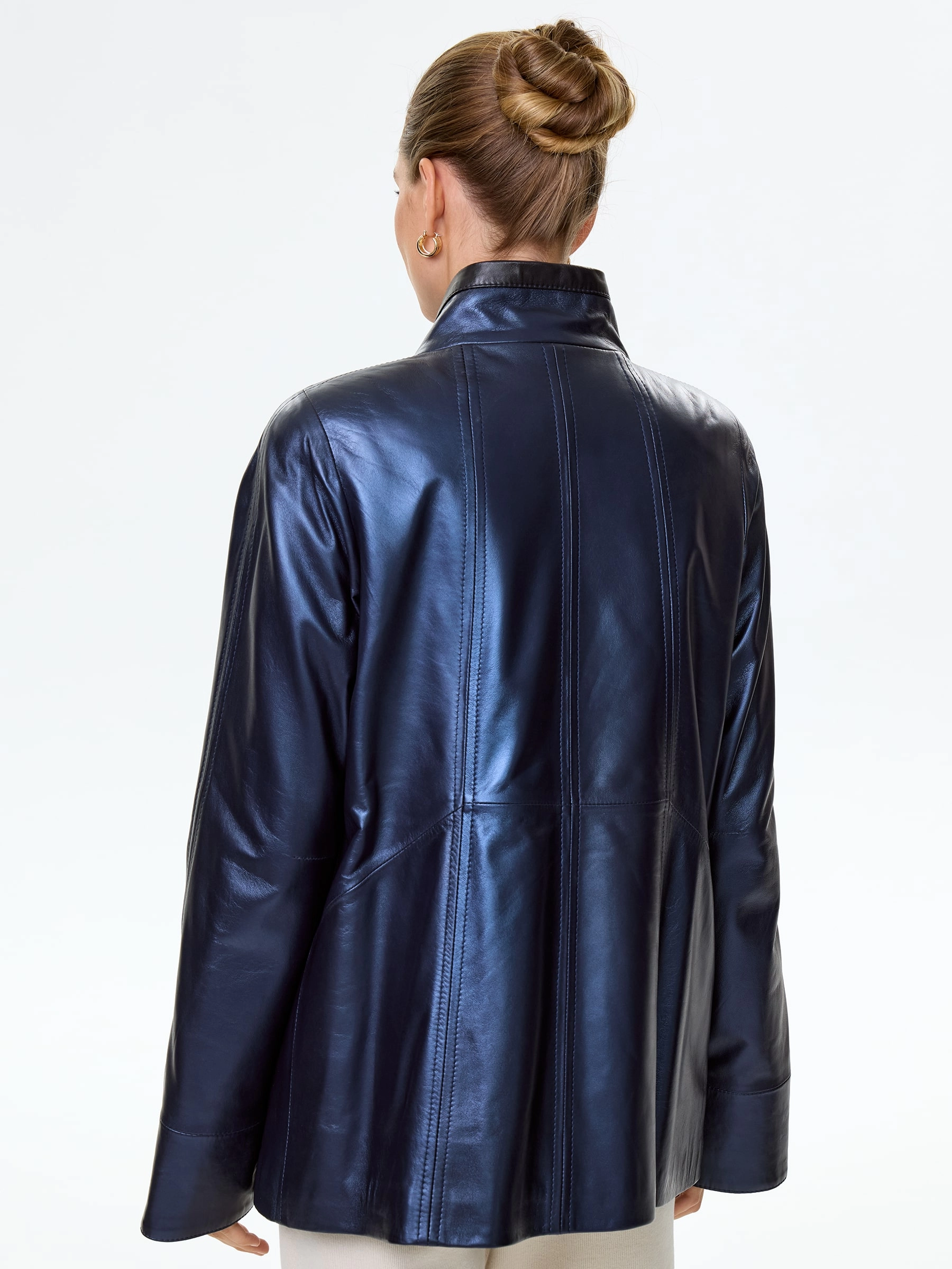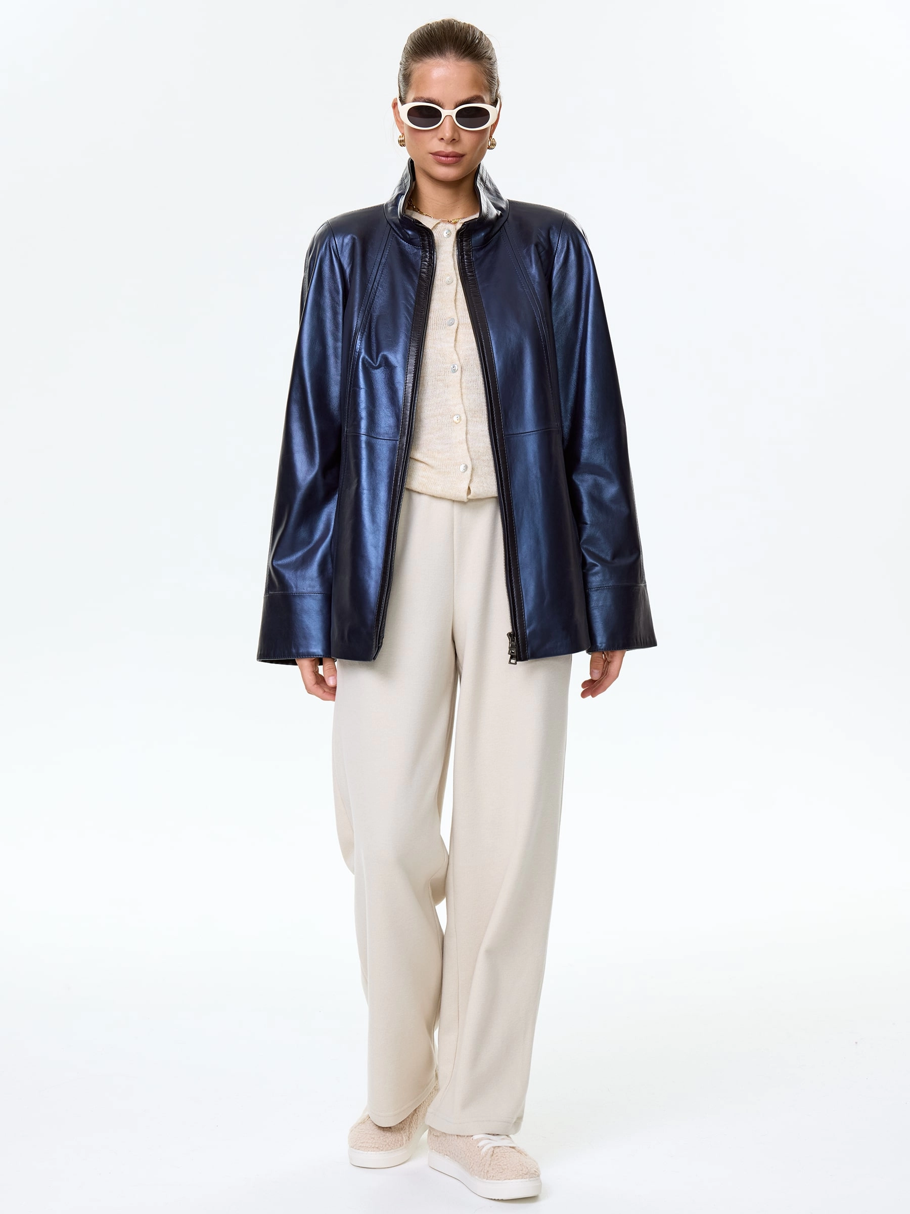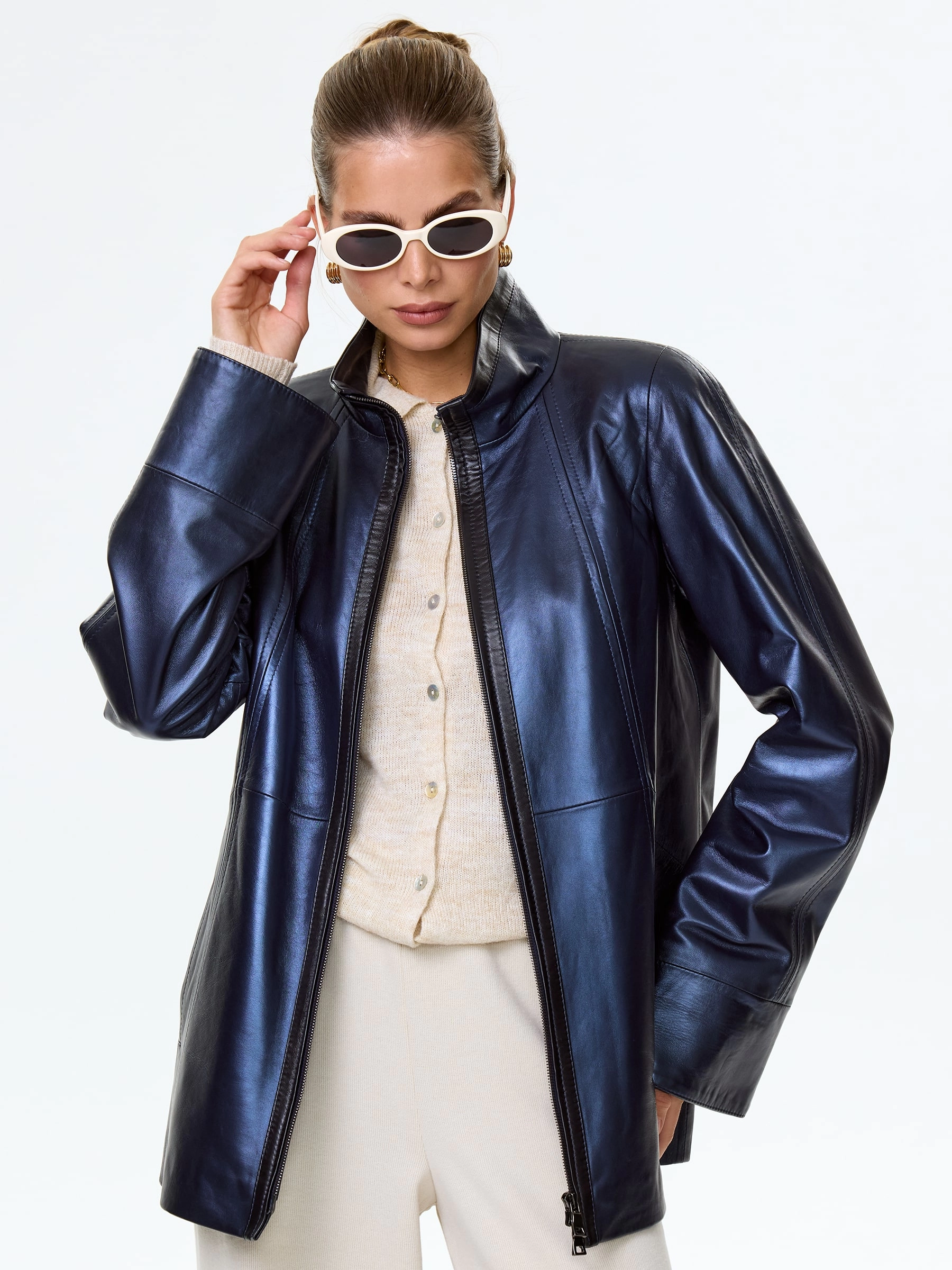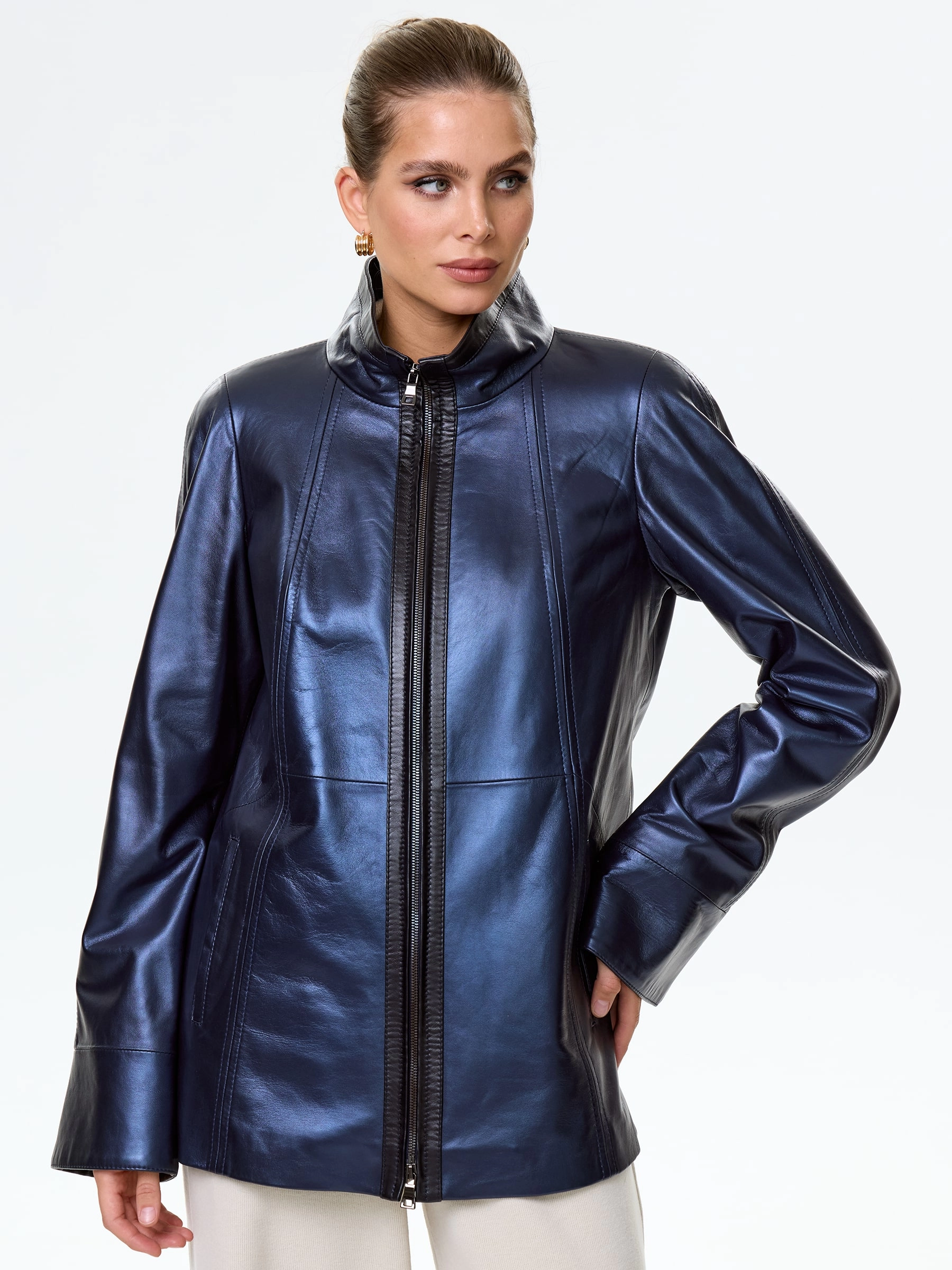 Куртку свободного кроя выполнили из гладкой однотонной кожи премиум класс. Удобный воротник-стойка, втачной рукав дополняет манжет. Комфортная посадка по фигуре. Изделие с двумя боковыми карманами застегивается двухзамковой молнией.