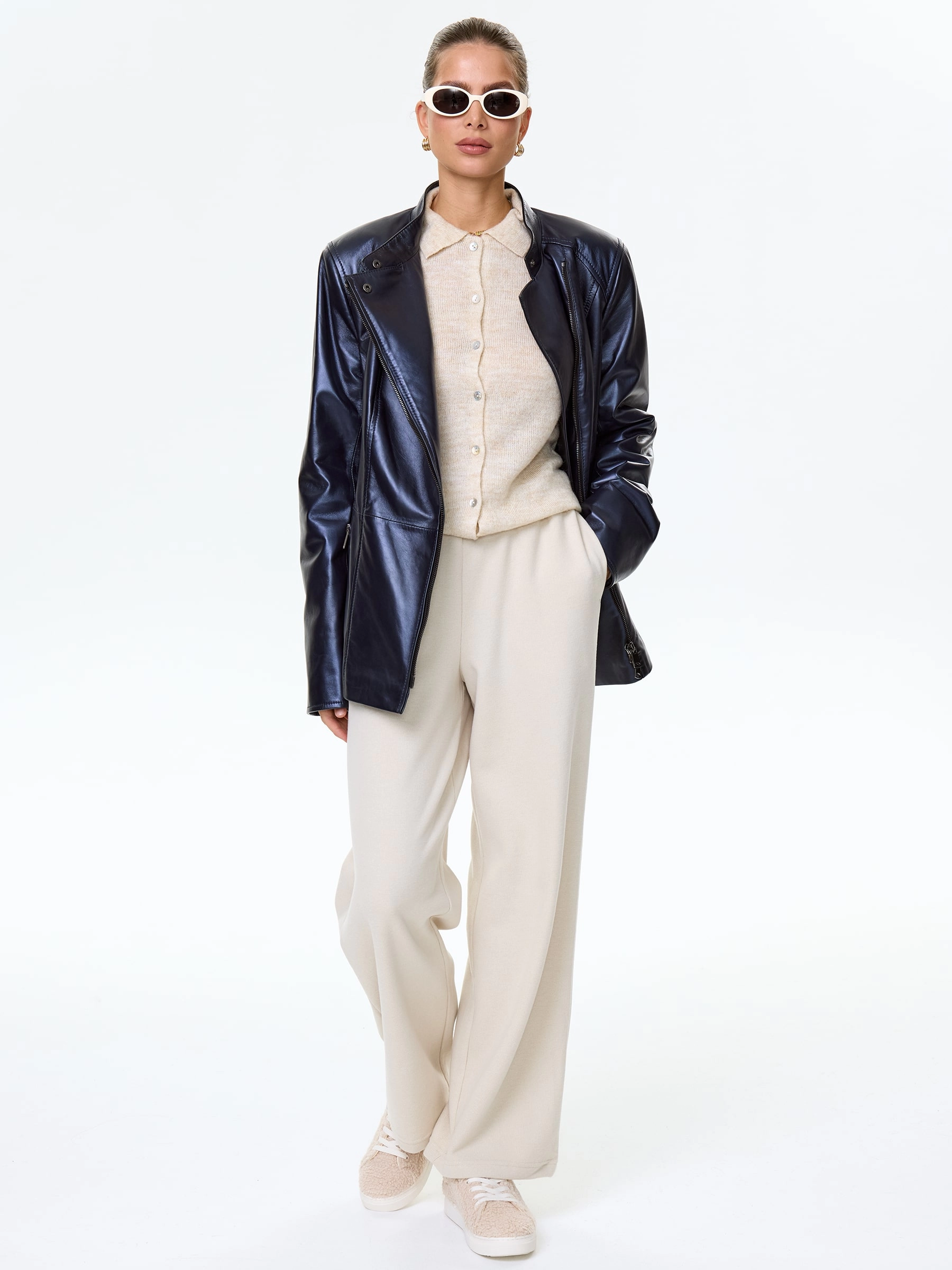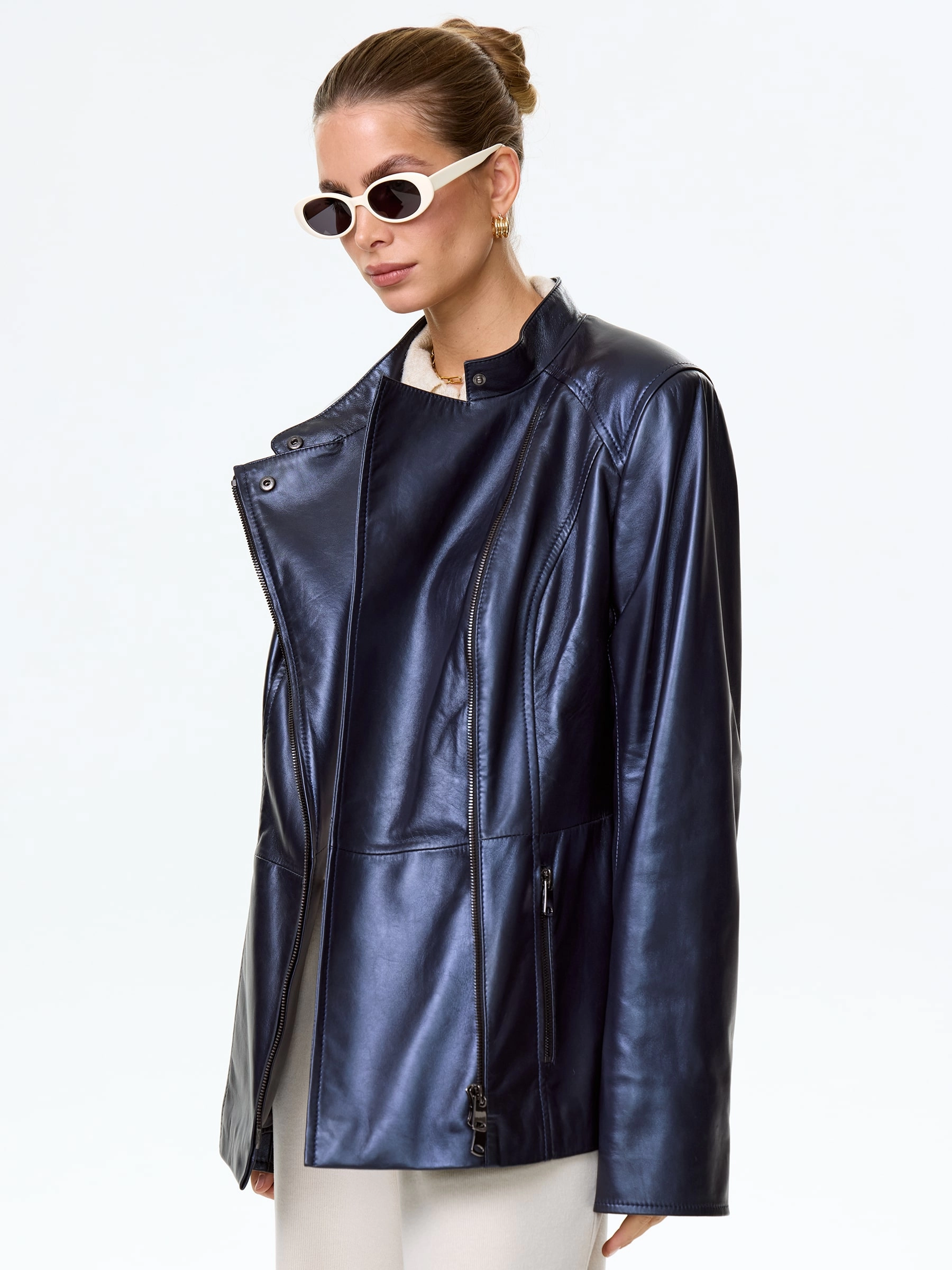 Товар женская кожаная куртка косуха 320(нв), синяя, размер 48, артикул 90700 выполнен из натуральной кожи с застежкой молния. Рассчитан на сезон: весна-лето. Длина изделия 67 см, силуэт полуприлегающий.