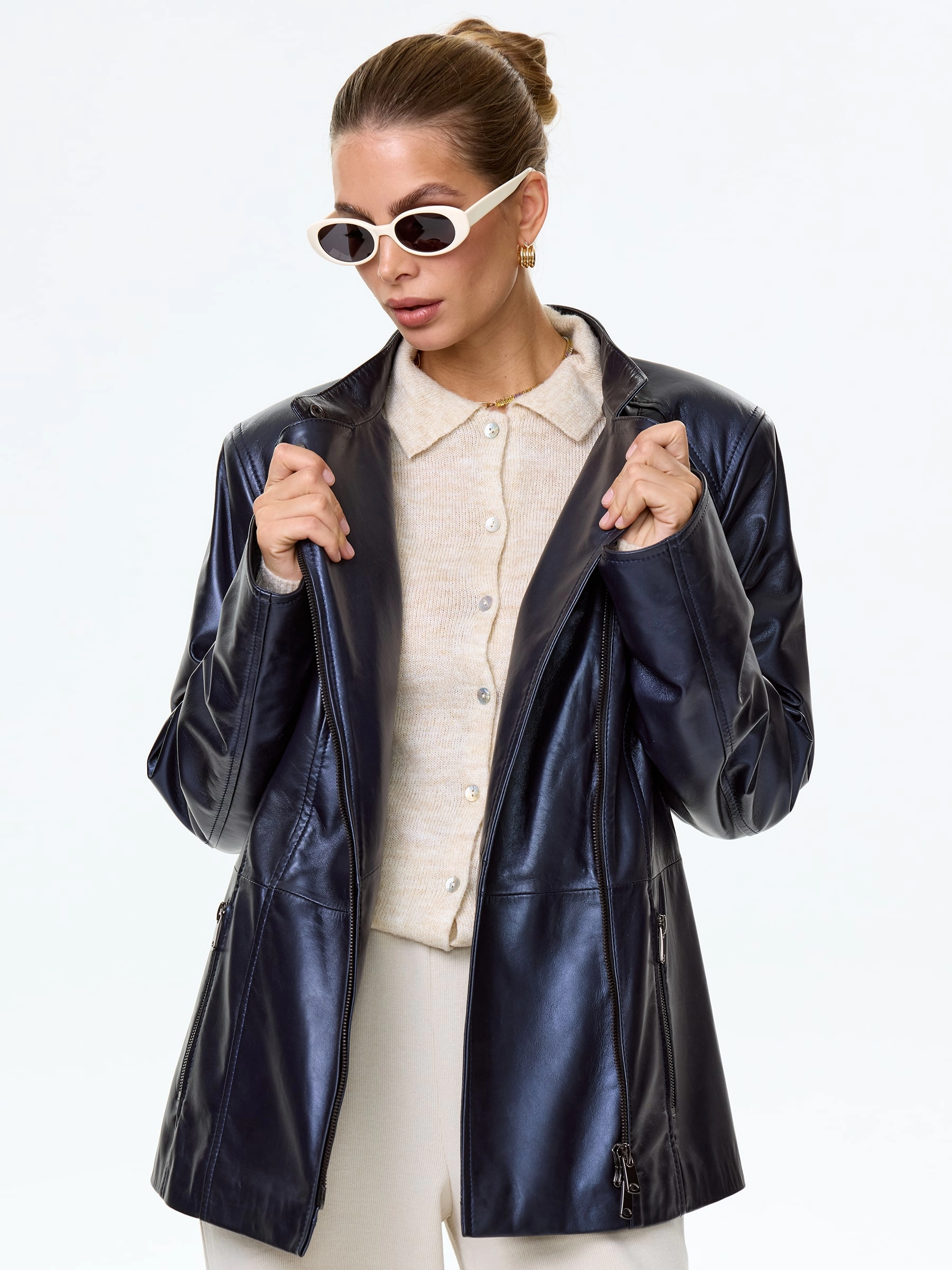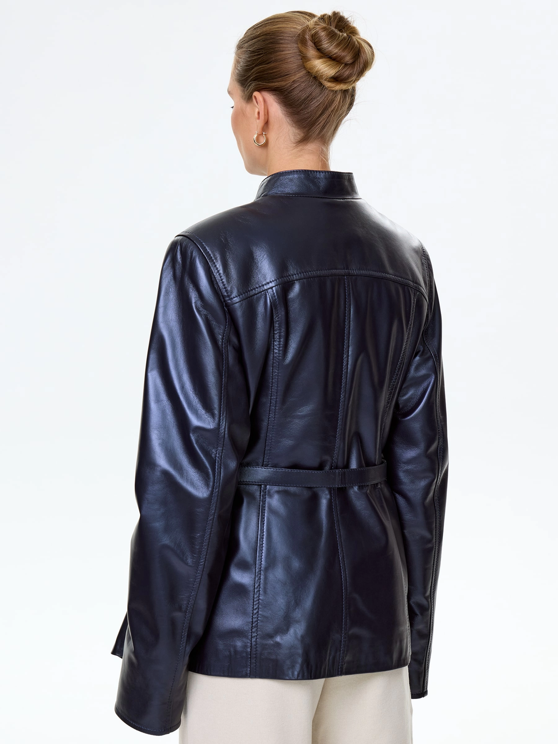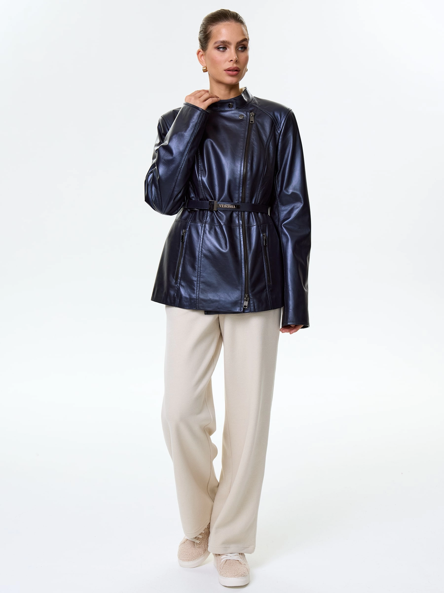 Современная кожаная куртка-косуха. Натуральная овечья кожа премиального качества. Воротник-стойка. Итальянские застёжки-молнии с полированным зубом. Кожаный пояс прилагается. Безупречная работа наших портных. Чёткая посадка по фигуре.