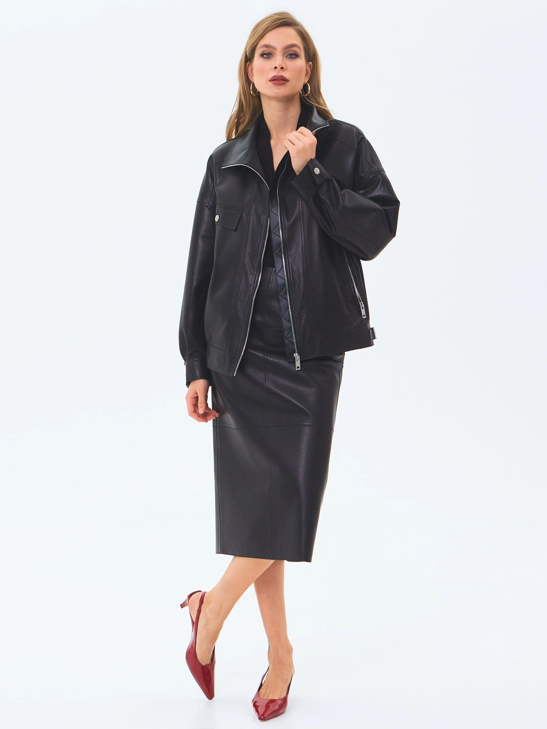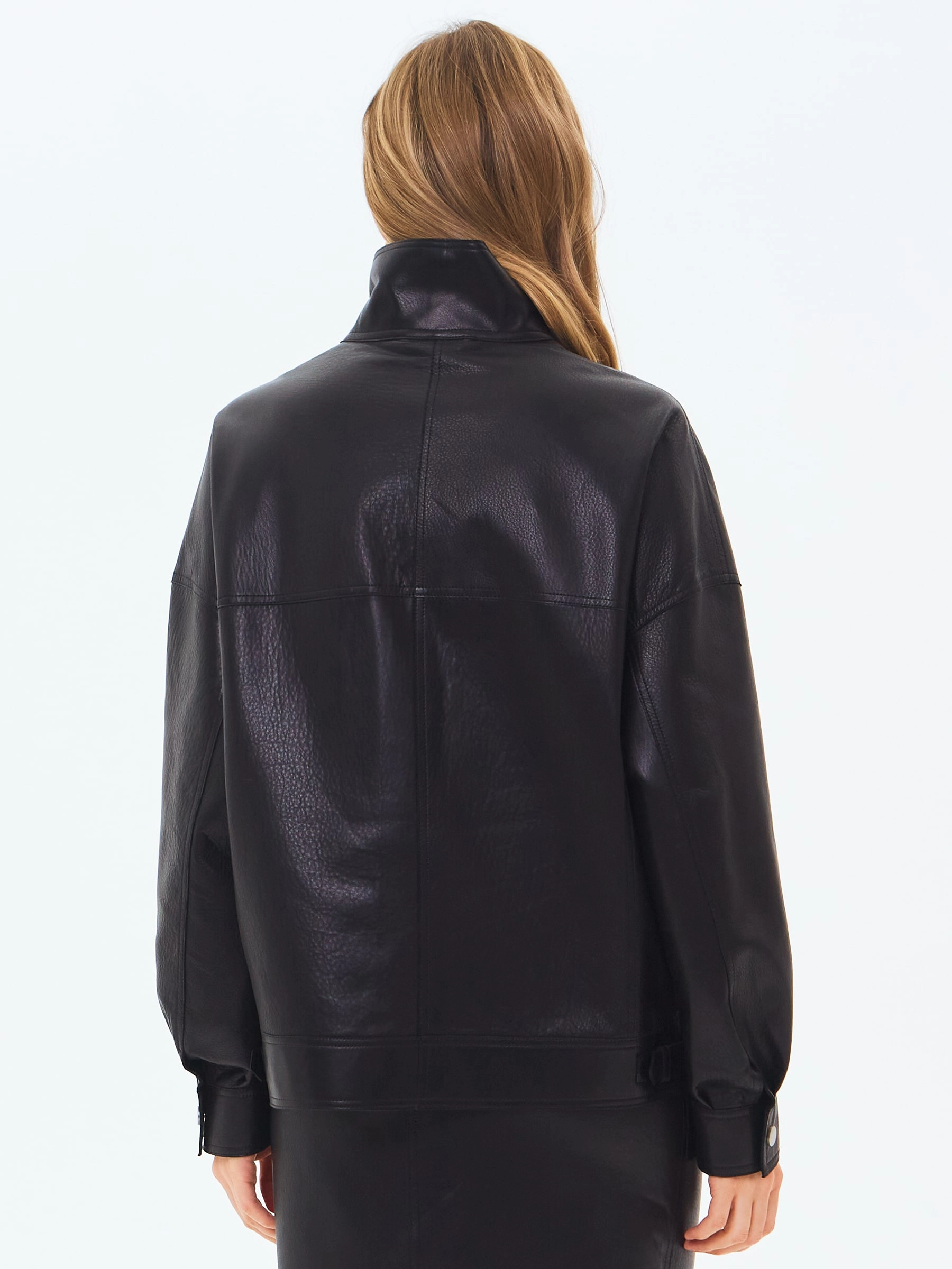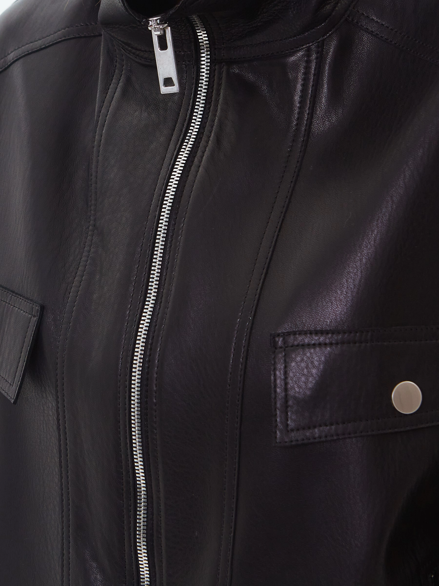 Куртку прямого кроя со спущенной линией плеча выполнили из мелкозернистой кожи премиум класса. На поясе изделия предусмотрены регулируемые боковые паты. Модель без подклада с врезными карманами застегивается крупной молнией.