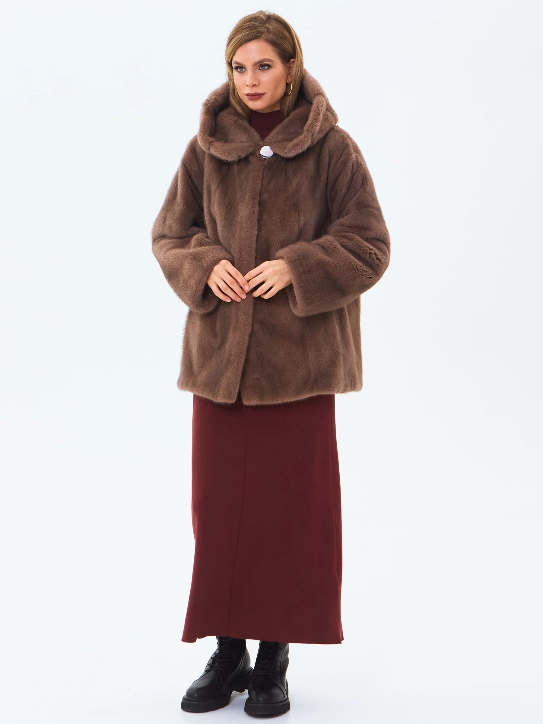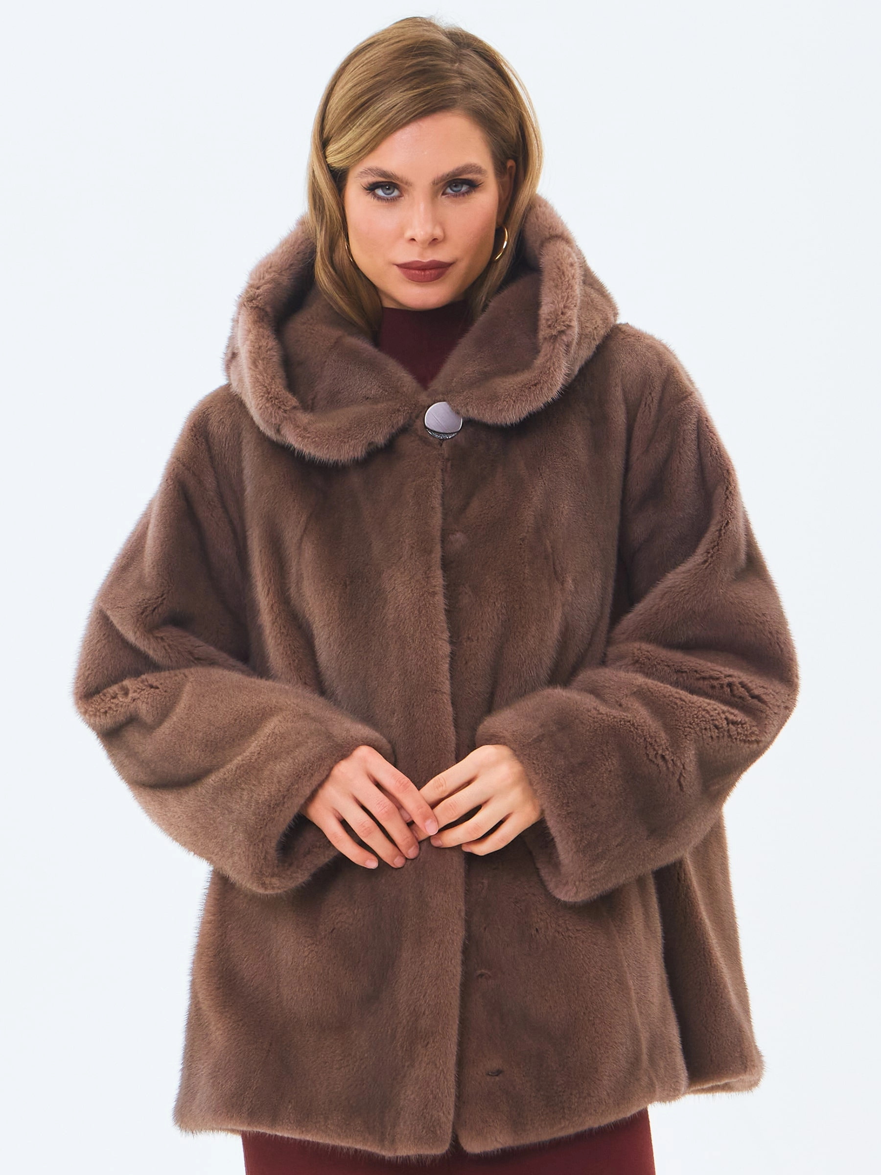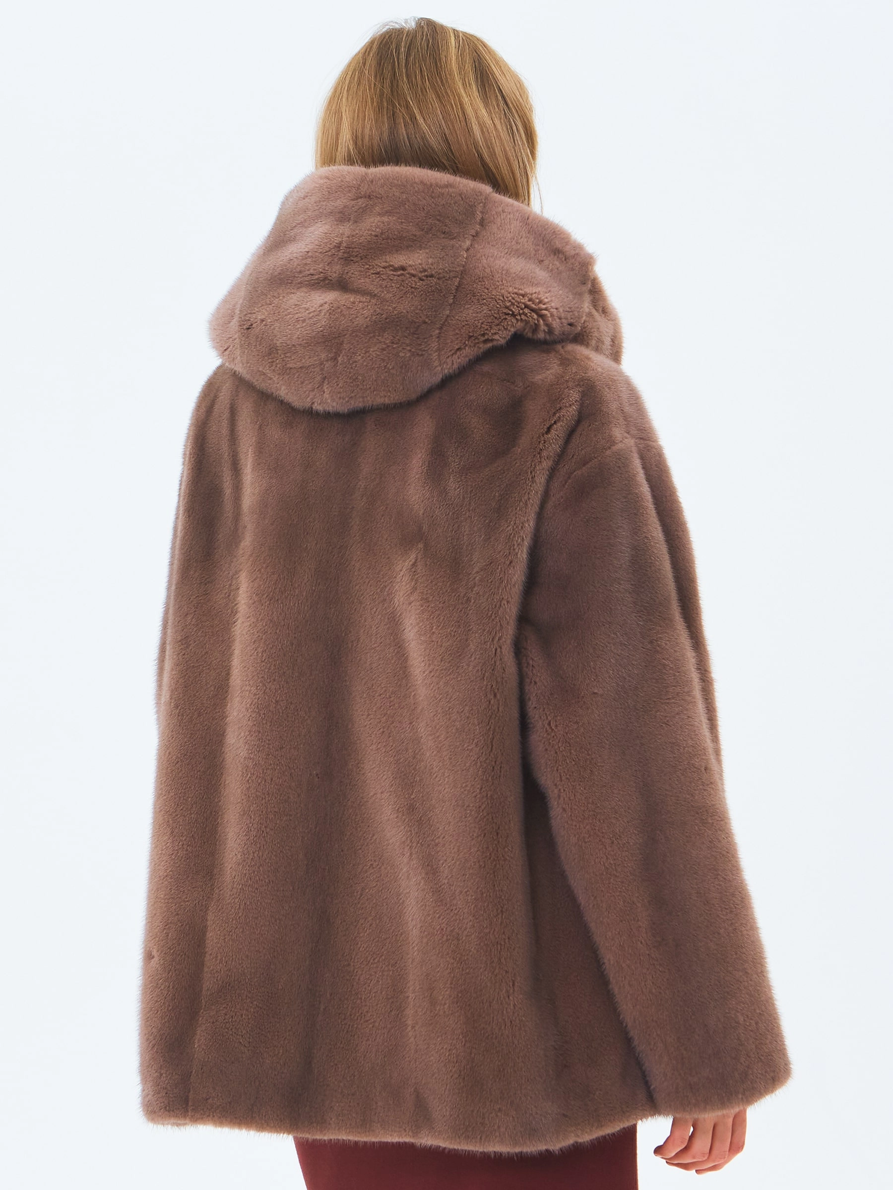 Короткую шубу с объемным капюшоном и спущенной линией плеча выполнили из густого нежного меха норки. Свободная модель с двумя врезными боковыми карманами застегивается металлическими клипсами.