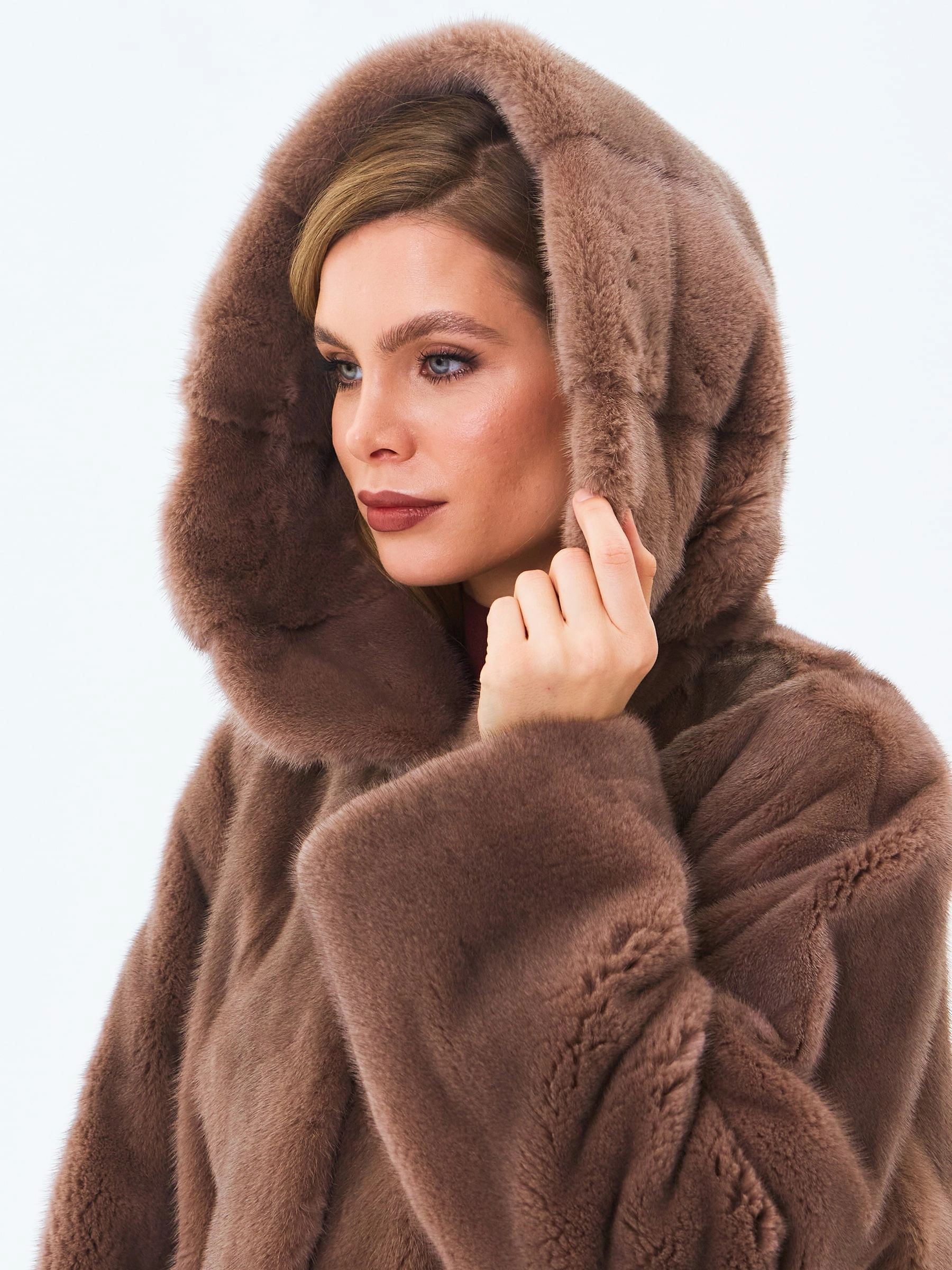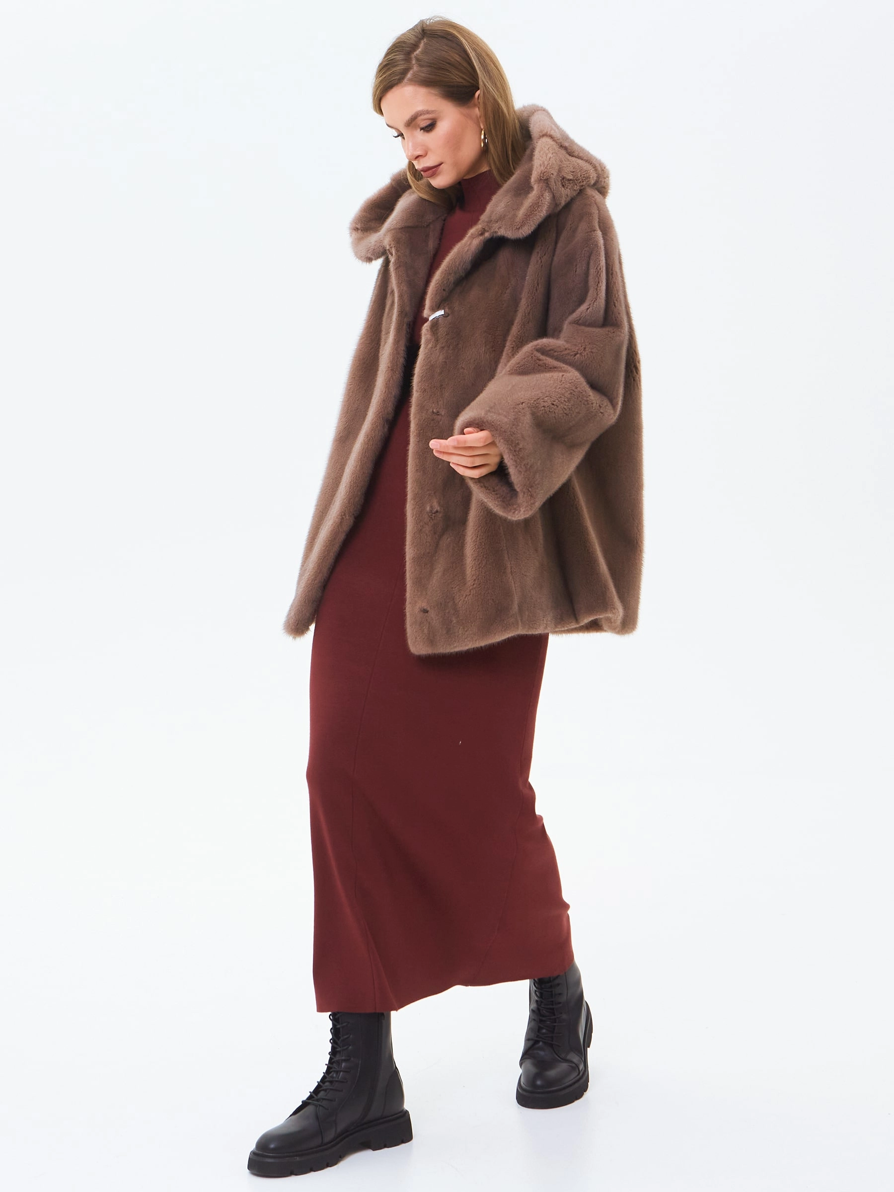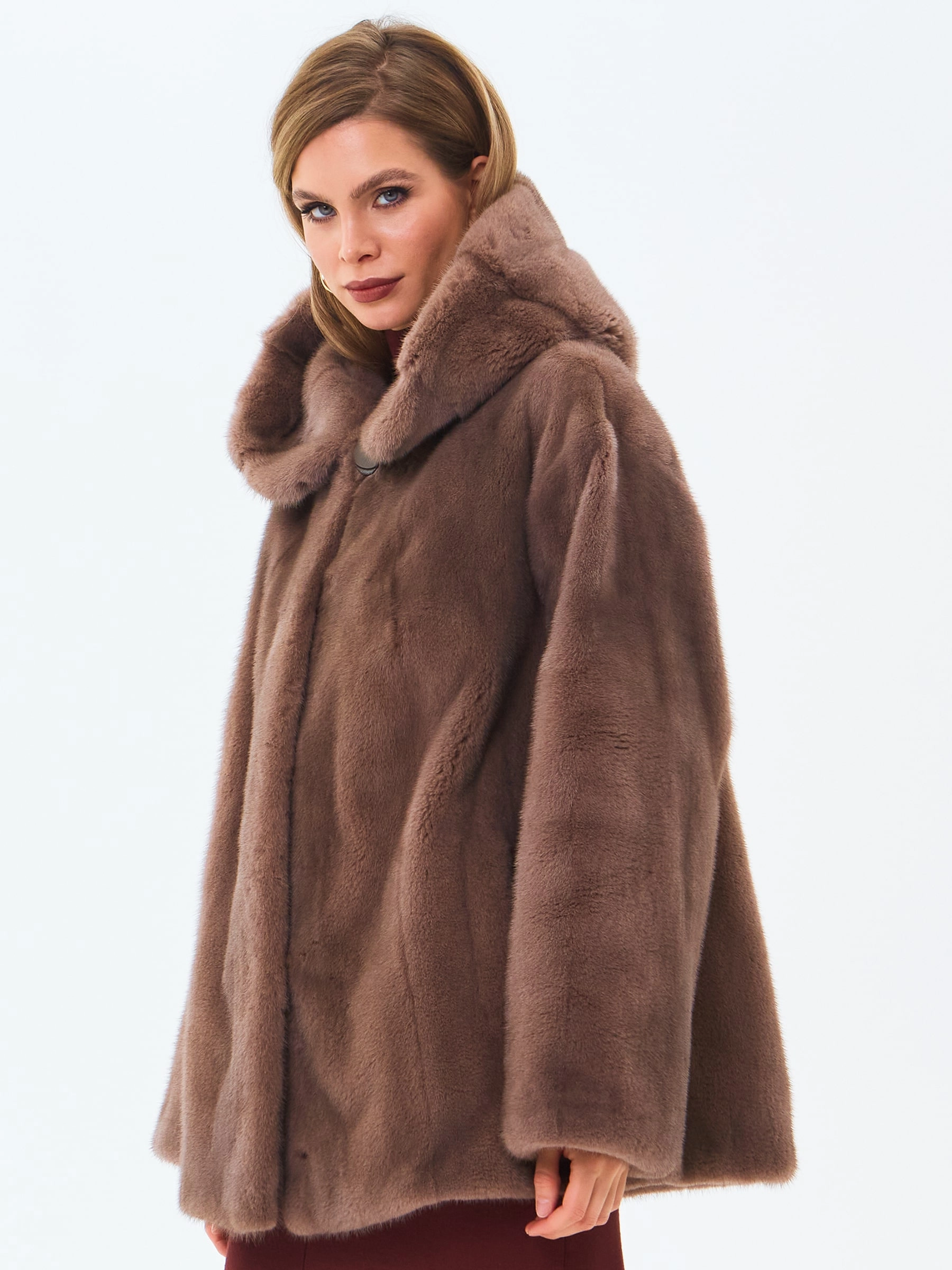 Короткую шубу с объемным капюшоном и спущенной линией плеча выполнили из густого нежного меха норки. Свободная модель с двумя врезными боковыми карманами застегивается металлическими клипсами.