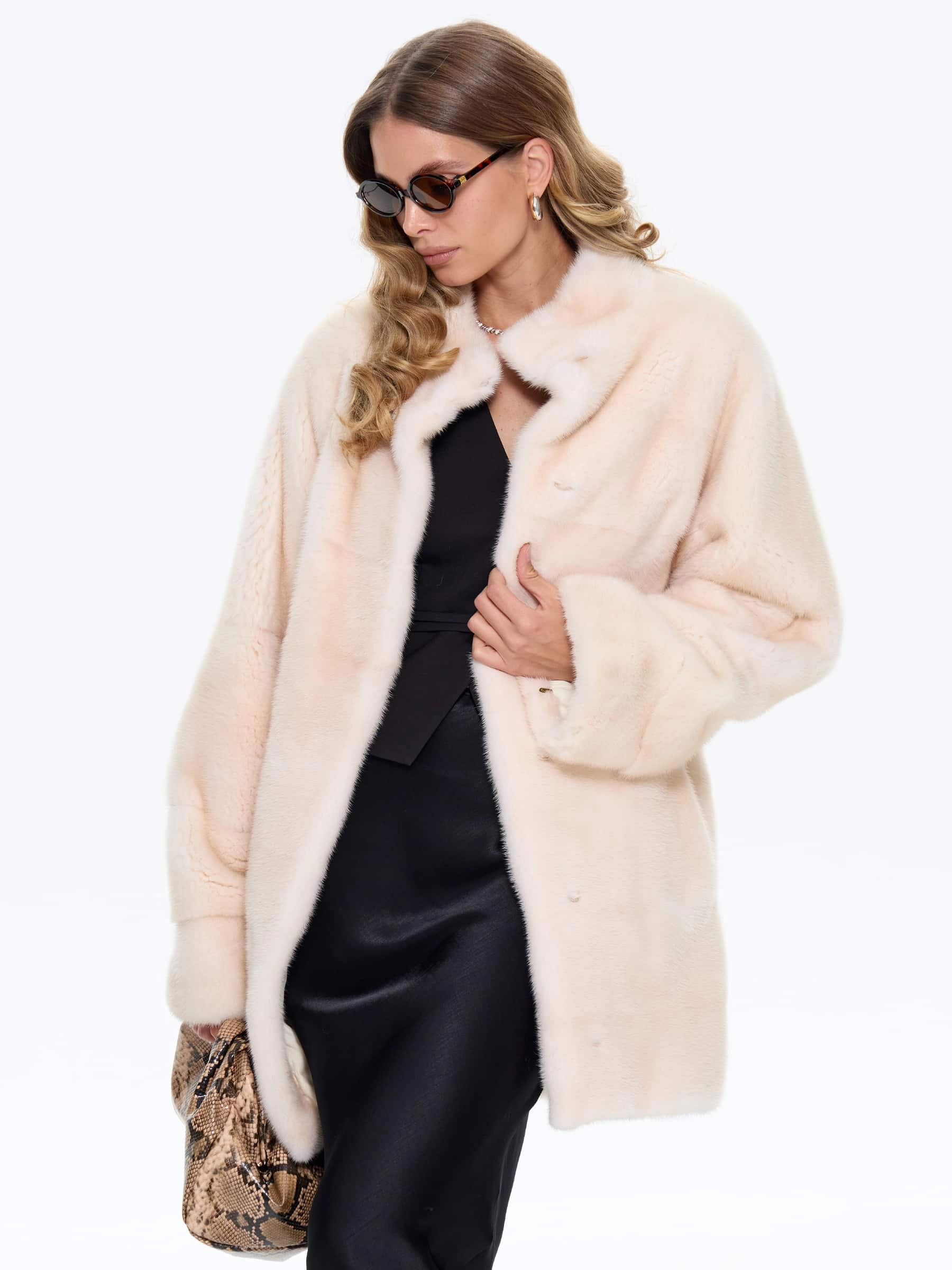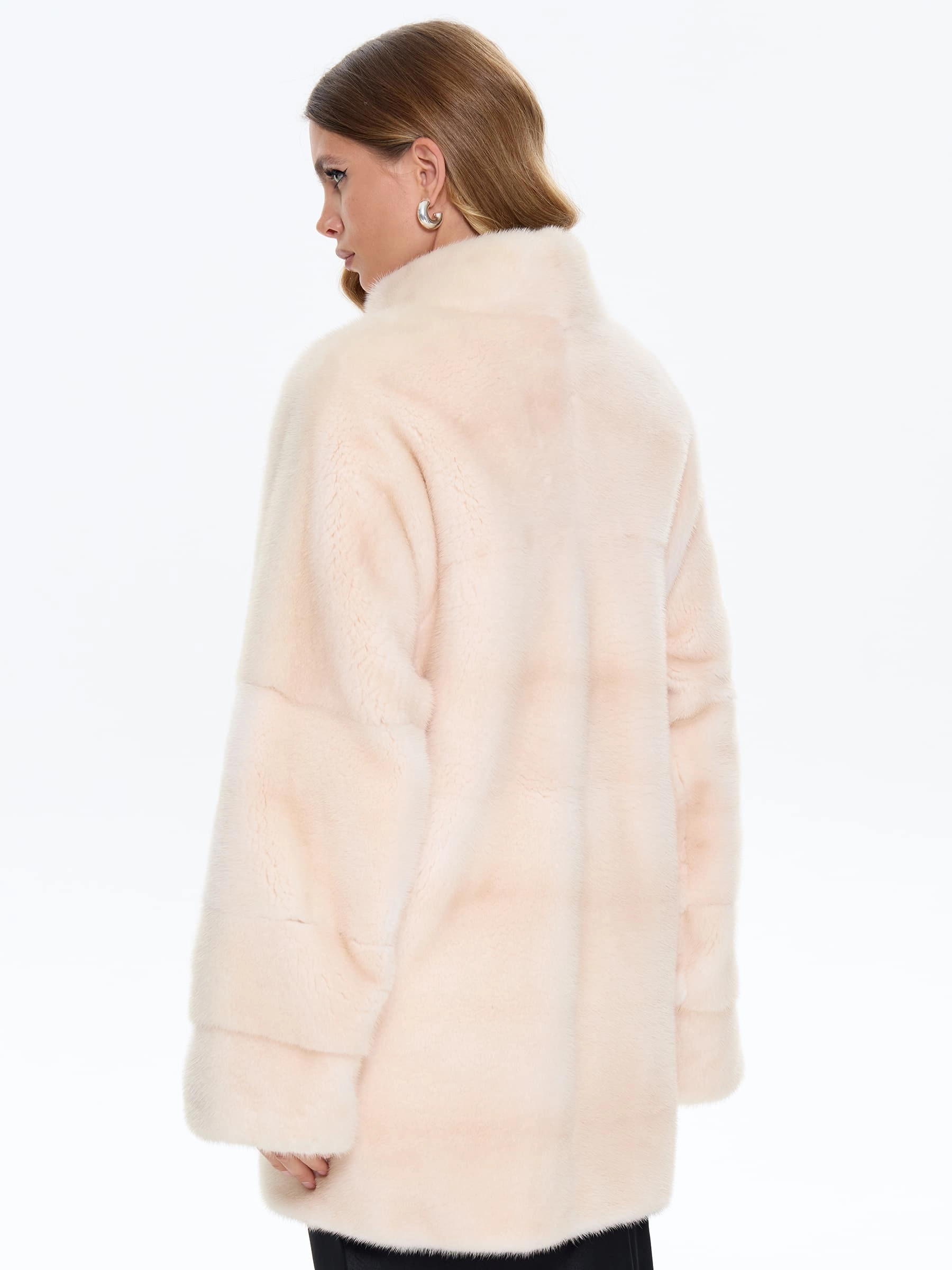 Шуба прямого кроя BRASCHI из густого меха бежевой натуральной норки в поперечной раскладке создает эластичное полотно с выразительной полосатой текстурой. Спущенные рукава с мягкой линией плеч обеспечивают свободу движений, а универсальная длина до середины бедра сочетает тепло и легкость. Практичный воротник-стойка защищает от ветра, а застежка на клипсах сохраняет мех в идеальном состоянии. Идеальный выбор для активных горожанок, ценящих комфорт и стиль.