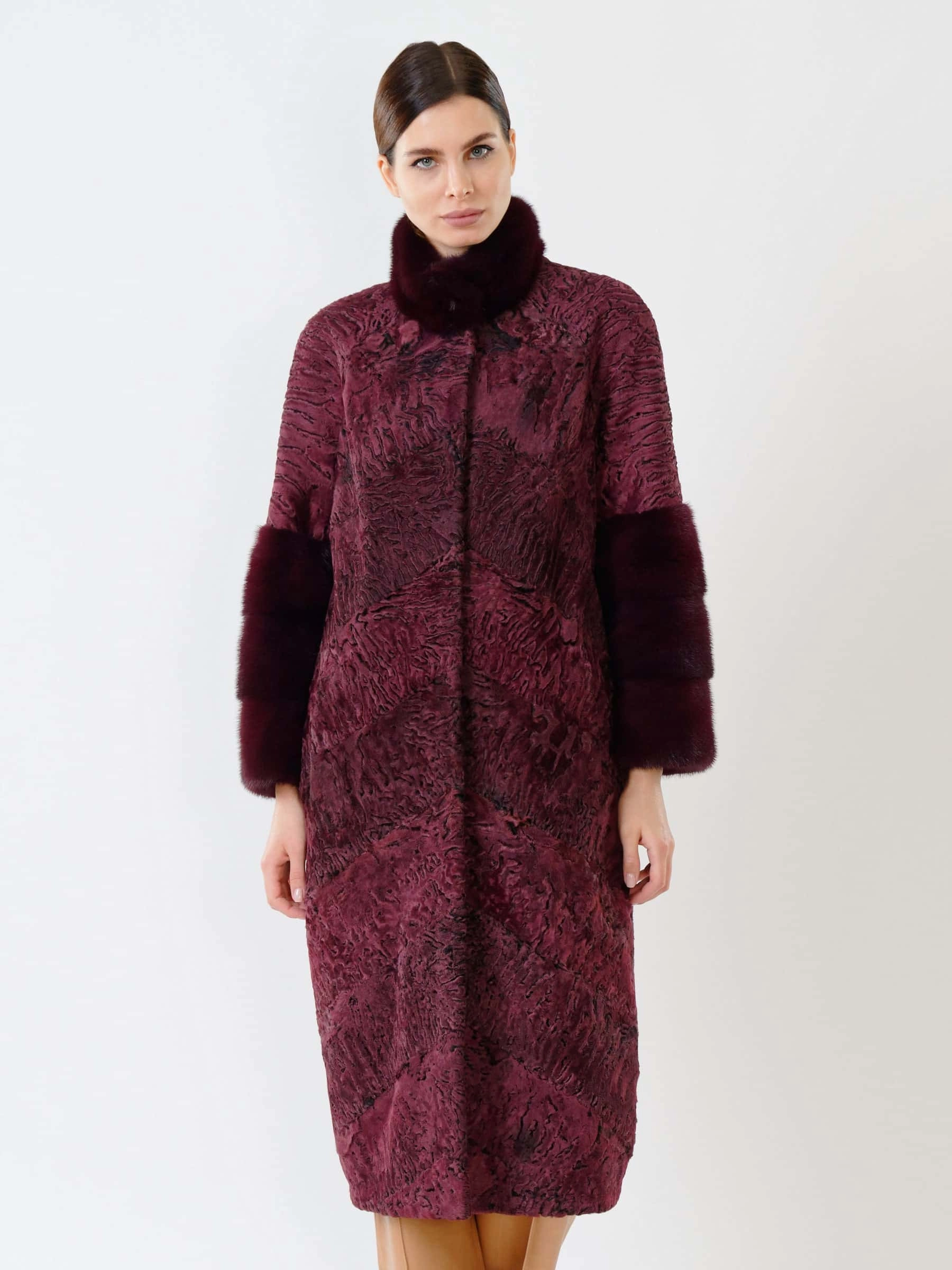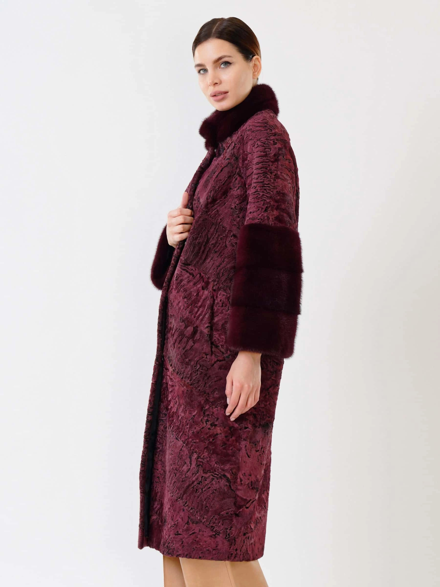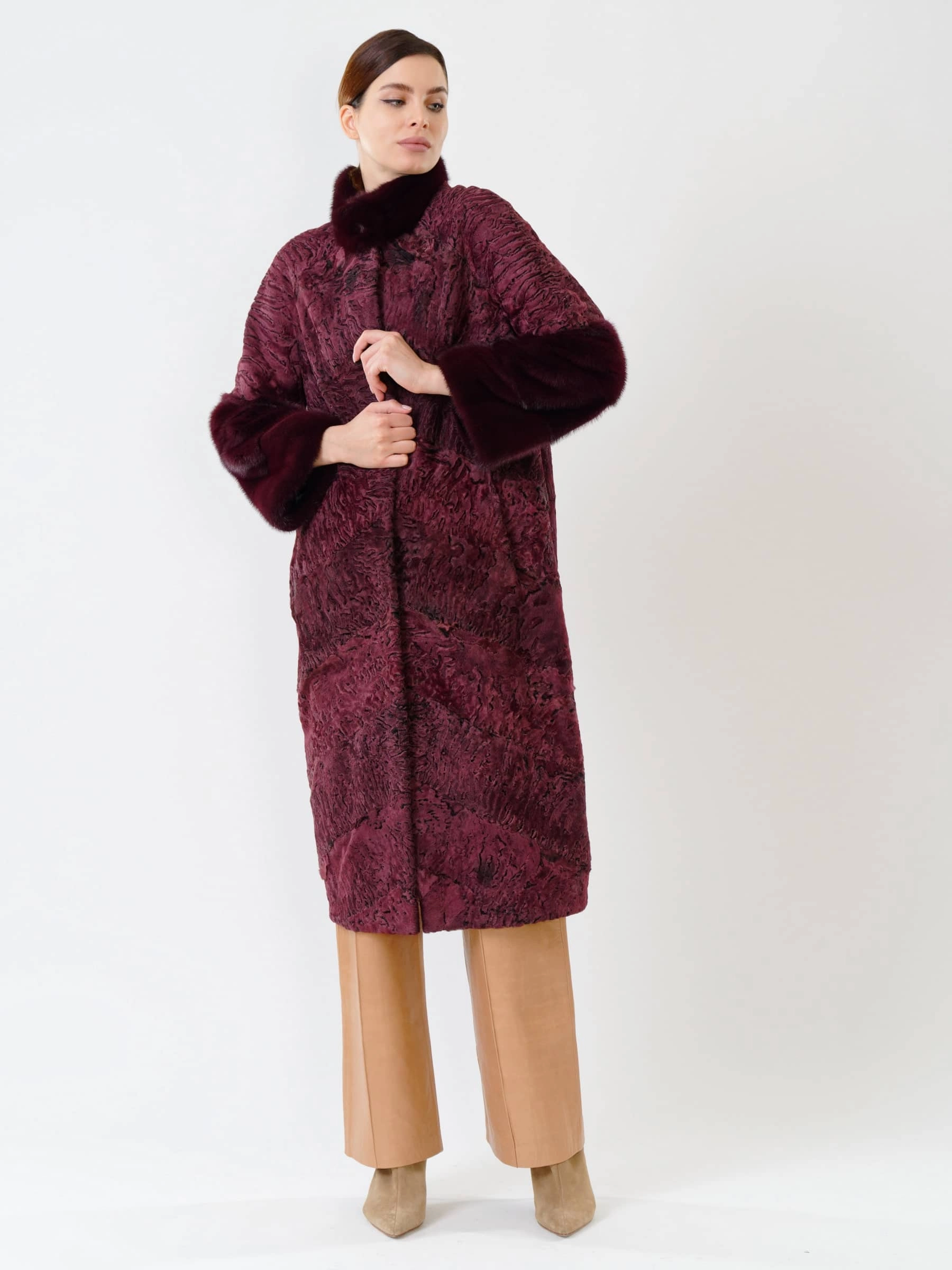 Товар женская шуба из меха каракуля с мехом норки 17101д(сн), бордовая, размер 44, артикул 22620 выполнен из мех каракуля с застежкой клипсы. Рассчитан на сезон: осень-зима. Длина изделия свыше 90 см, силуэт прямой.