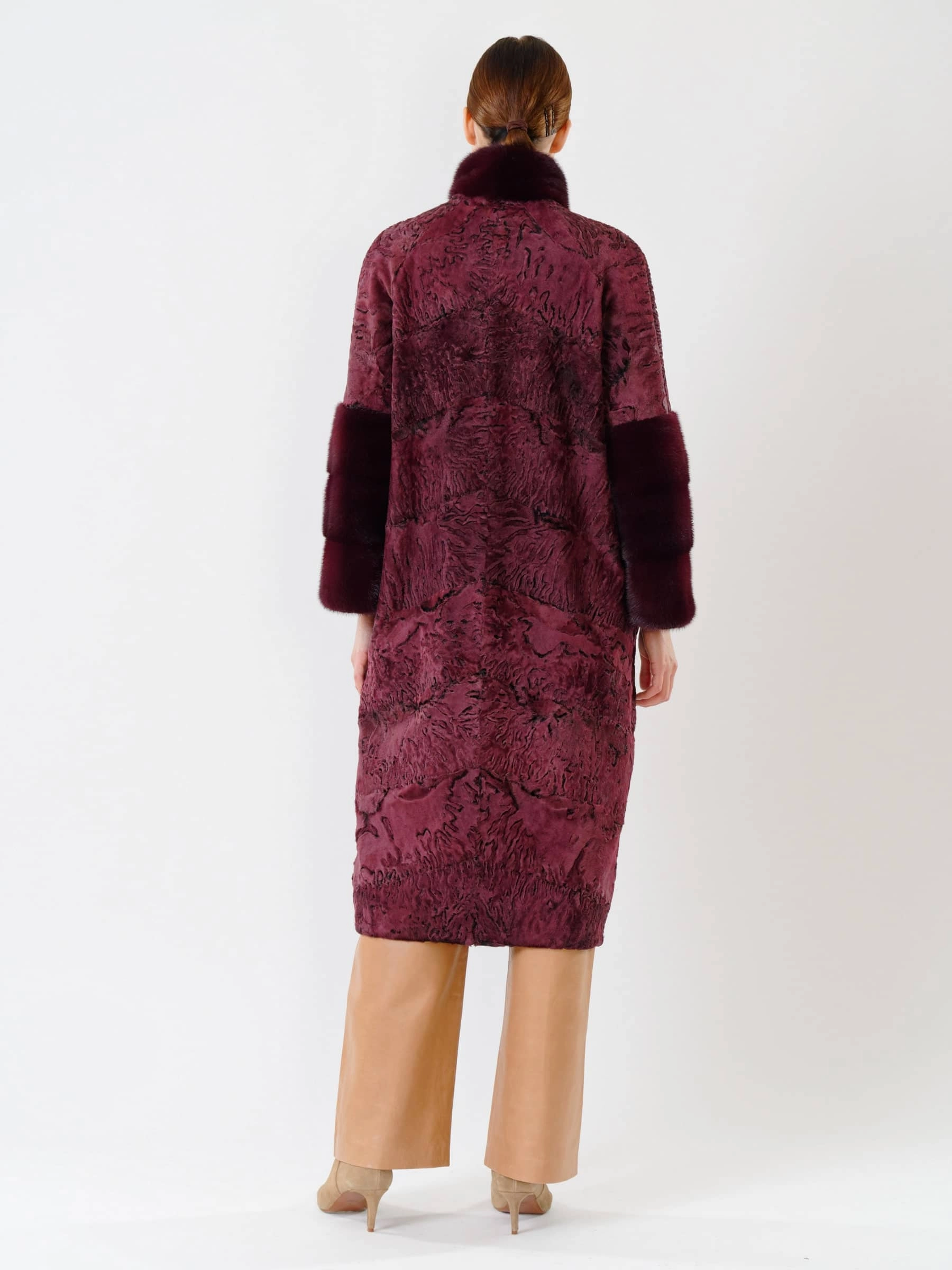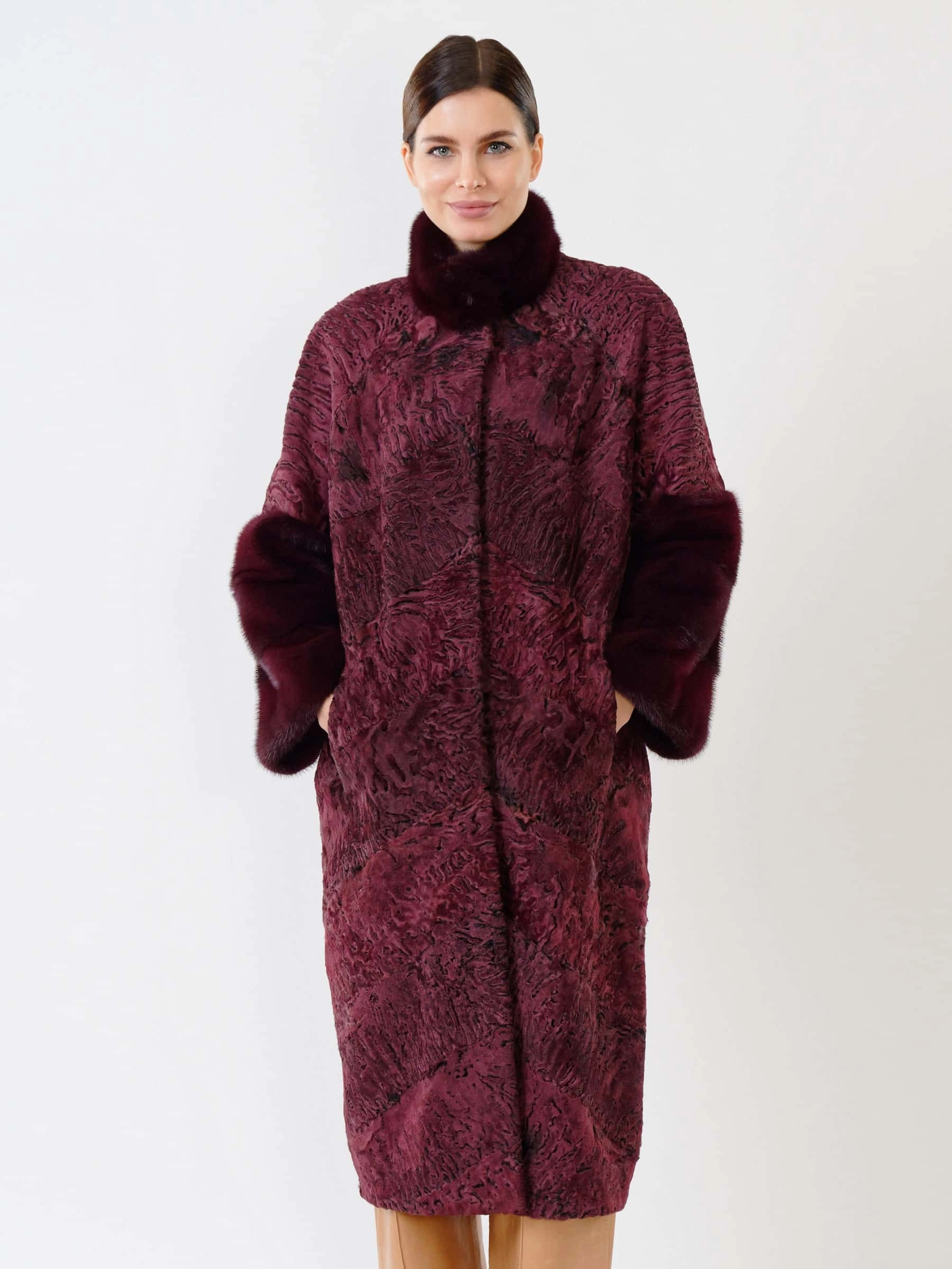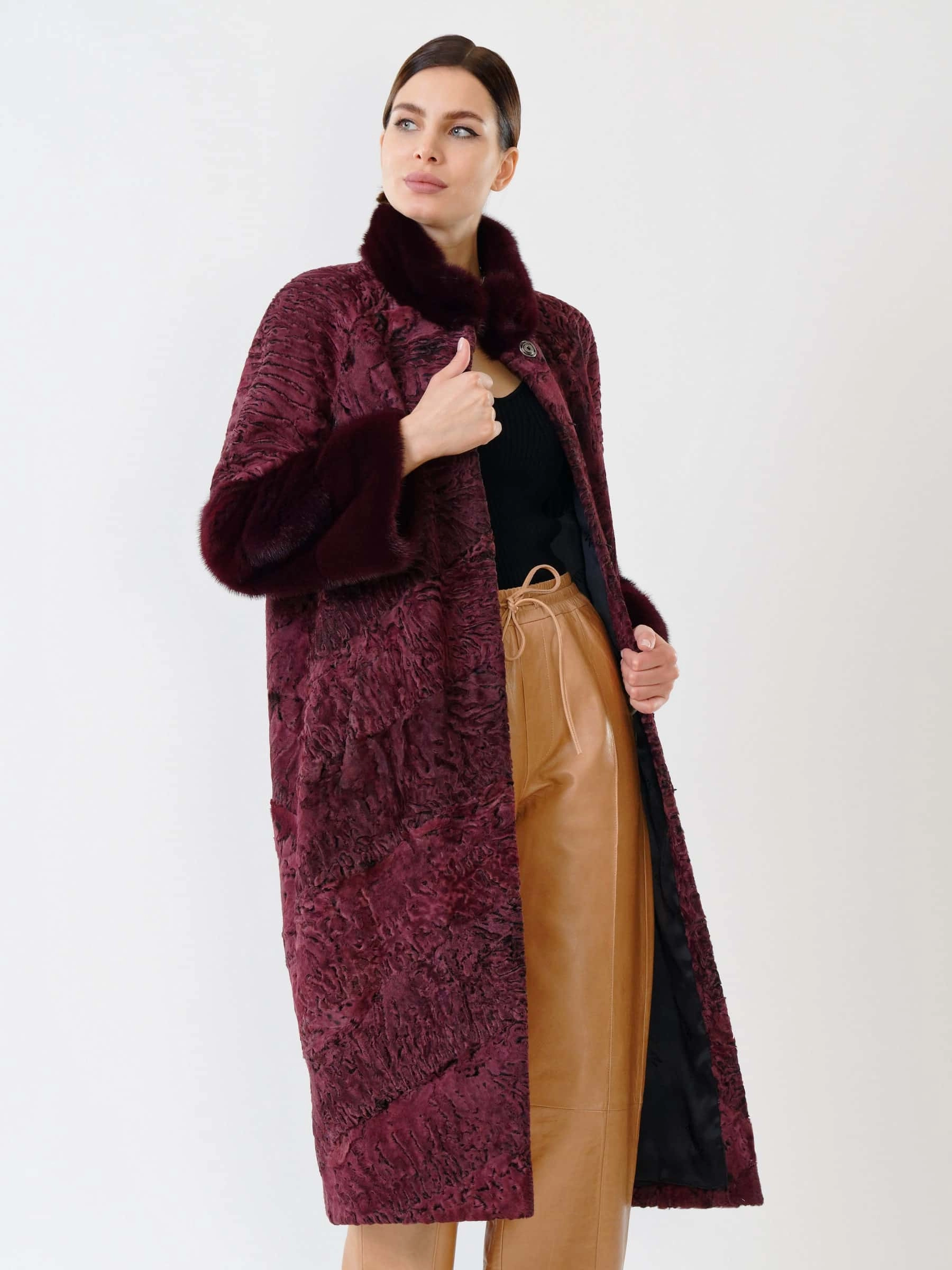 Товар женская шуба из меха каракуля с мехом норки 17101д(сн), бордовая, размер 44, артикул 22620 выполнен из мех каракуля с застежкой клипсы. Рассчитан на сезон: осень-зима. Длина изделия свыше 90 см, силуэт прямой.