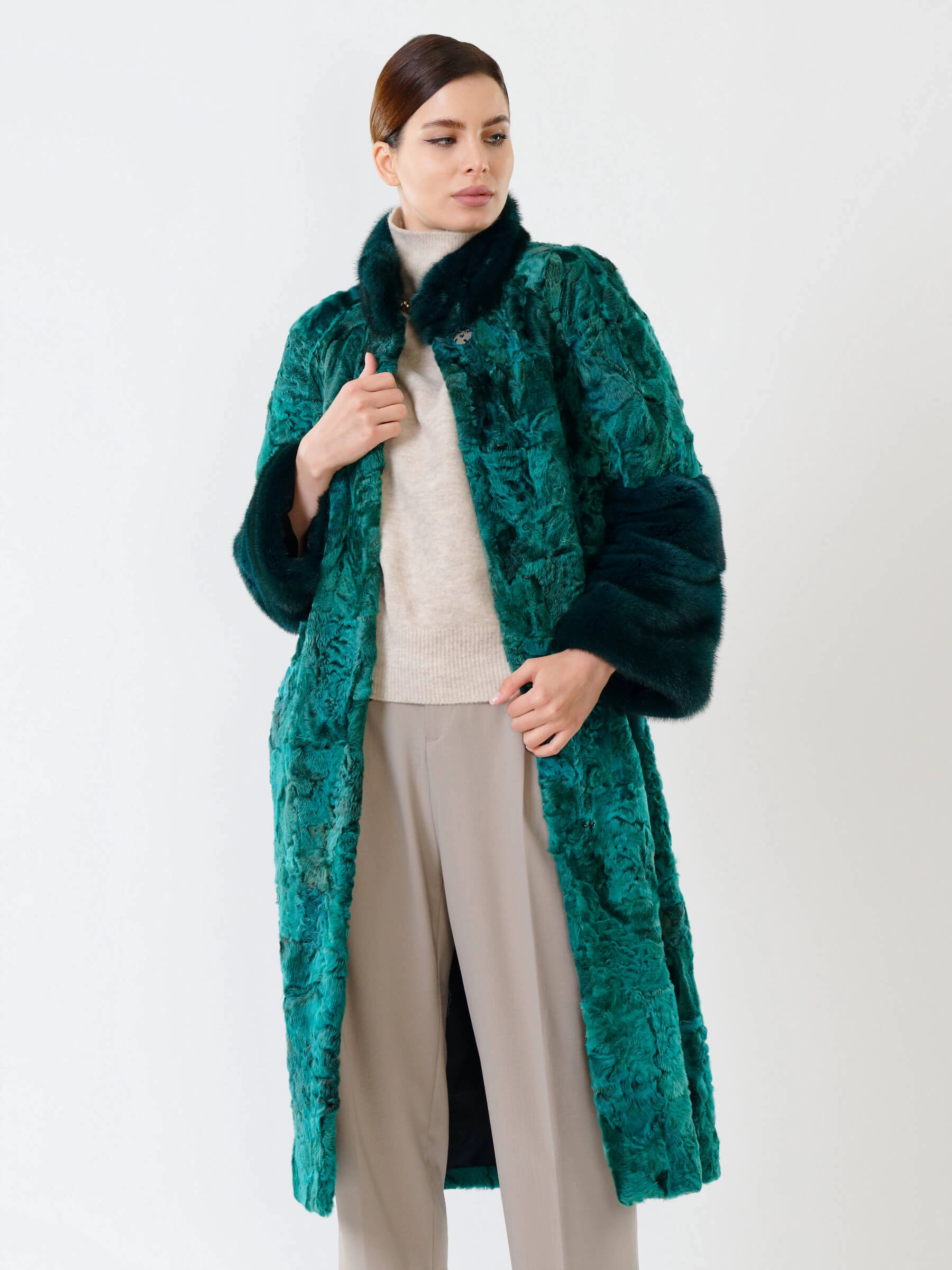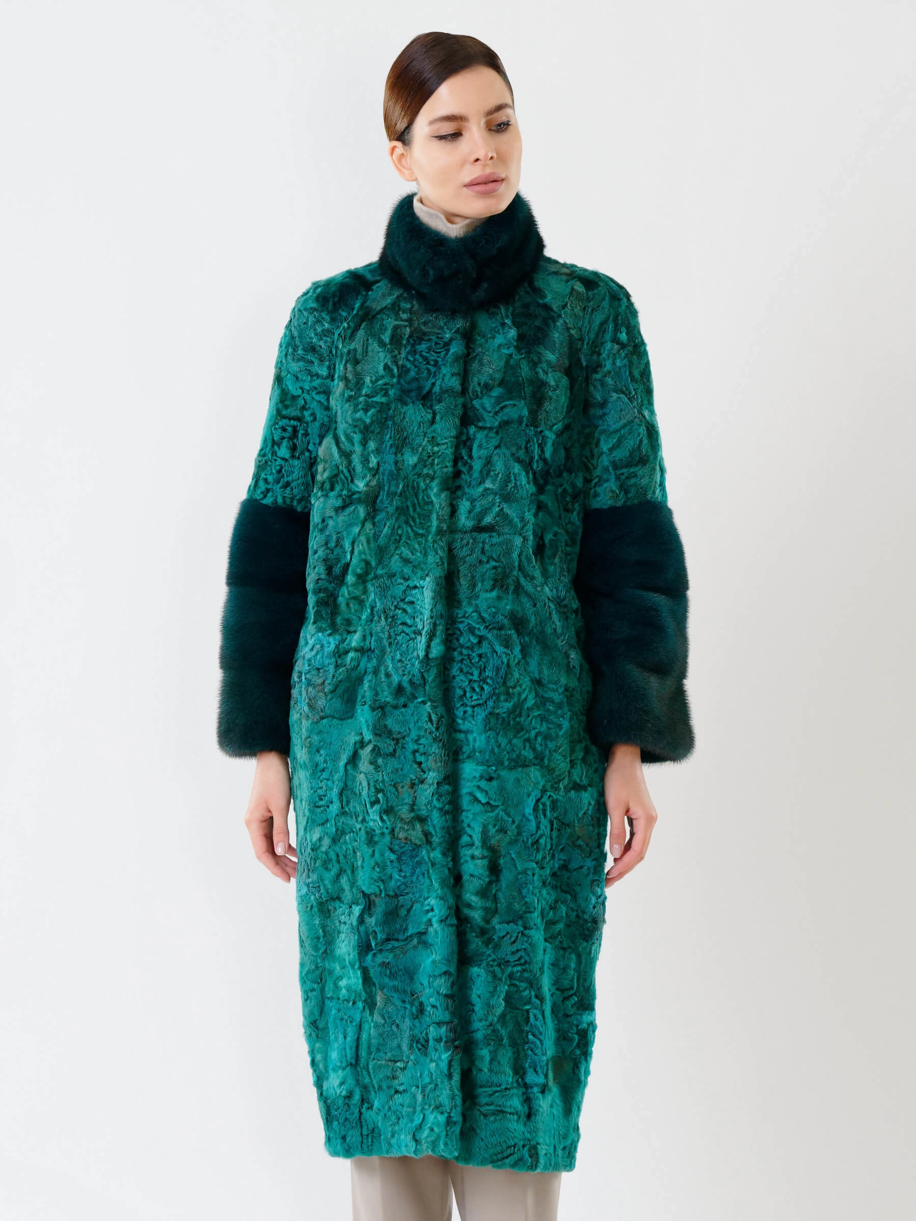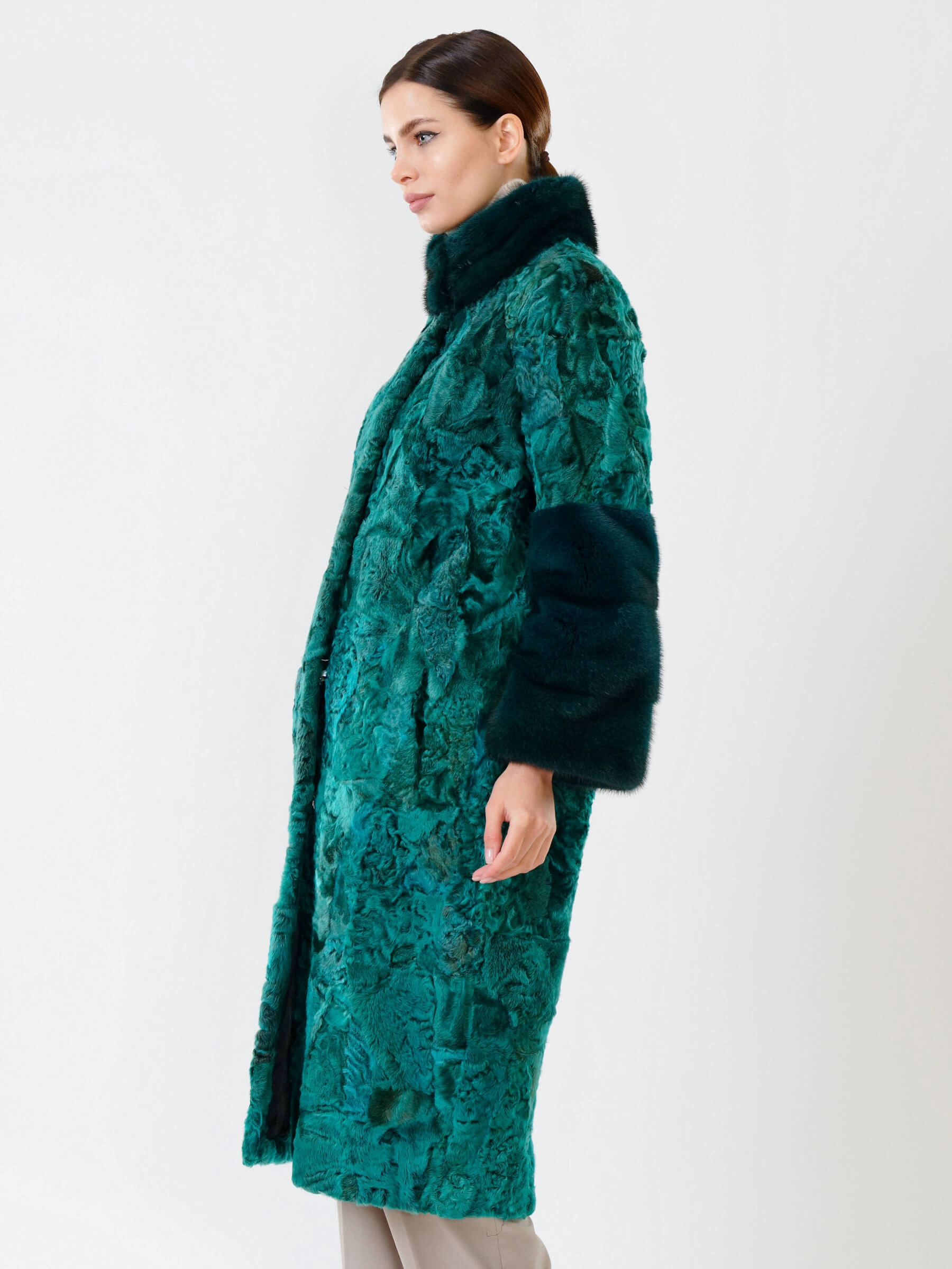 Товар шуба женская из меха каракуля с норковым воротником 17101пл(сн), изумрудная, размер 44, артикул 22460 выполнен из мех каракуля с застежкой клипсы. Рассчитан на сезон: осень-зима. Длина изделия свыше 90 см, силуэт прямой.