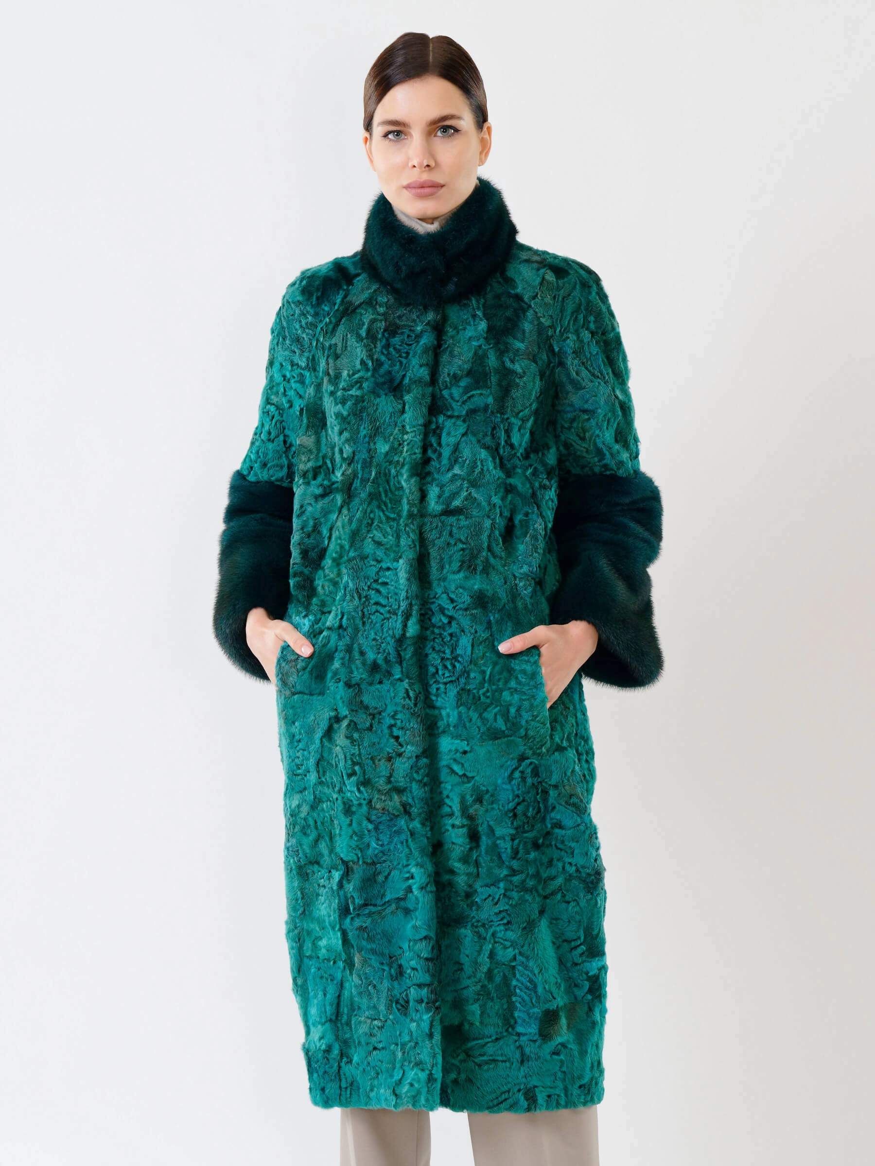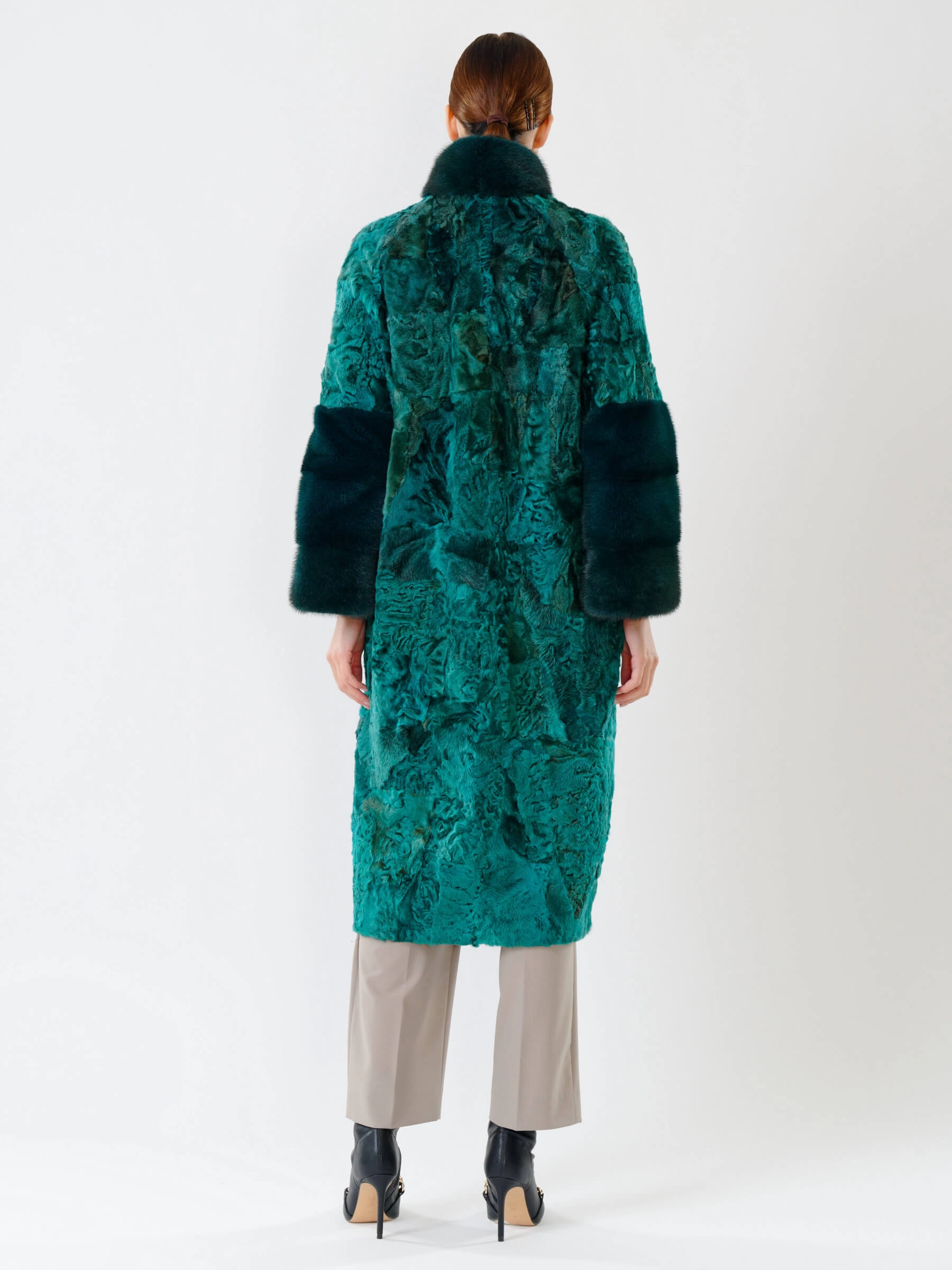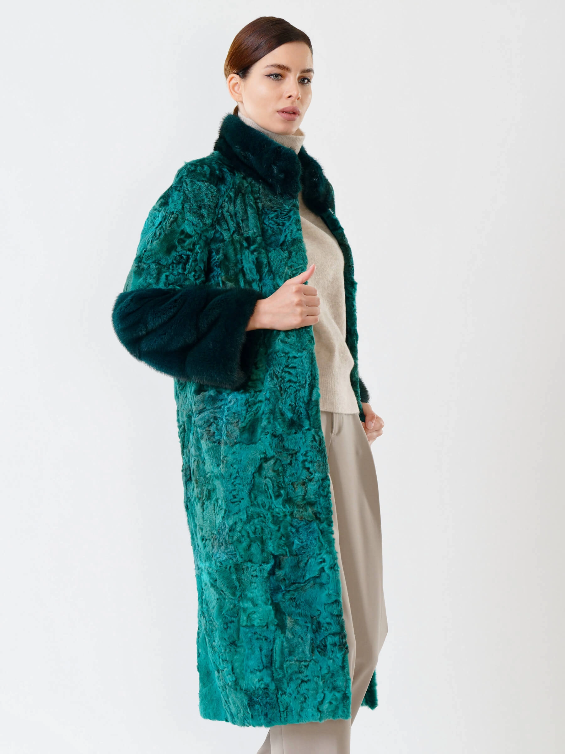 Товар шуба женская из меха каракуля с норковым воротником 17101пл(сн), изумрудная, размер 44, артикул 22460 выполнен из мех каракуля с застежкой клипсы. Рассчитан на сезон: осень-зима. Длина изделия свыше 90 см, силуэт прямой.
