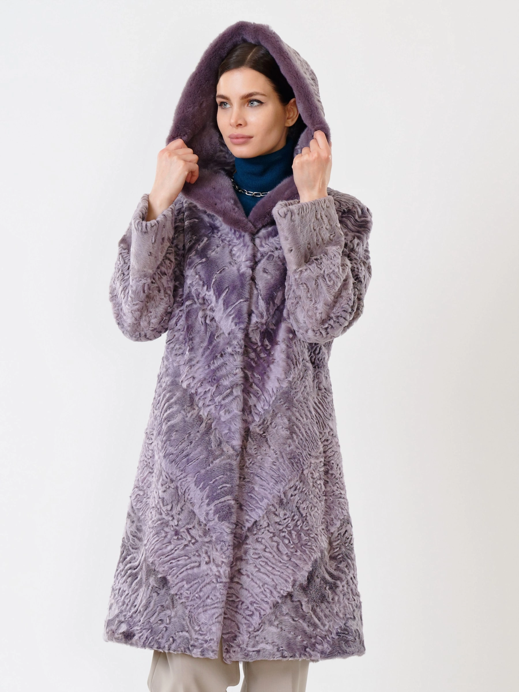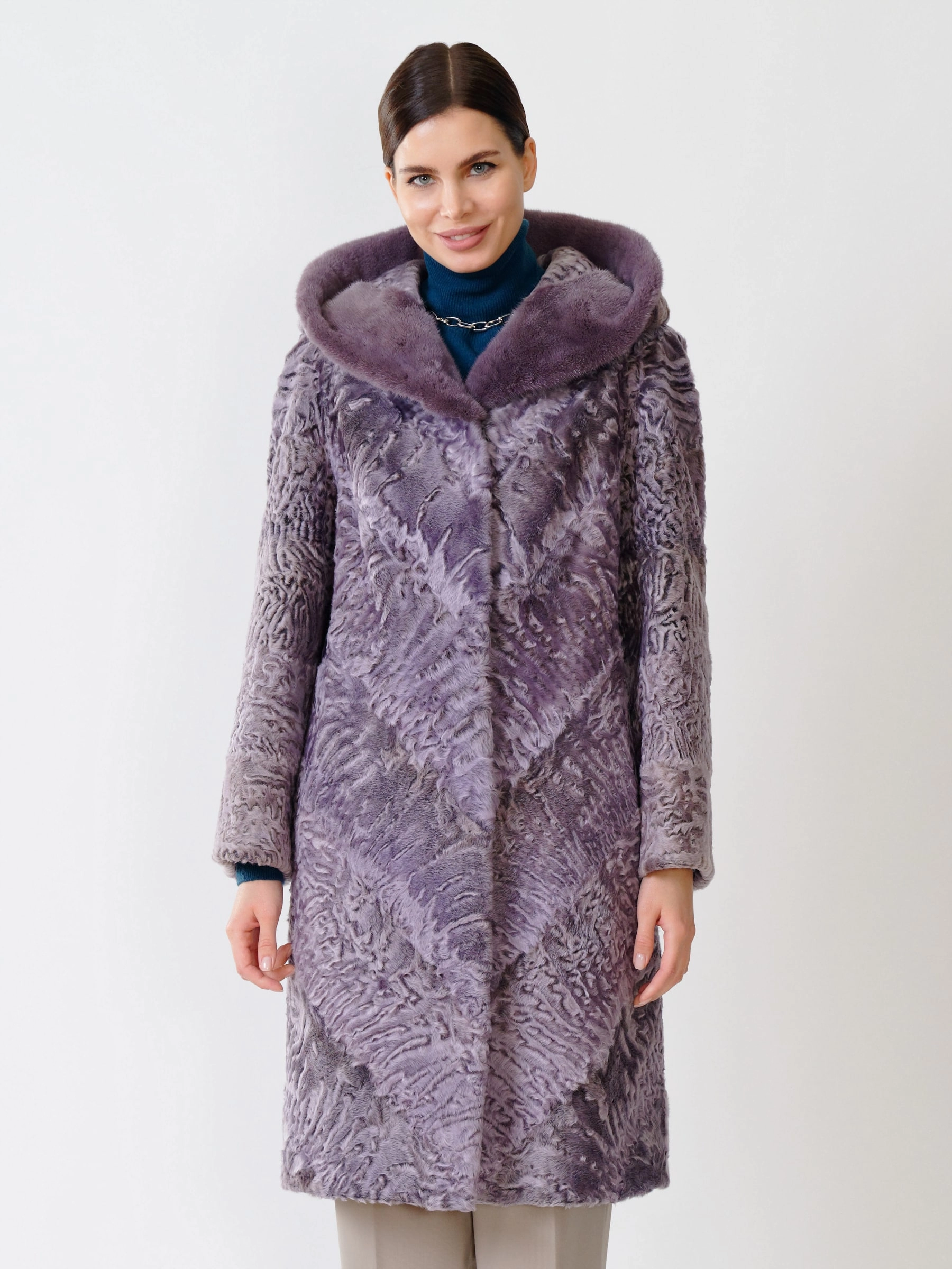 Товар каракулевая женская шуба с капюшоном и мехом норки 336(кн), фиолетовая, размер 48, артикул 22640 выполнен из мех каракуля с застежкой клипсы. Рассчитан на сезон: осень-зима. Длина изделия свыше 90 см, силуэт прямой.