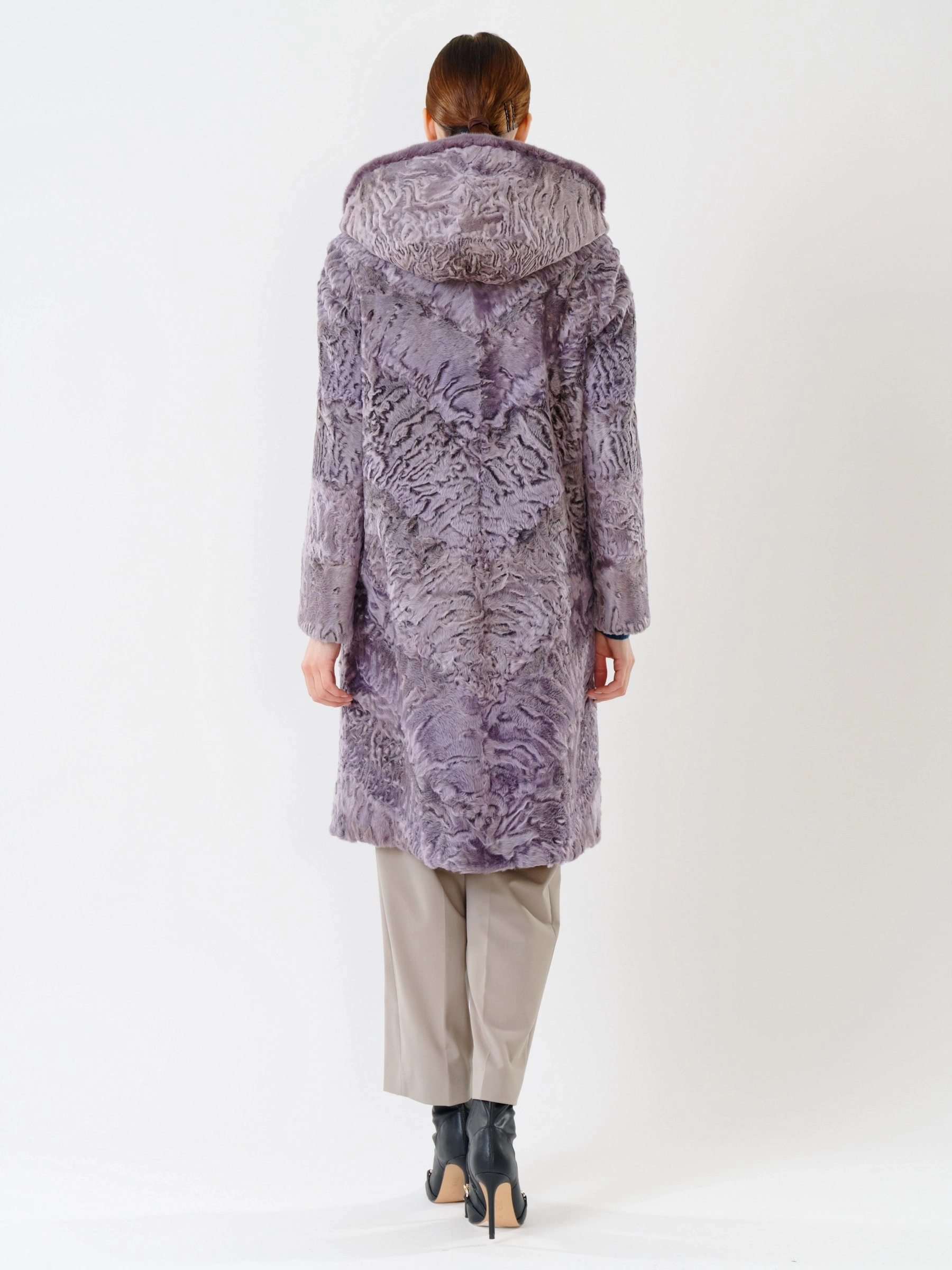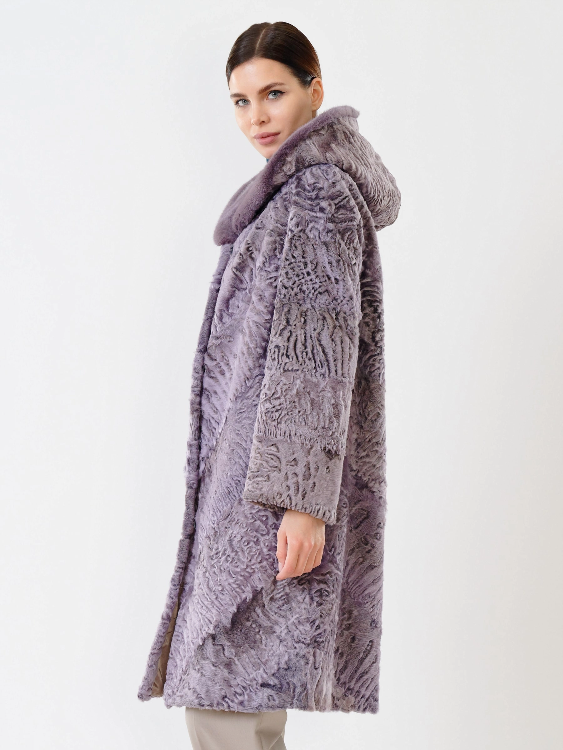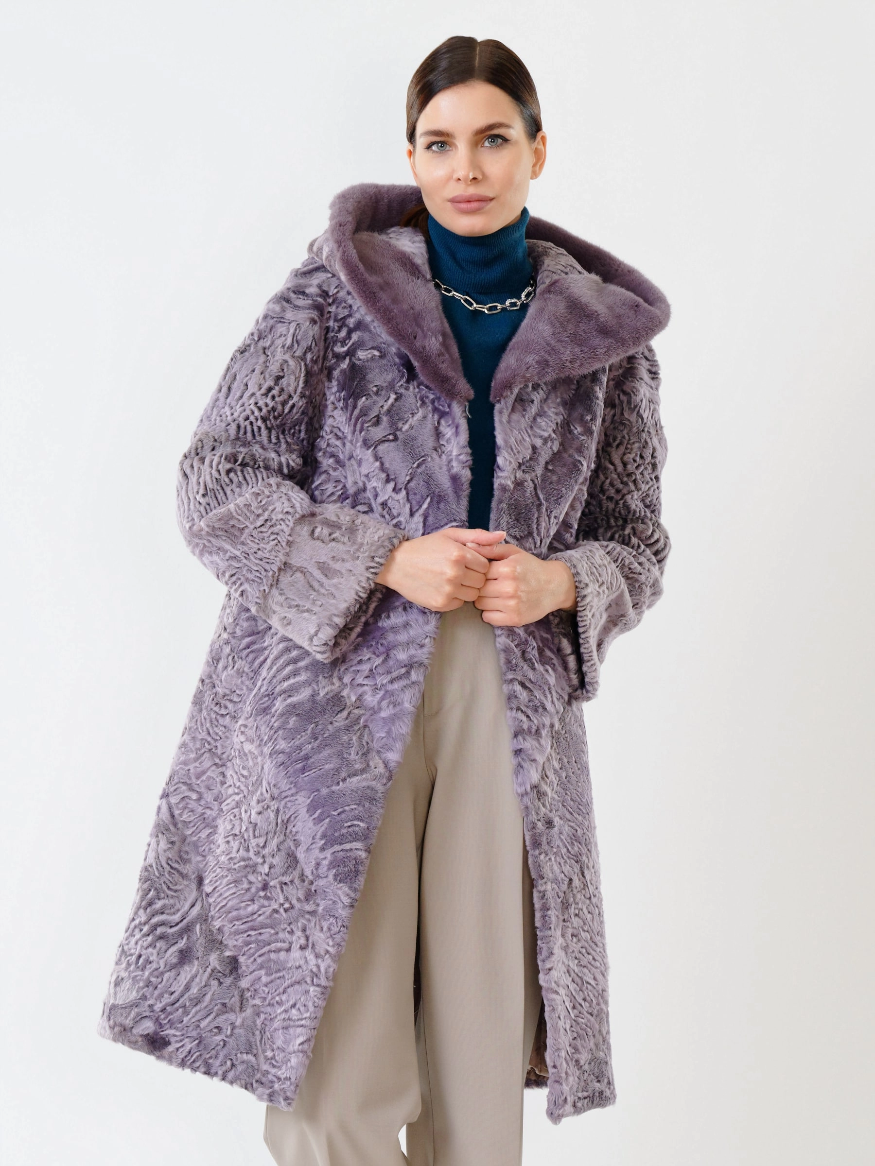 Элегантное пальто из афганского каракуля — это воплощение премиального уровня, где каждая деталь говорит о безупречном качестве и сдержанной роскоши. Модель демонстрирует тугой плоский завиток волоса, подчёркивающий великолепное качество меха, а шикарный капюшон с отделкой из норки добавляет образу изысканности и практичности. Чёткая посадка по фигуре, удобные карманы и безупречная работа портных обеспечивают комфорт, а ювелирный подбор шкурок по оттенку и структуре волоса делает это пальто настоящим произведением портновского искусства. Выдержанный, стильный дизайн без ничего лишнего подчеркивает его вневременную привлекательность и статусность.