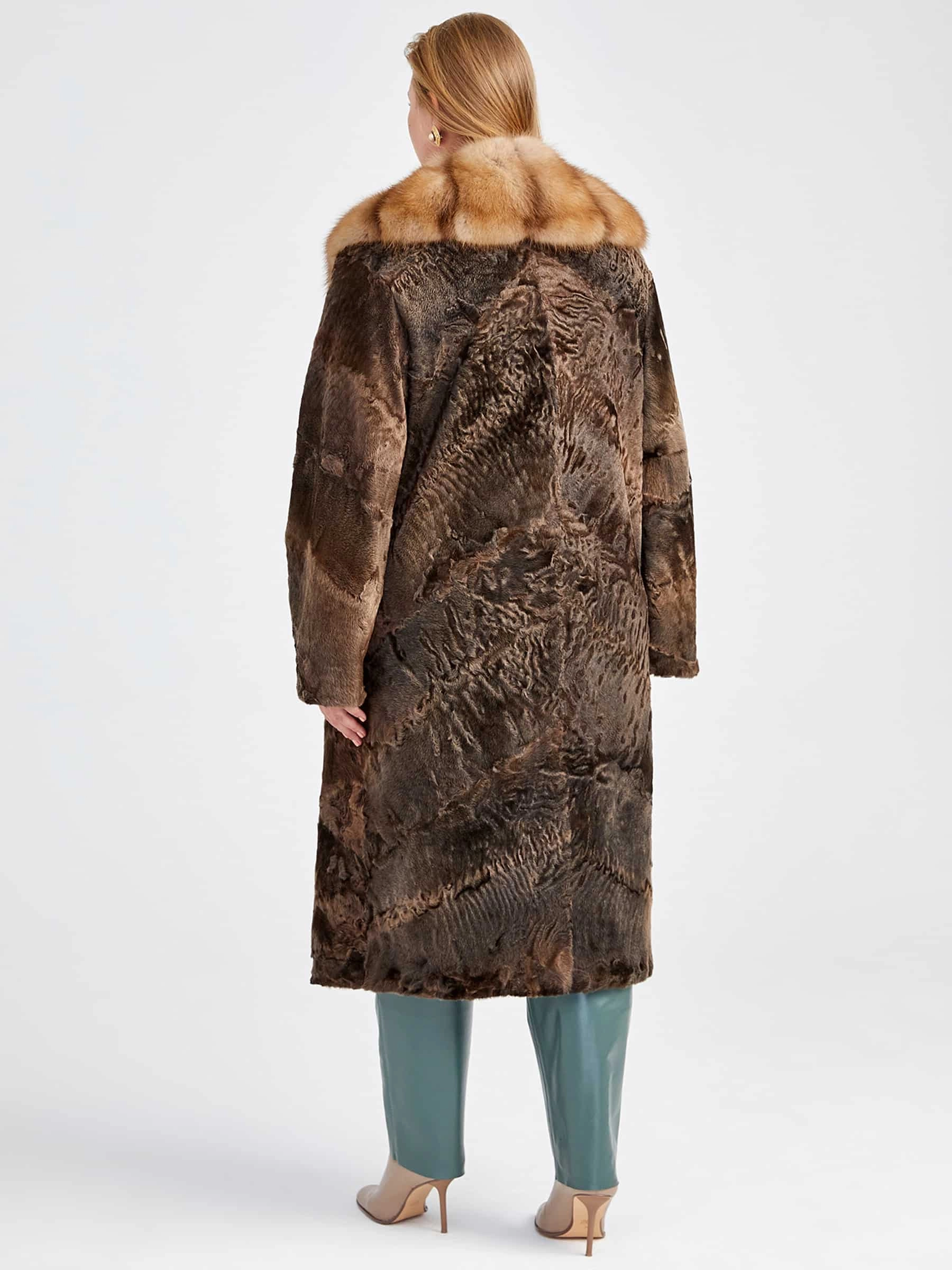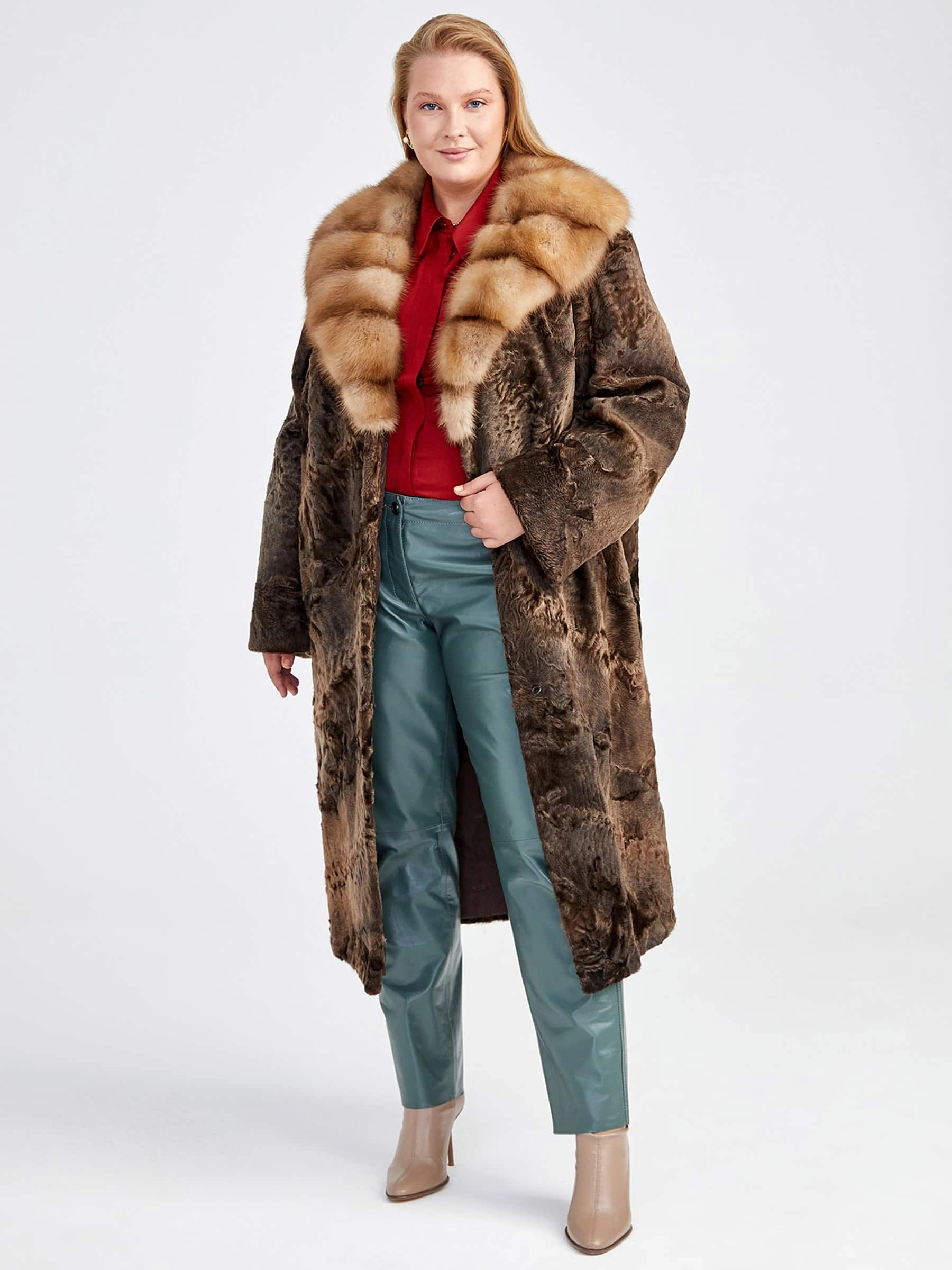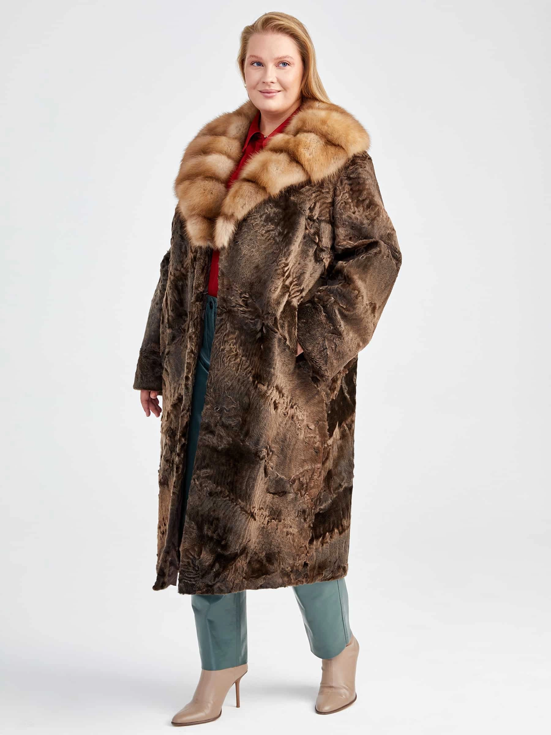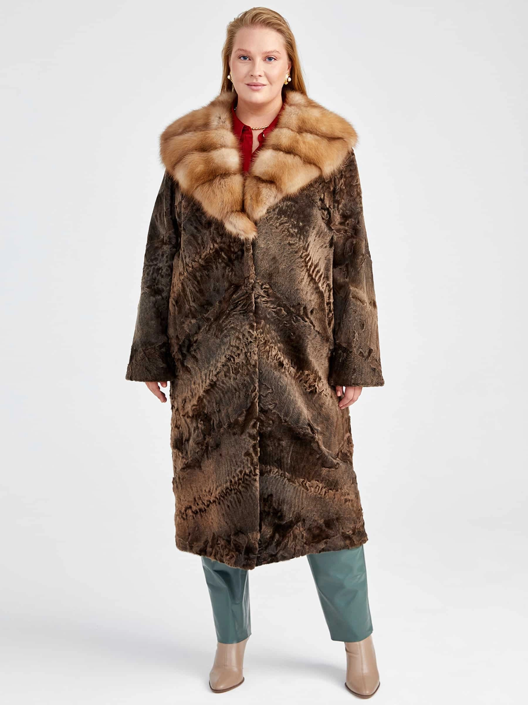 Роскошное прямое пальто длиной 115 см из афганской каракульчи в благородном цвете «сур» — это воплощение безупречного качества и мастерства. Модель отличает точно подобранный рисунок меха и ювелирный подбор шкурок по оттенку и структуре волоса, что подчёркивает высочайшее качество материала. Классический прямой силуэт с чёткой посадкой по фигуре дополнен элегантным воротником из меха куницы. Всё изделие выполнено с аккуратностью, говорящей о виртуозной работе портных. Эта вещь — вневременная инвестиция в ваш гардероб, идеальная для создания как дневных, так и вечерних образов.