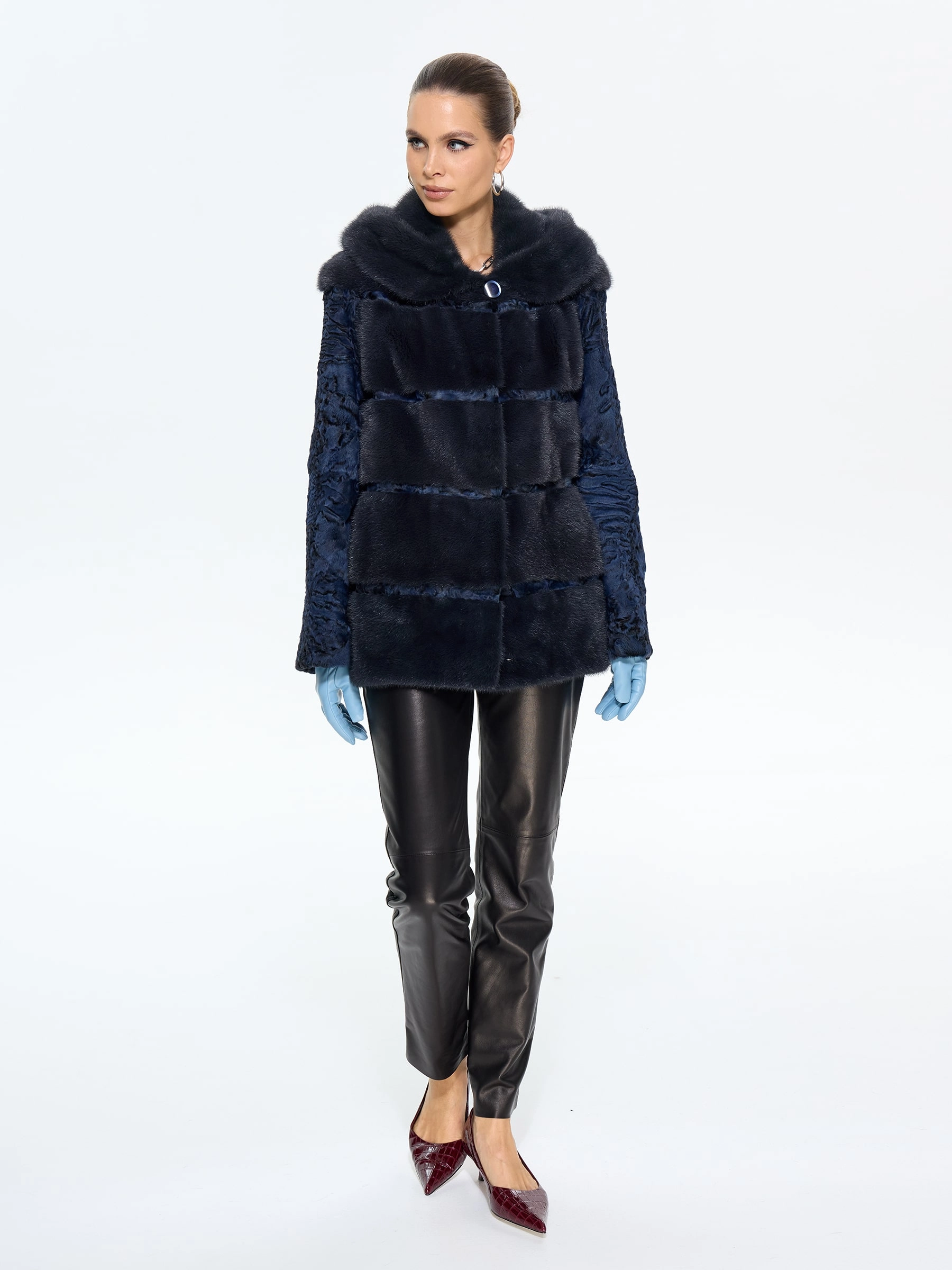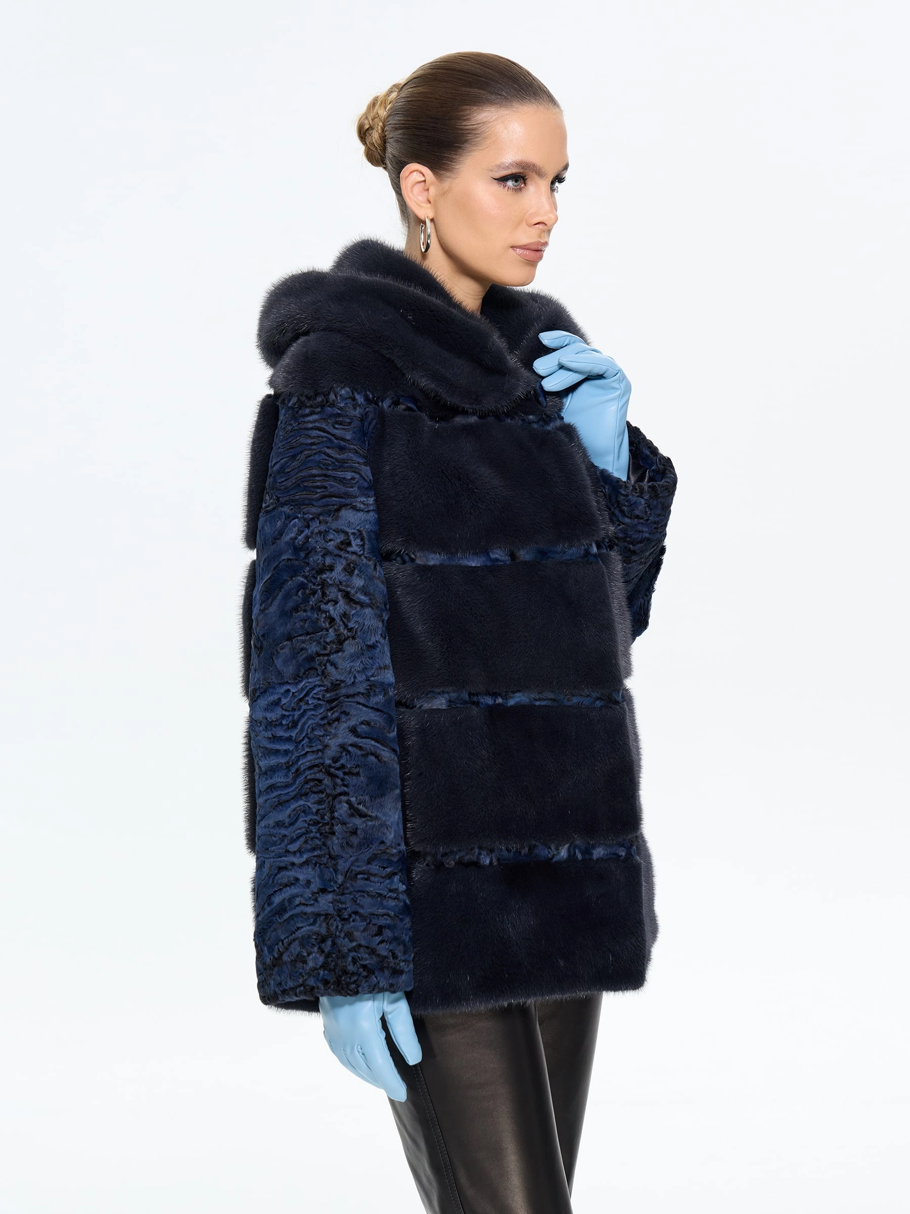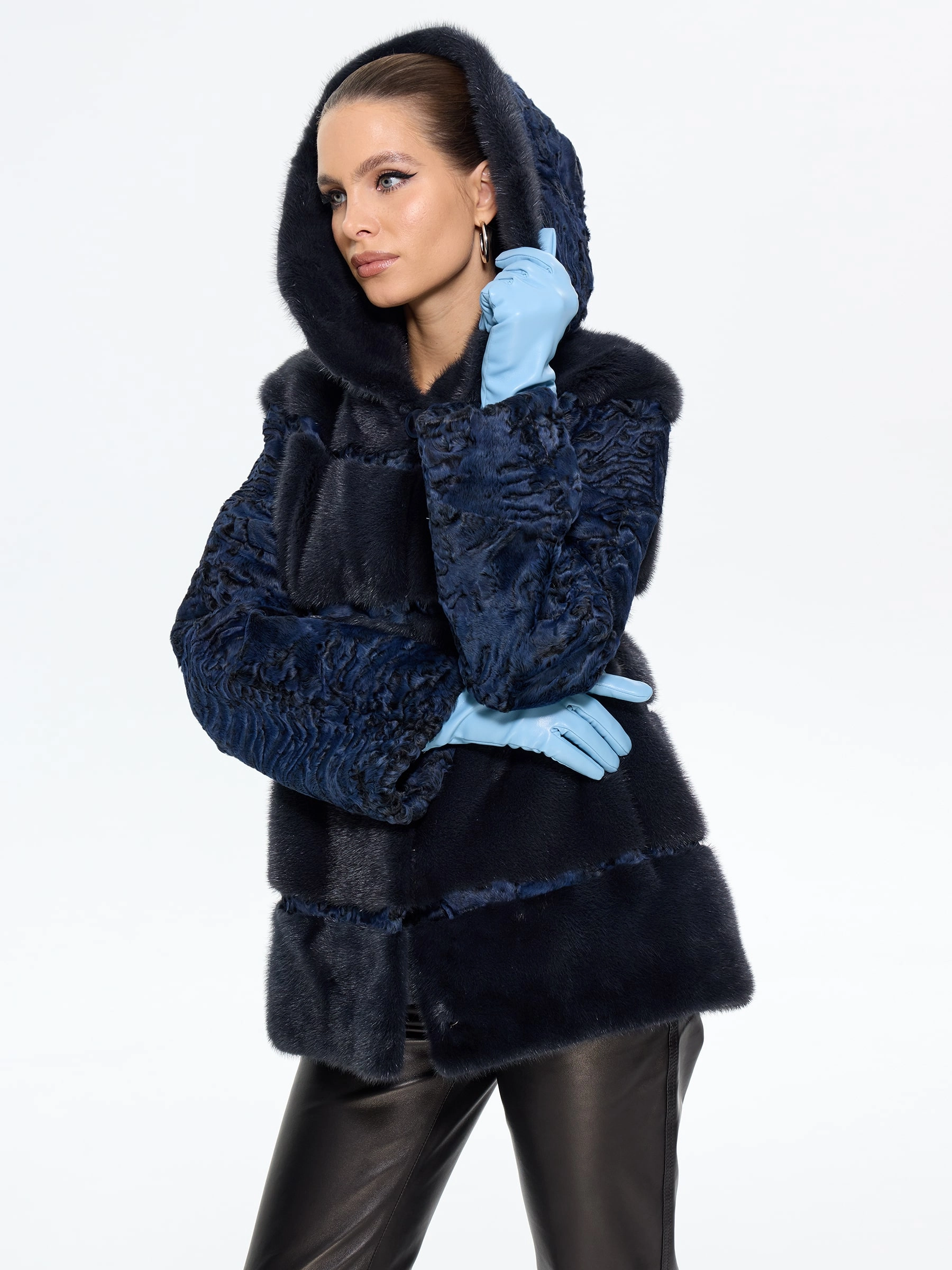 Элегантная шуба из меха каракульчи премиум-класса с элегантным капюшоном и отделкой из нежной норки. Классический прямой силуэт длиной 70 см создает утонченную элегантность, а практичный капюшон добавляет функциональности. Стилисты рекомендуют носить эту модель в насыщенном синем цвете с кожаными ботильонами и узкими джинсами для повседневного образа или с платьем-миди и сапогами-оверсайз для вечернего выхода. Идеальное сочетание неповторимого шарма, классических линий и современного комфорта.