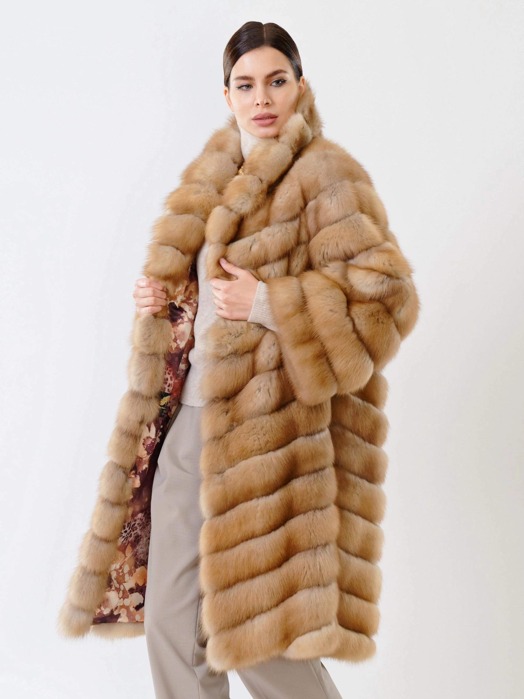 Эта куртка из меха куницы длиной 51–74 см представляет собой образец современной роскоши с авангардным акцентом. Модель свободного силуэта с безупречным втачным рукавом и строгим английским воротником изготовлена из шкурок высшего качества, приобретённых на легендарном аукционе «СОЮЗПУШНИНА» и выделанных на фабрике «Мета-Сибирь». Исключительный характер изделию придаёт уникальная отделка: мех куницы расшит фактурной кожей питона, что подчеркивает виртуозную работу мастеров. Дополненная удобной застёжкой на клипсах, мягким подкладом из 100% вискозы и официальной сертификацией, эта куртка — не просто одежда, а инвестиция в безупречный стиль на сезон осень-зима.