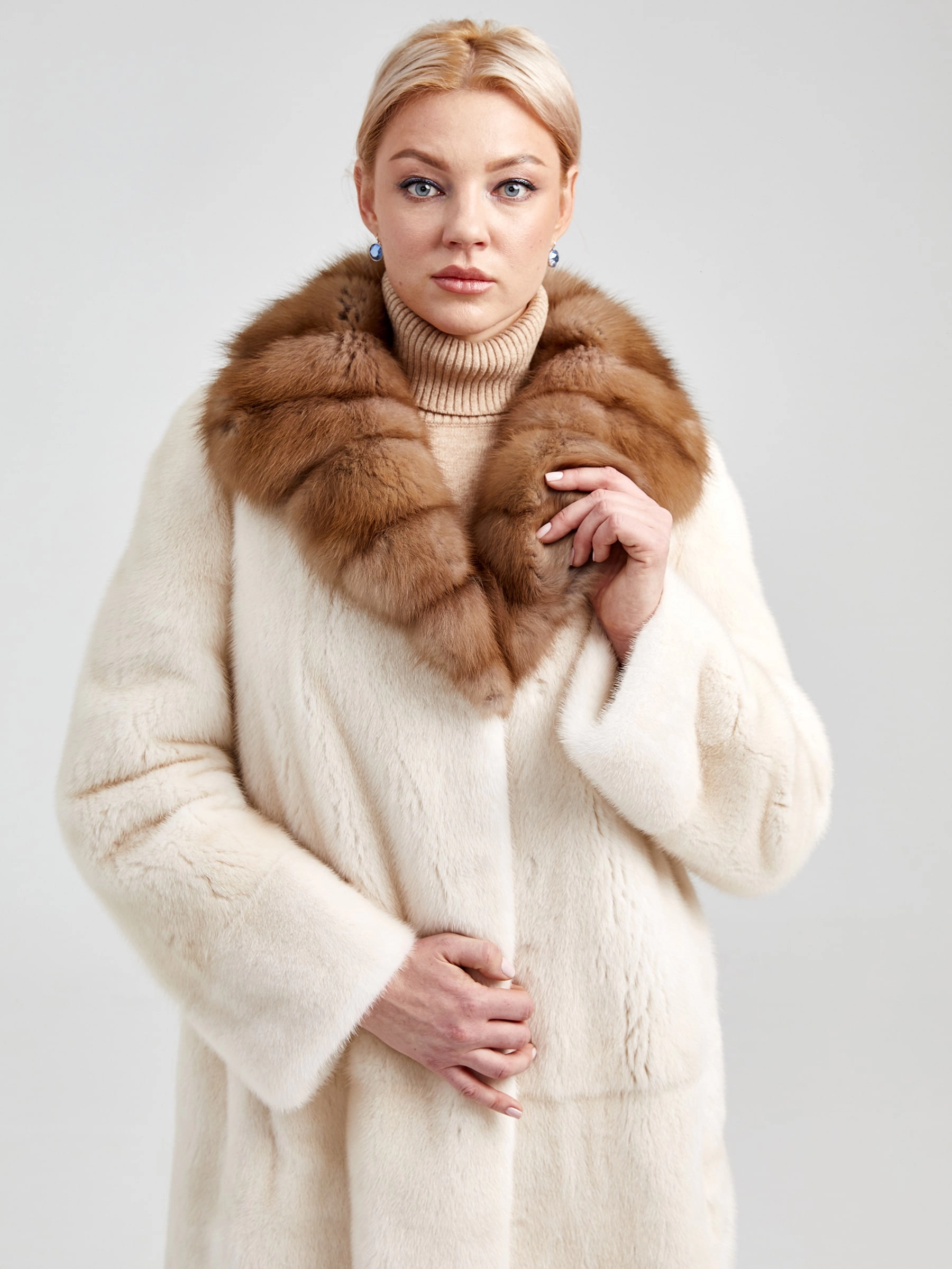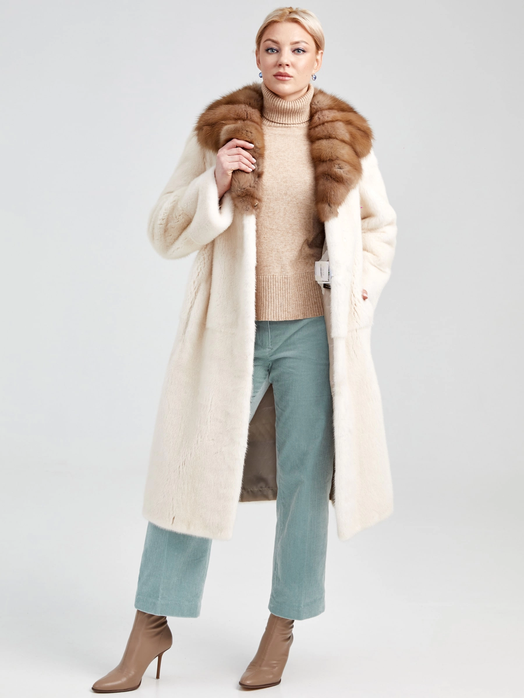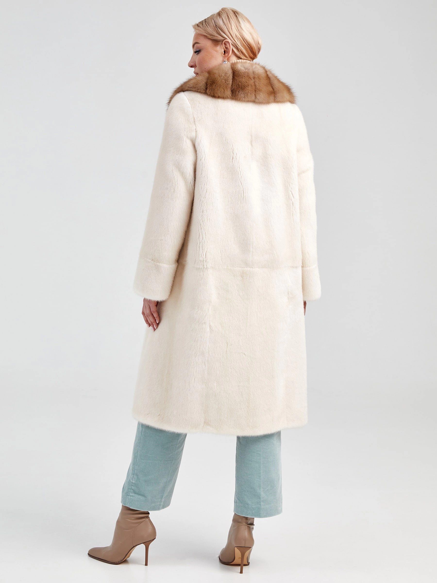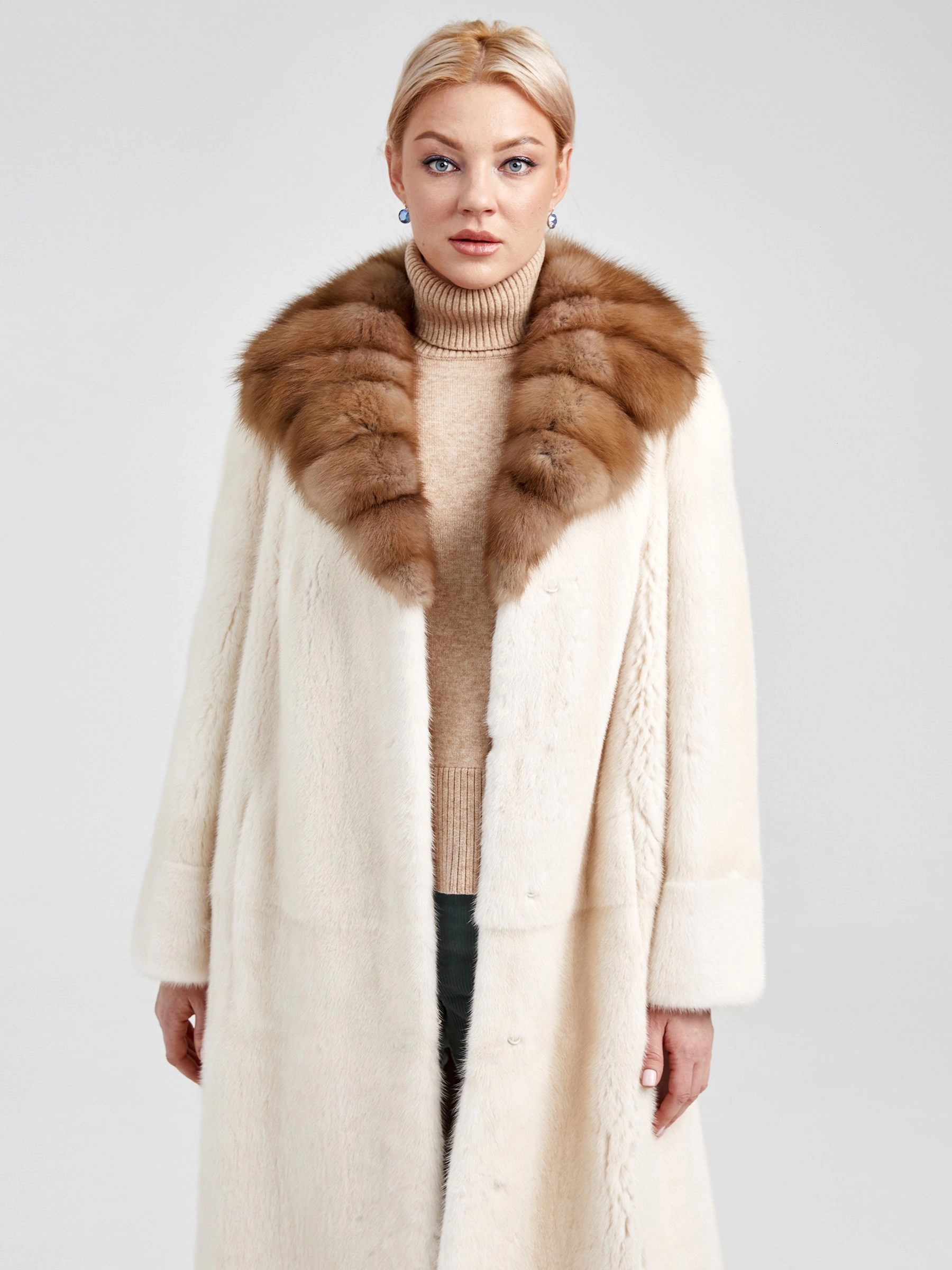 Товар женская шуба из меха норки с воротником из меха соболя лола(авс), жемчужная, размер 46, артикул 33040 выполнен из норка крашенной с застежкой клипсы. Рассчитан на сезон: осень-зима. Длина изделия свыше 90 см, силуэт прямой.