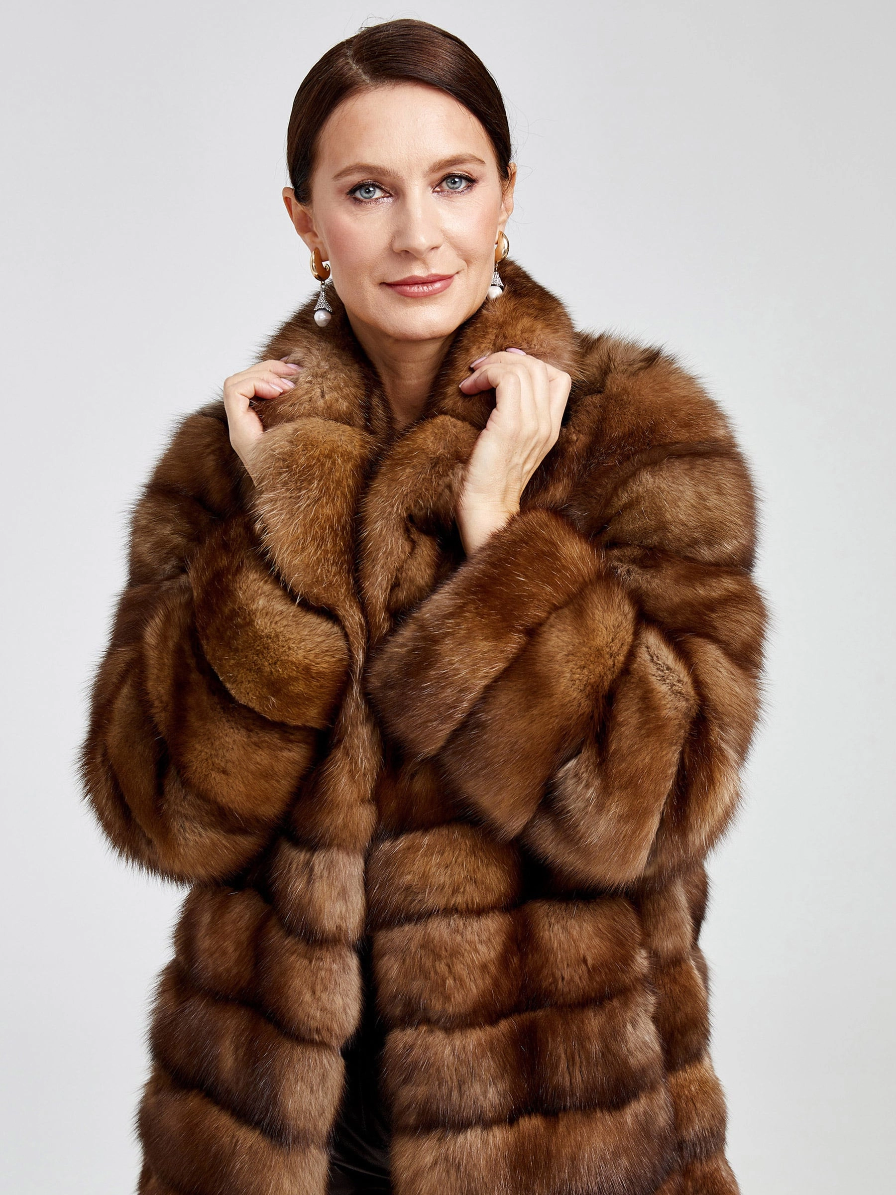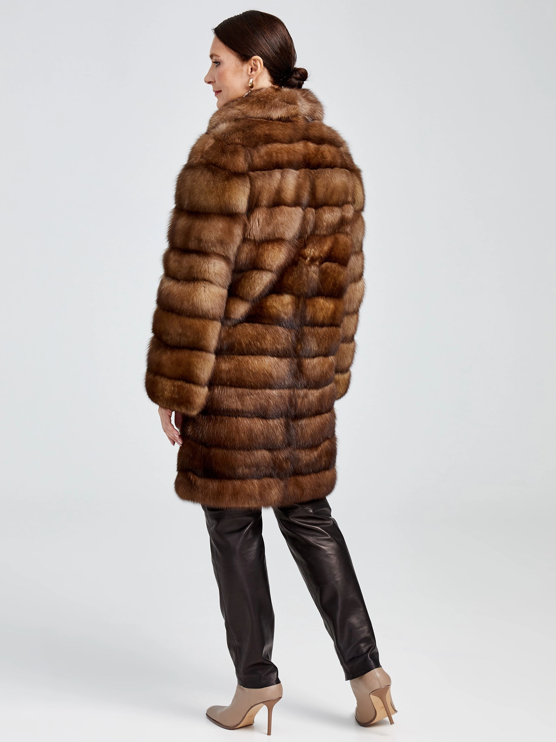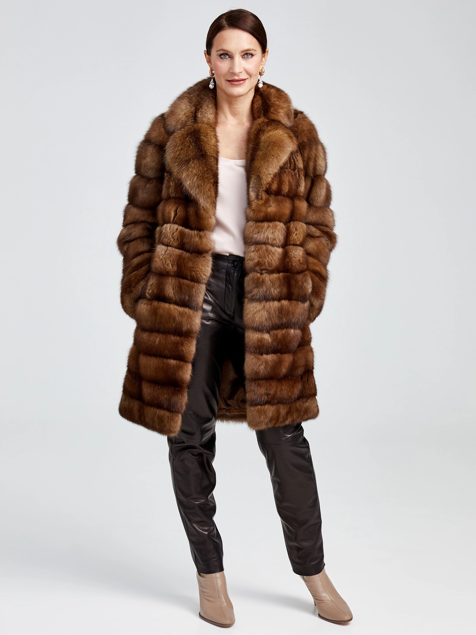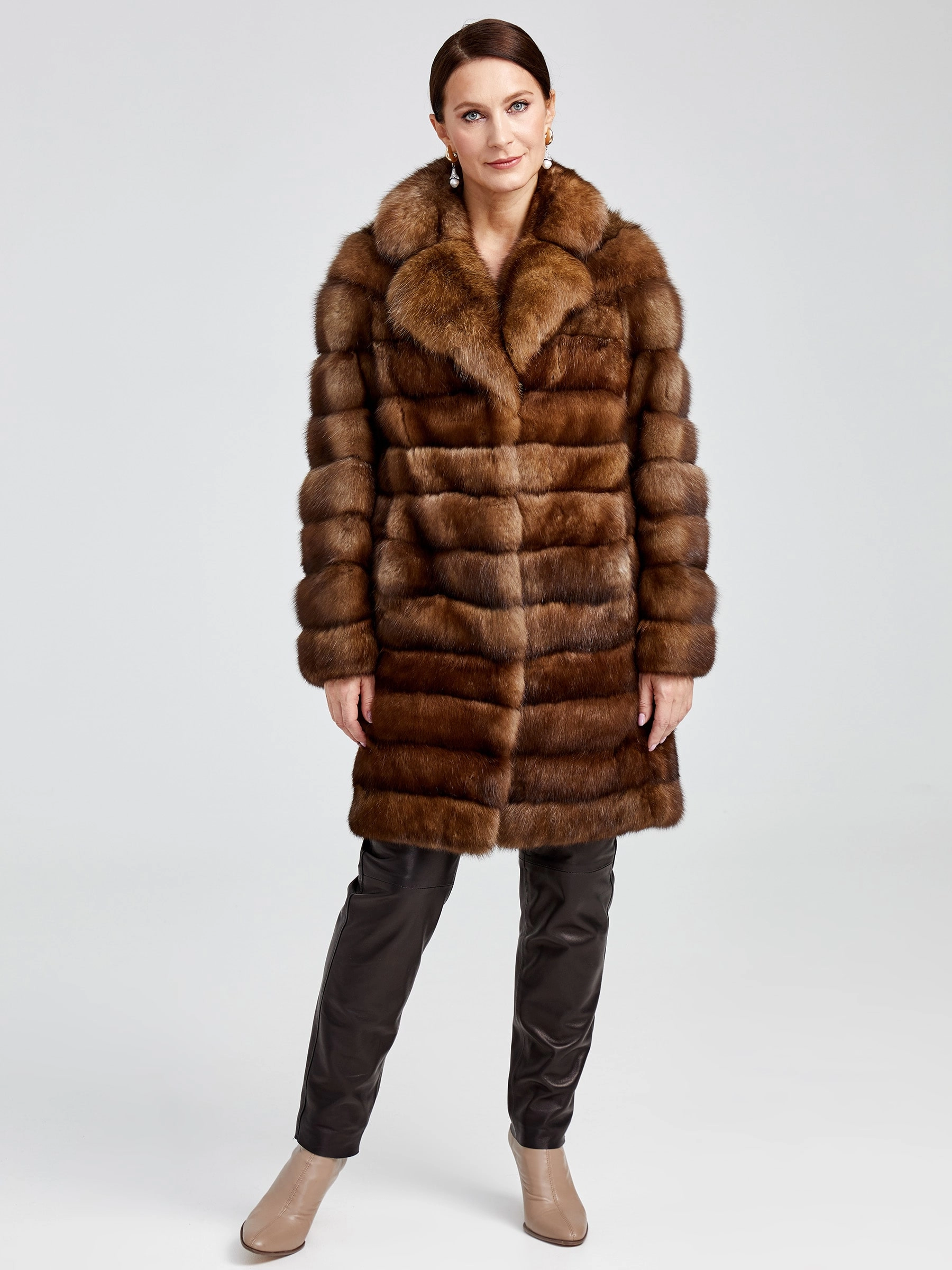 Изысканное пальто длиной 90 см из меха соболя с диагональной раскладкой воплощает премиальное качество и безупречный вкус. Его густой, шелковистый подшёрсток надёжно сохраняет тепло, а элегантный английский воротник и застёжка на клипсах создают выразительный силуэт. Невероятная лёгкость и комфорт модели делают её идеальной для создания стильных образов: сочетайте пальто с кожаными брюками и сапогами-ботфортами для вечернего выхода или с платьем-миди и лаковыми лодочками — этот предмет гардероба подчеркнёт вашу индивидуальность и безупречный стиль.