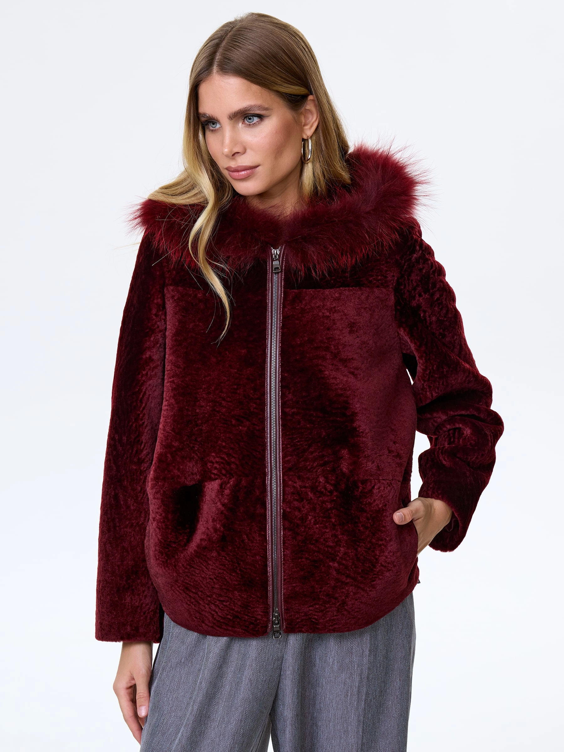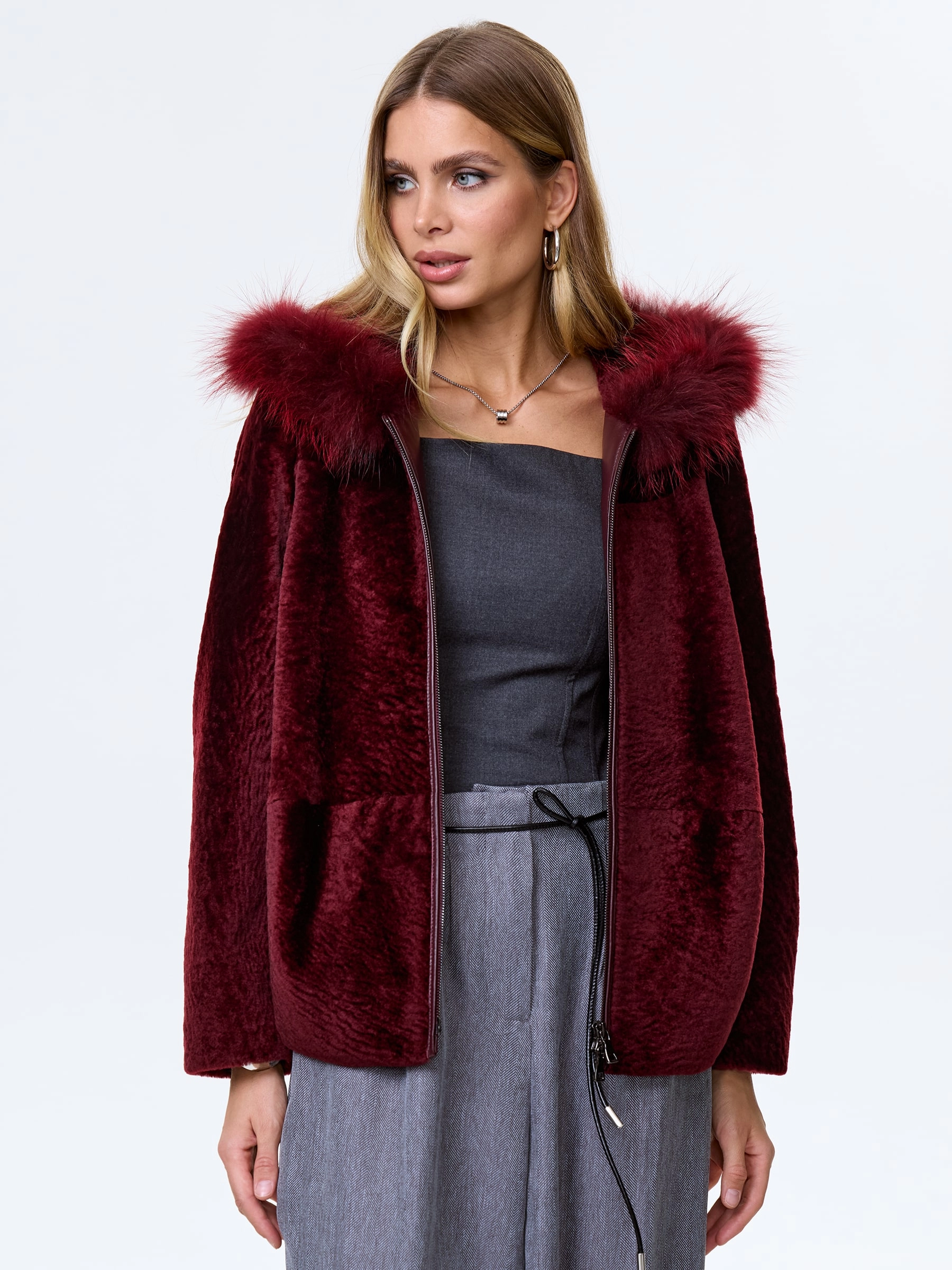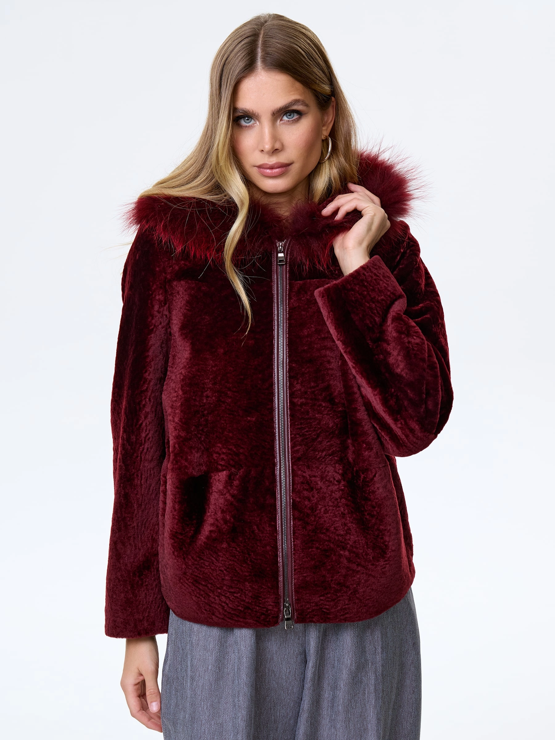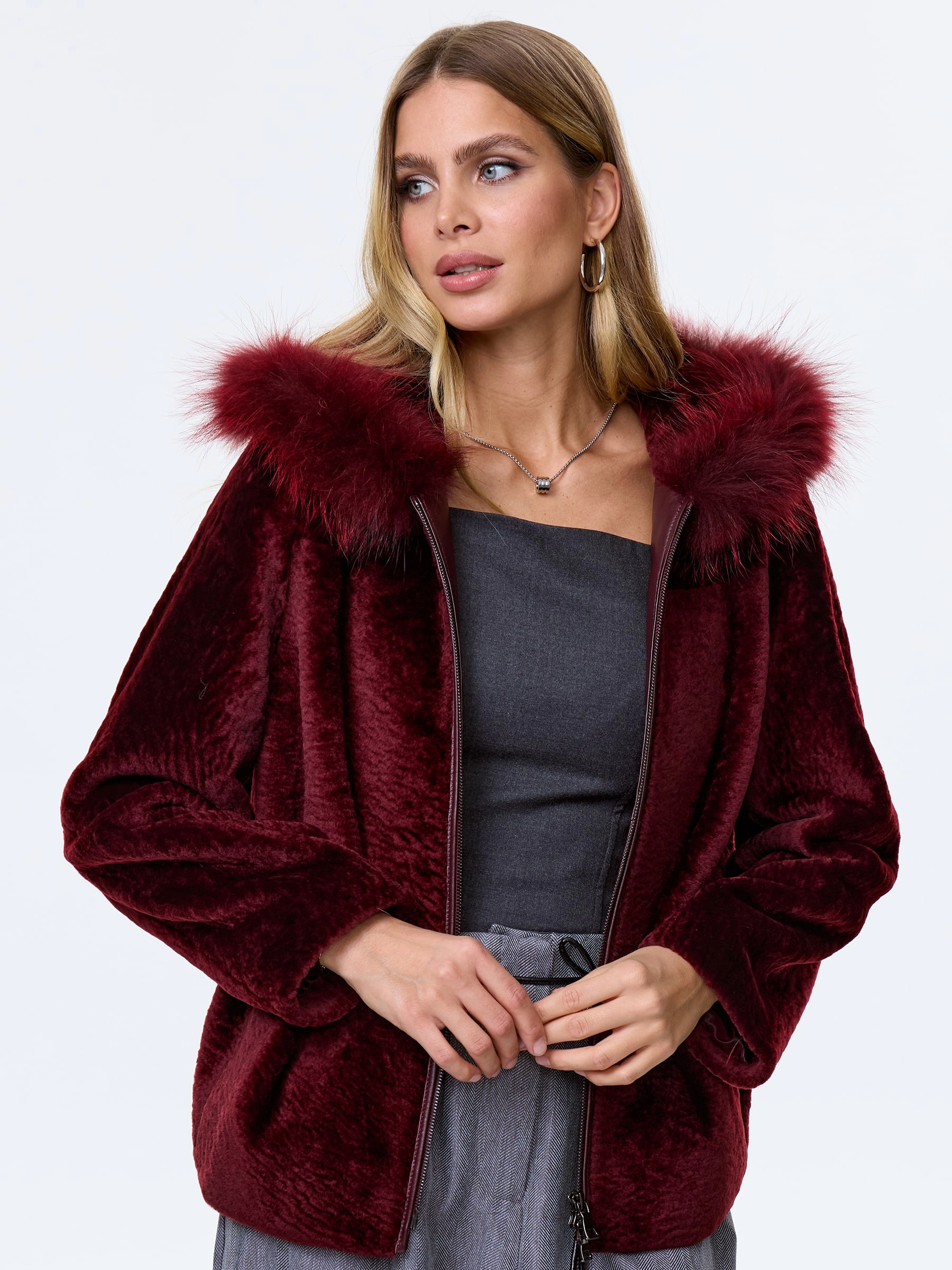 Женская шуба с капюшоном из астрагана с мехом песца 48мех, бордовая, размер 48, артикул 13800