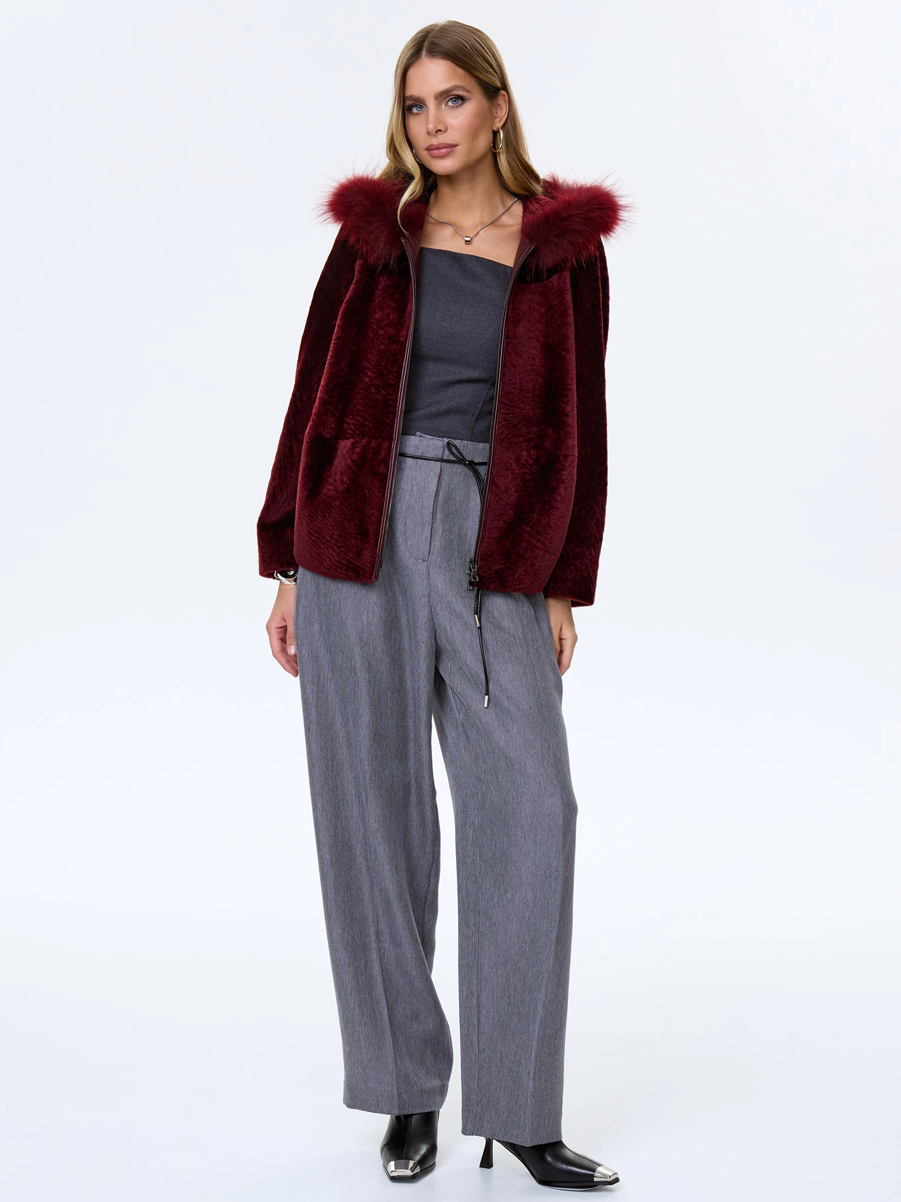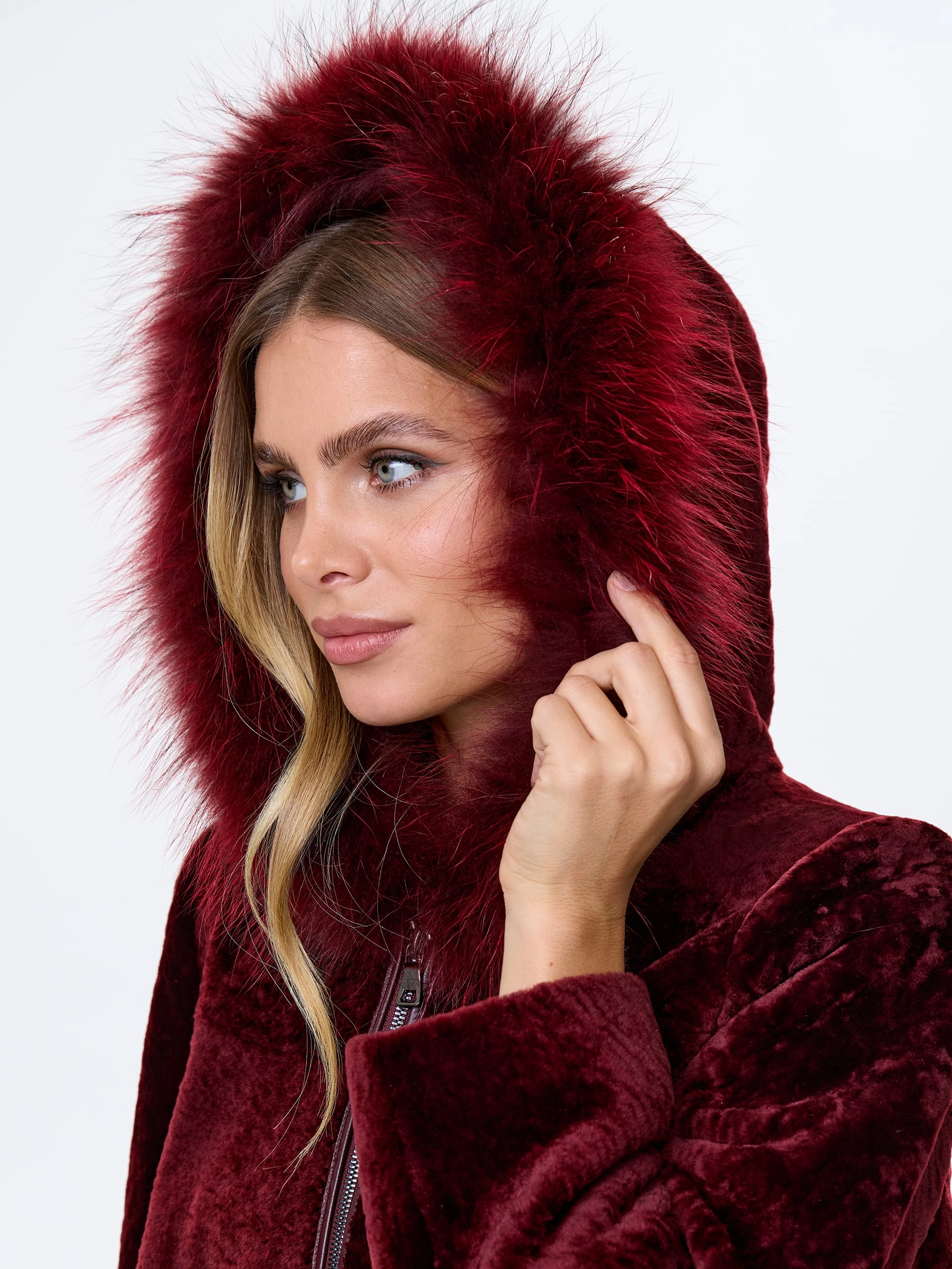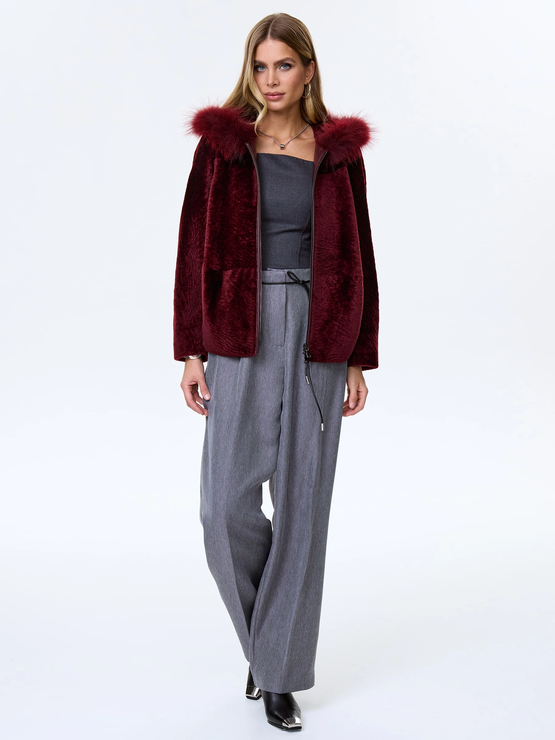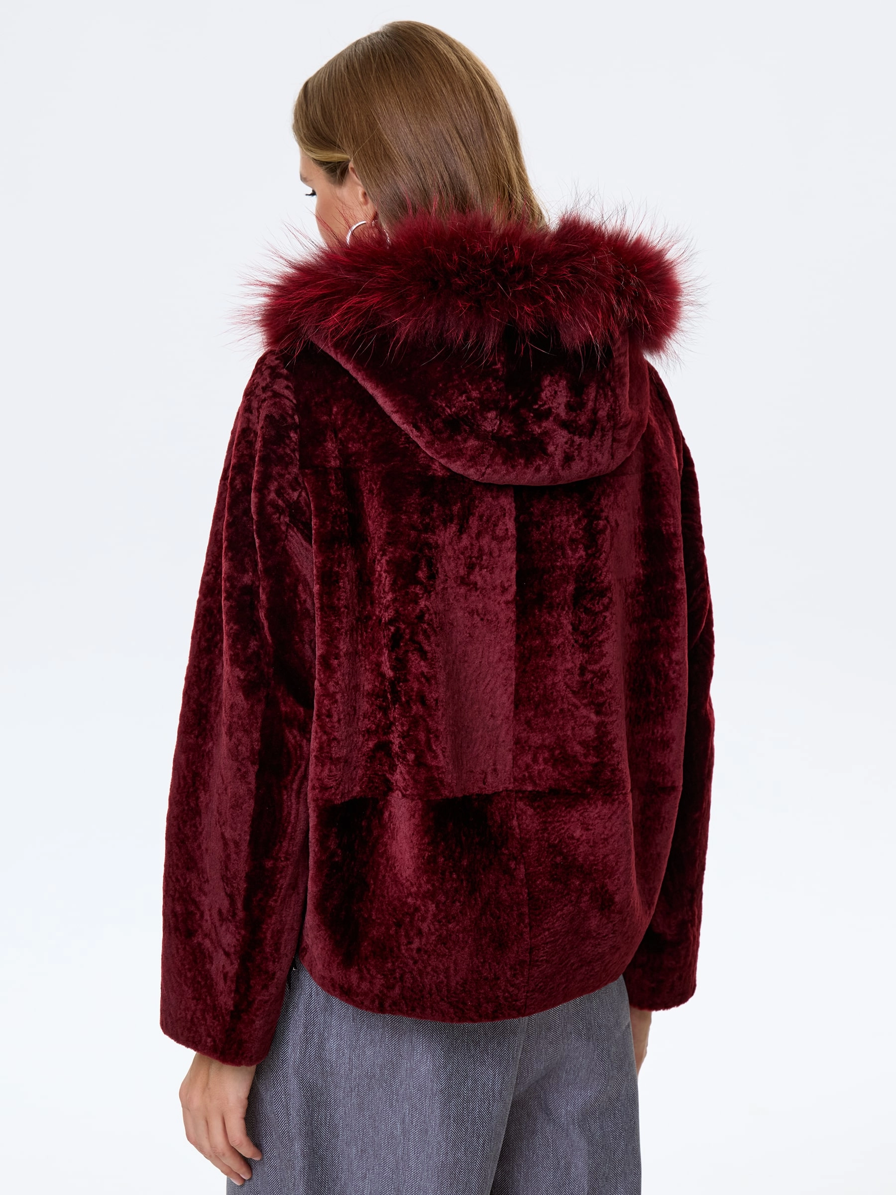 Женская шуба с капюшоном из астрагана с мехом песца 48мех, бордовая, размер 48, артикул 13800