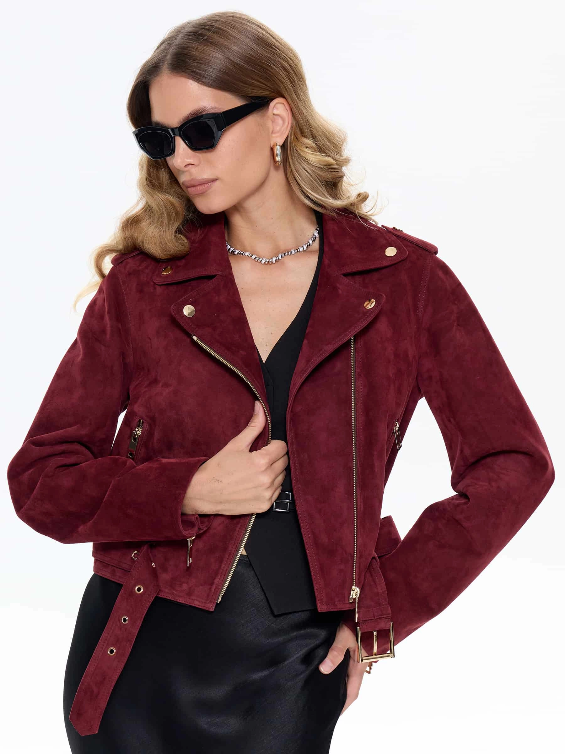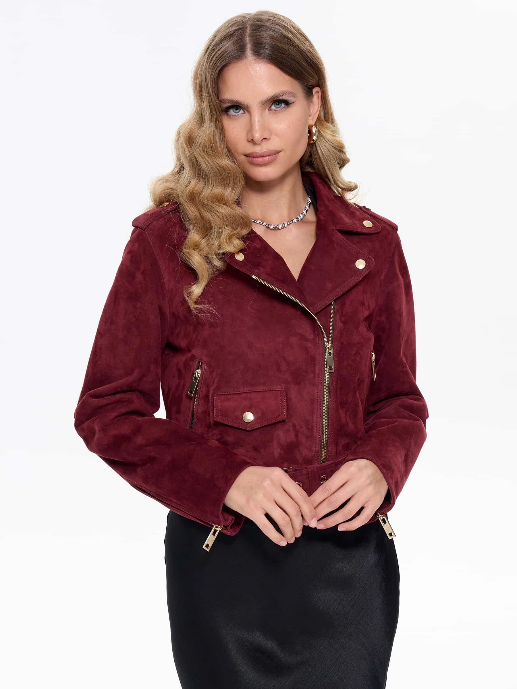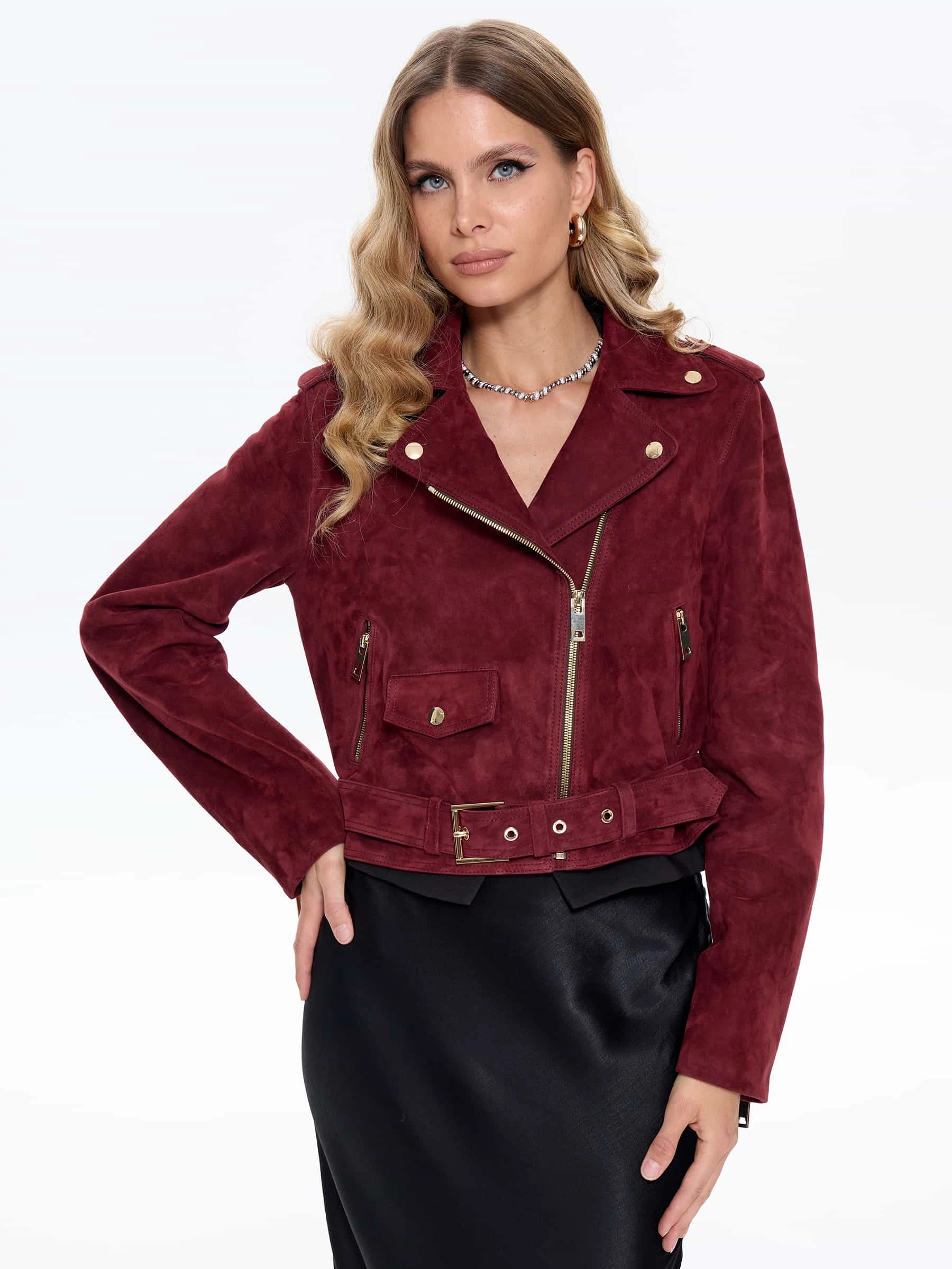 Товар женская замшевая куртка косуха с поясом премиум класса 3080з, бордовая, размер 42, артикул 24740 выполнен из натуральной кожи с застежкой молния. Рассчитан на сезон: весна-лето. Длина изделия 46 см, силуэт прямой.
