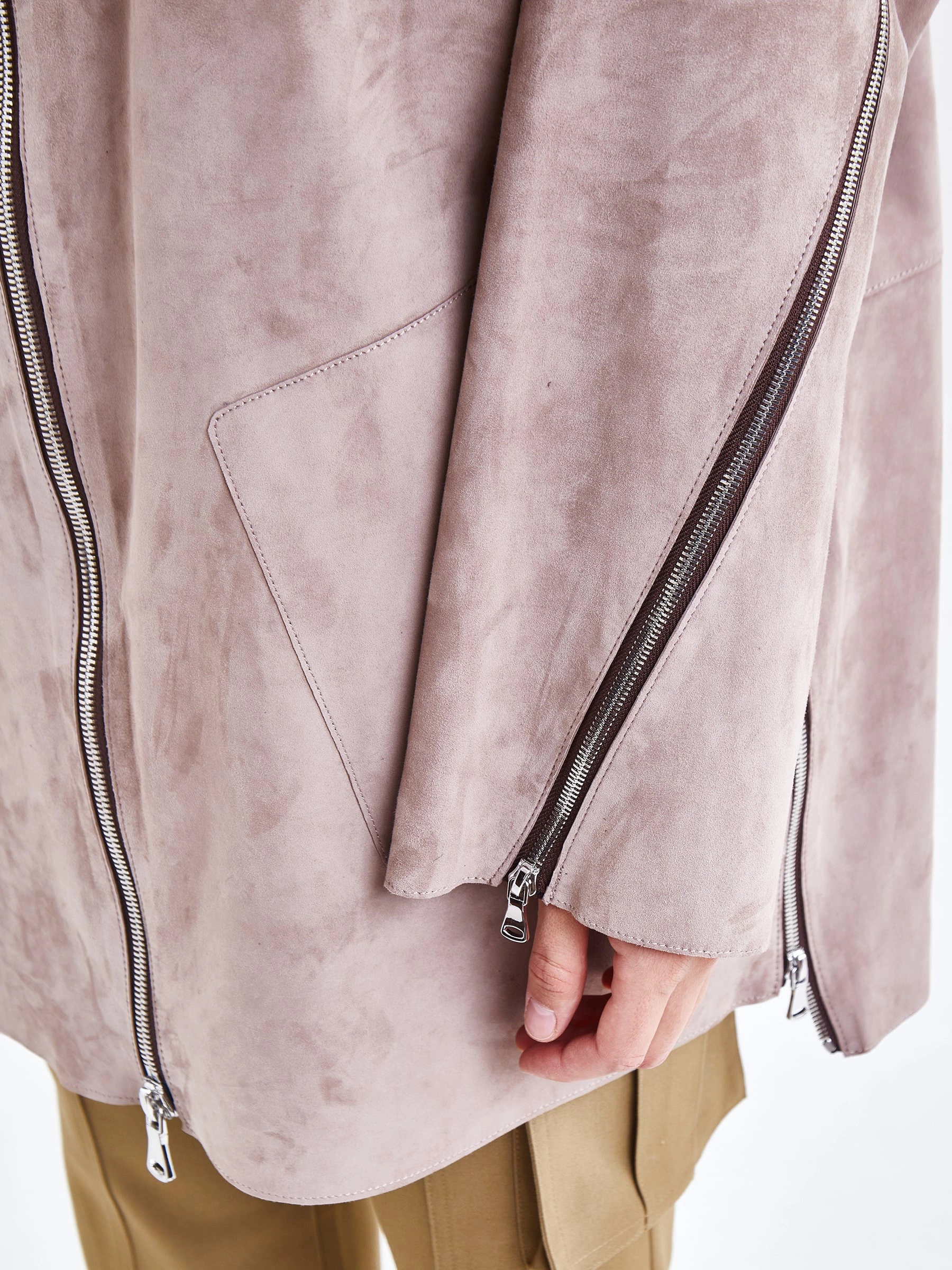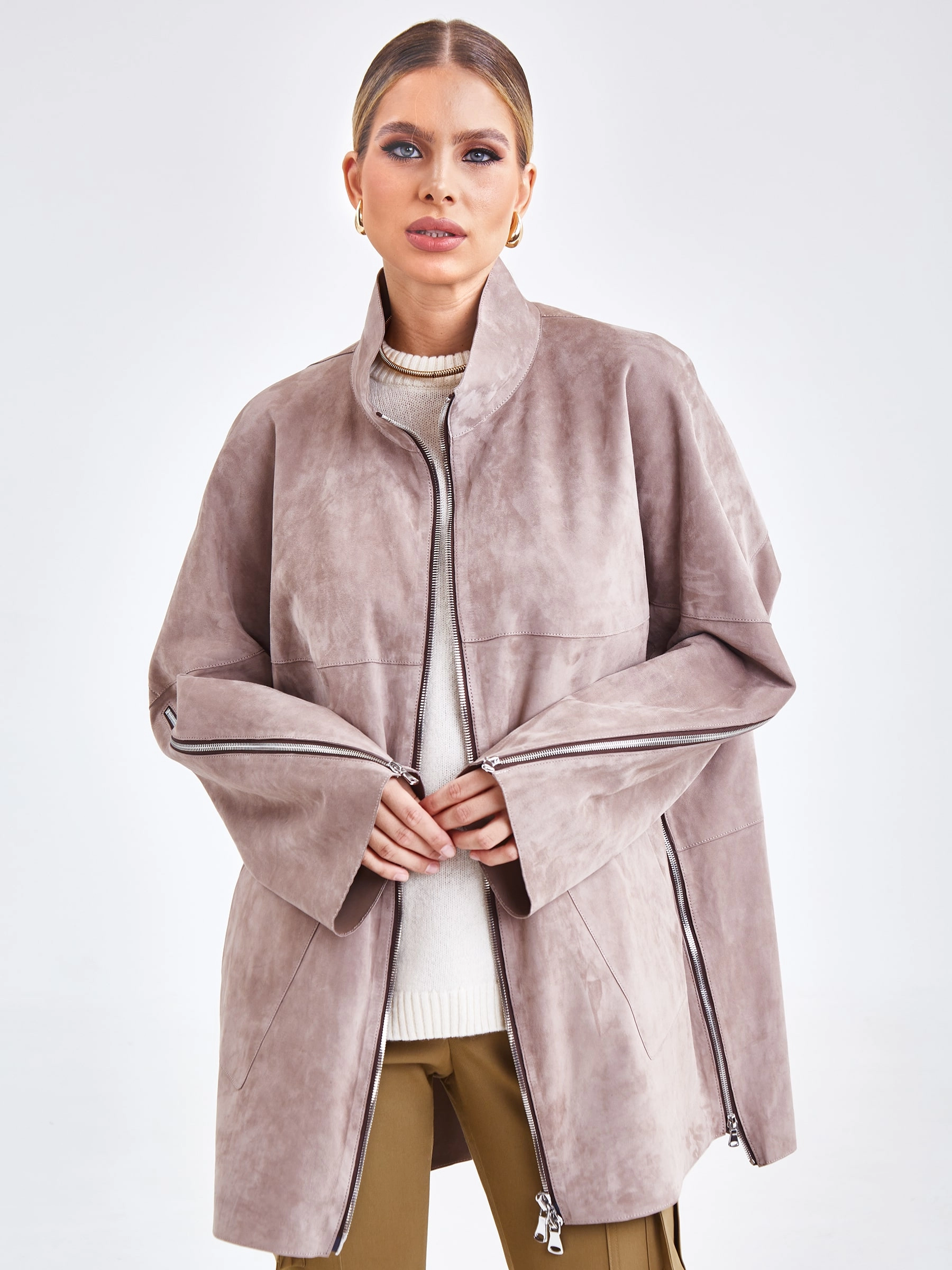 Натуральная замша премиум класса не останется без внимания для ценителей этого материала. Свободный крой, широкий рукав, не высокий воротник-стойка. Боковые разрезы застегиваются на молнию. Идеально сочетается с кожаными брюками.