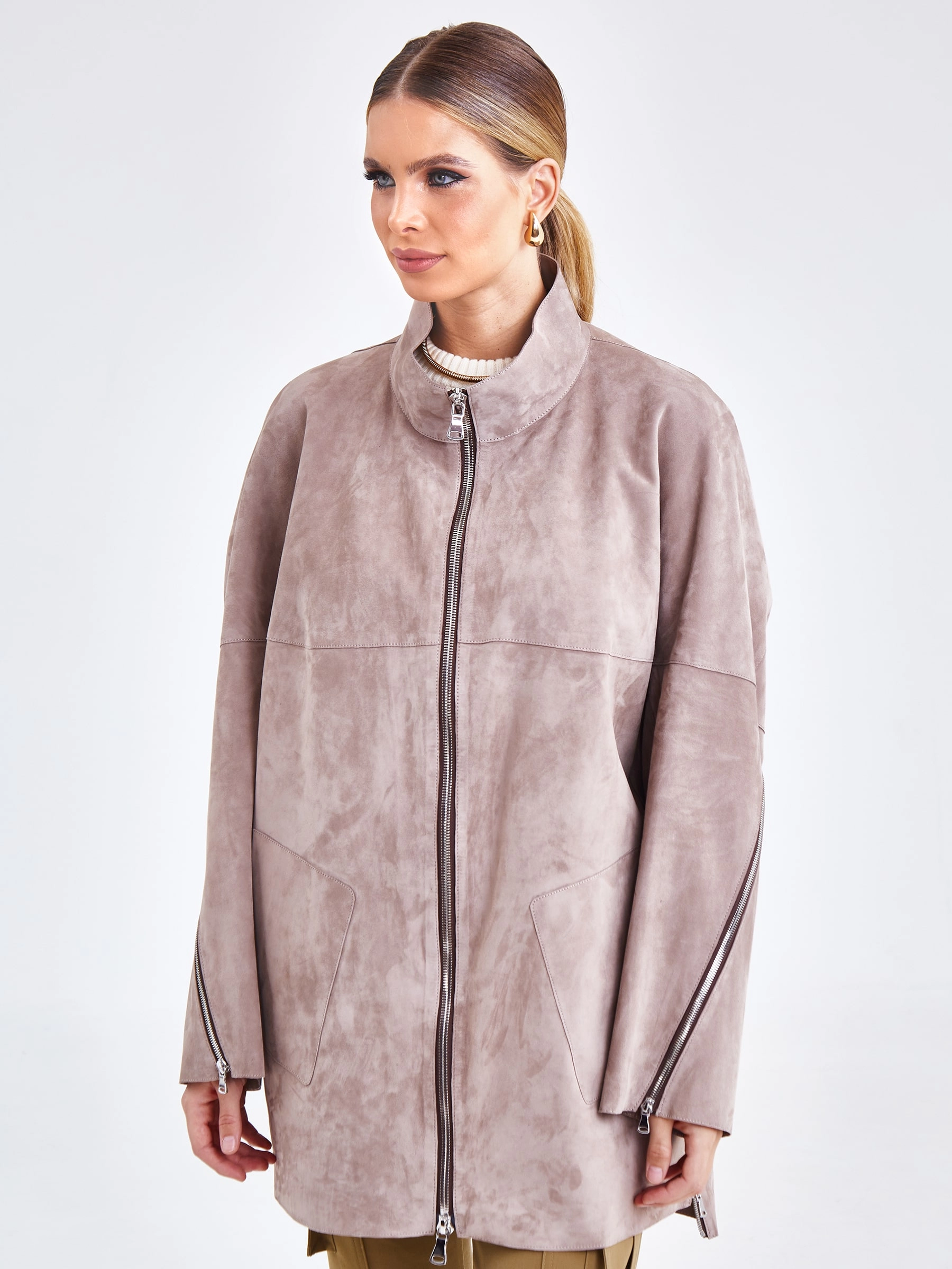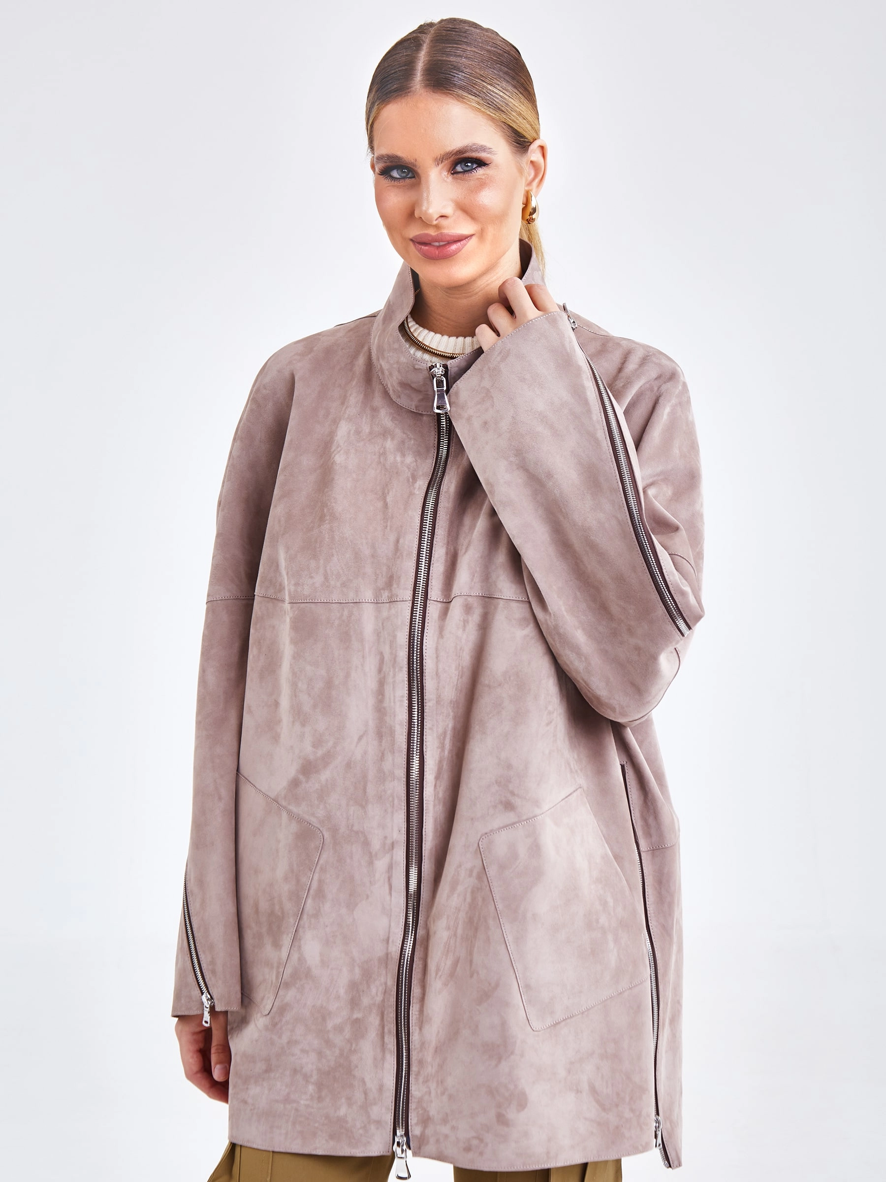 Товар женская замшевая куртка оверсайз премиум класса 3037 , светло-коричневая, размер 46, артикул 23161 выполнен из натуральной замши с застежкой молния. Рассчитан на сезон: весна-лето. Длина изделия 84 см, силуэт свободный.
