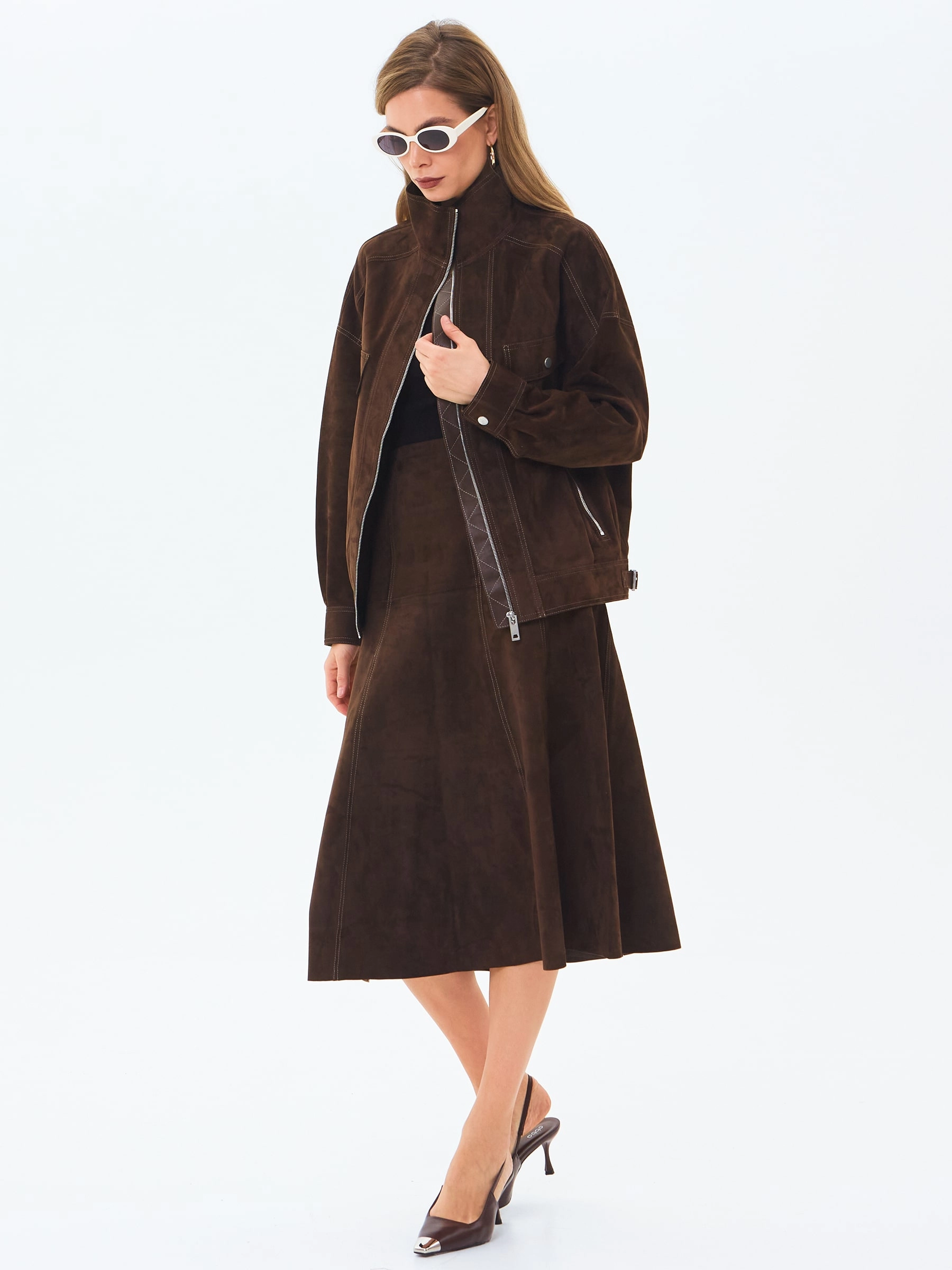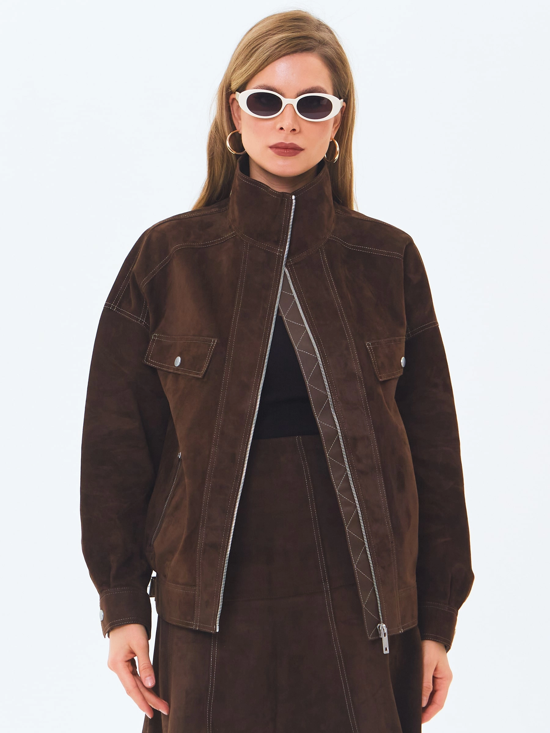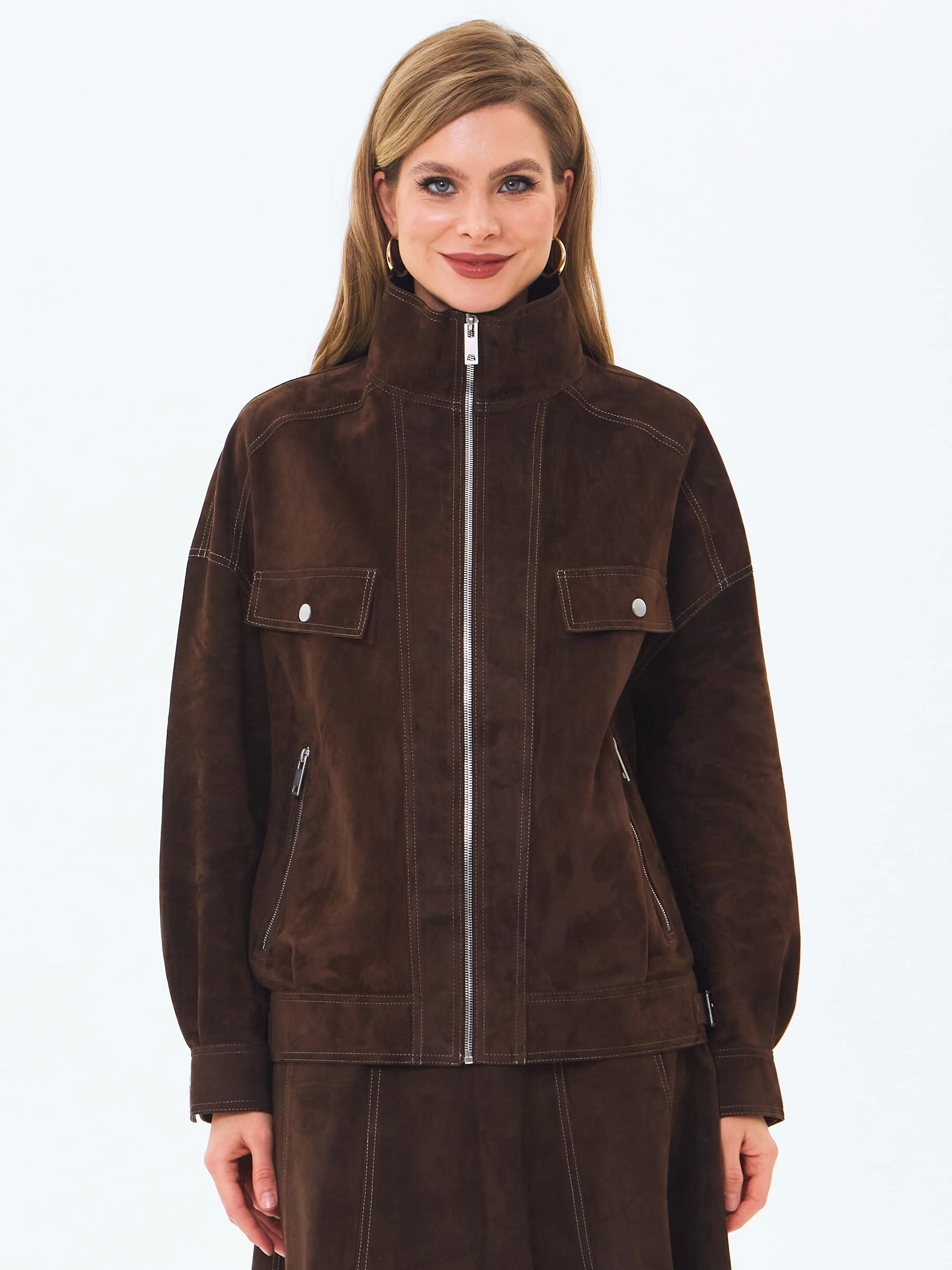 Товар женская замшевая куртка премиум класса 3087з, коричневая, размер 46, артикул 24690 выполнен из натуральной замши с застежкой молния. Рассчитан на сезон: весна-лето. Длина изделия 62 см, силуэт свободный.