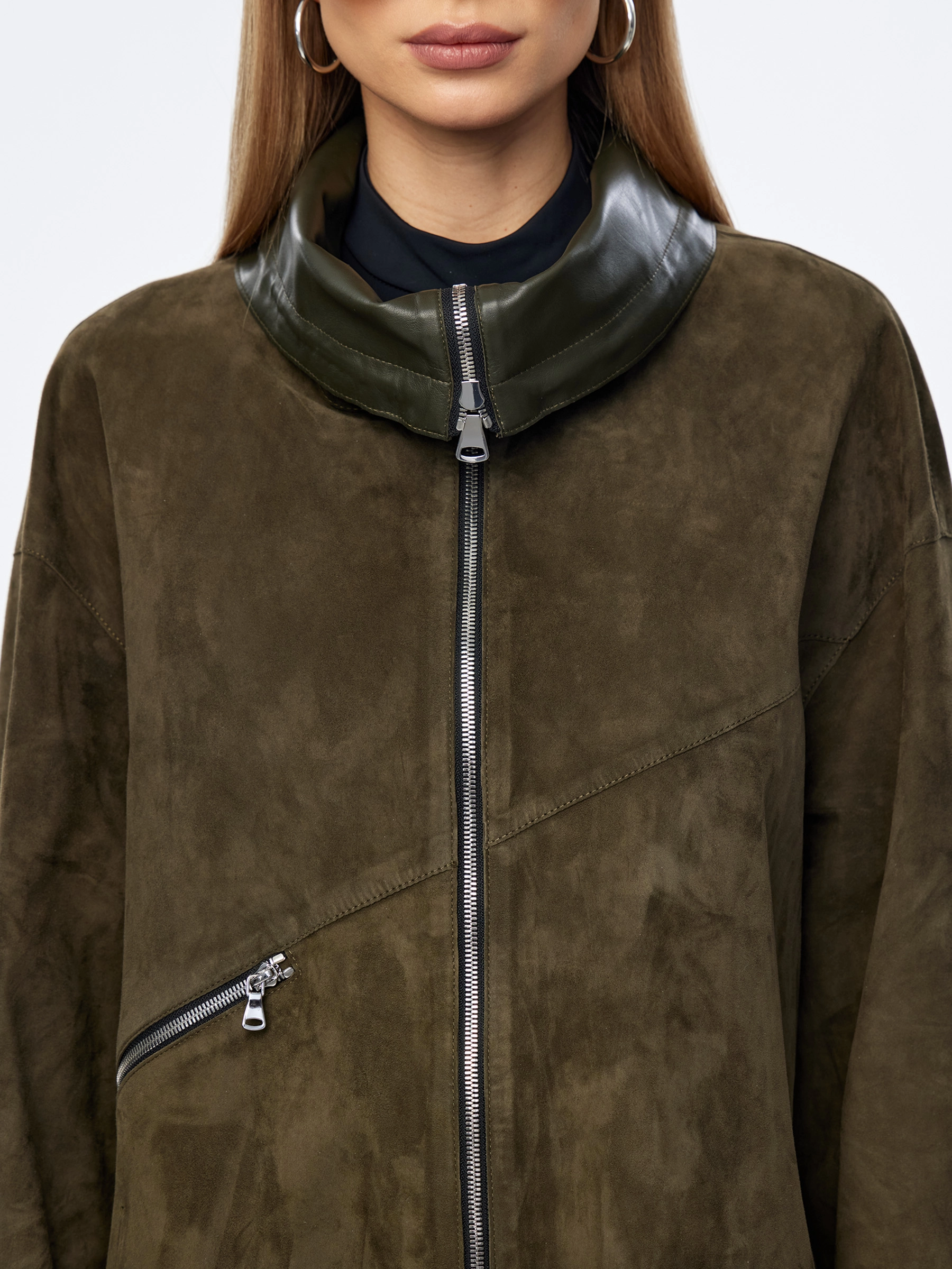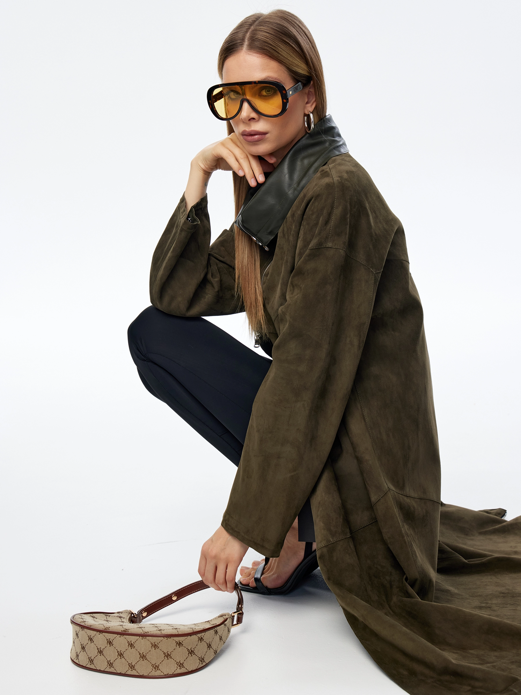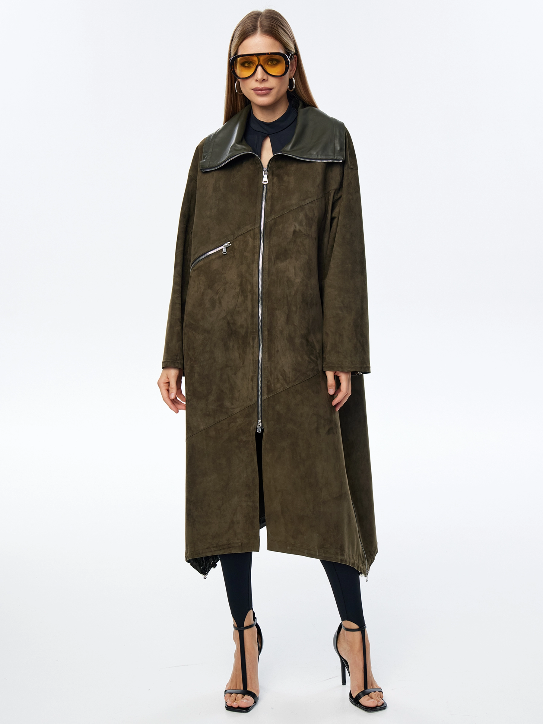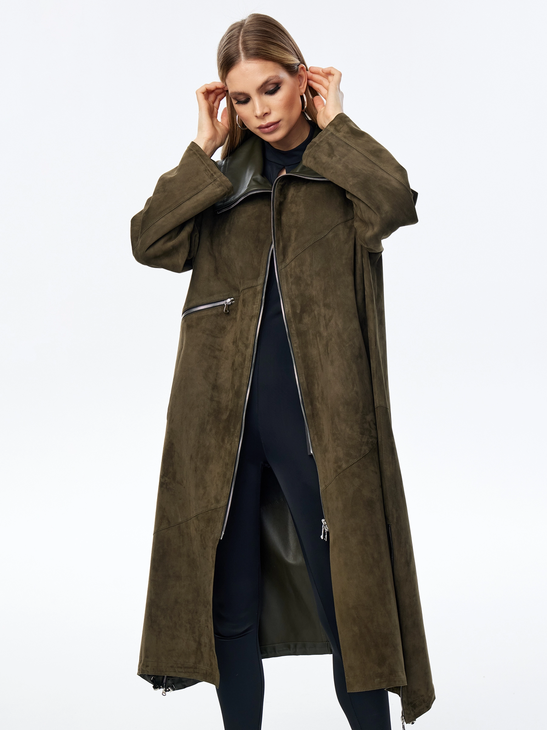 Товар женский длинный замшевый плащ оверсайз премиум класса 3061з, хаки, размер 50, артикул 23600 выполнен из натуральной замши с застежкой молния. Рассчитан на сезон: весна-лето. Длина изделия 115 см, силуэт оверсайз.
