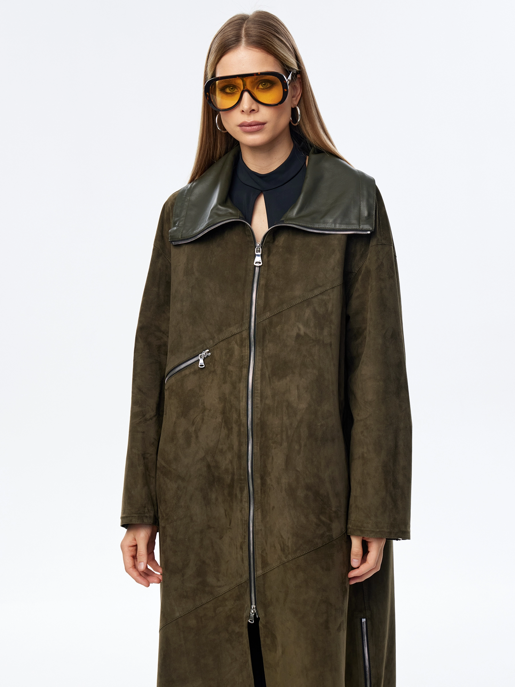 Этот длинный плащ - воплощение стиля и комфорта. Для пошива модели с регулируемыми отложным воротником-стойкой и низом, мастера использовали нежную натуральную замшу премиум класса. Свободный крой, два врезных кармана,боковые разрезы как и сама модель застегиваются крупными молниями. Акцент сделали на асимметричный декоративный карман