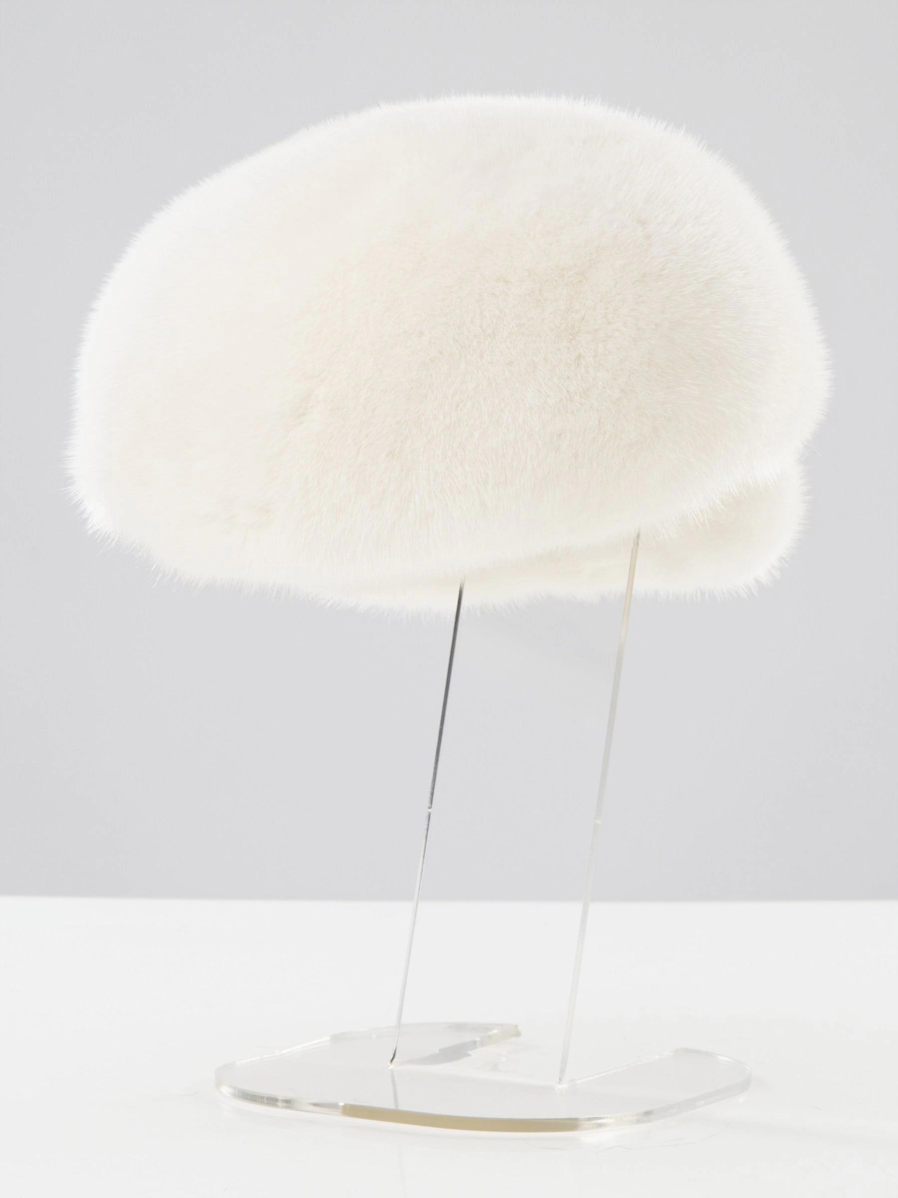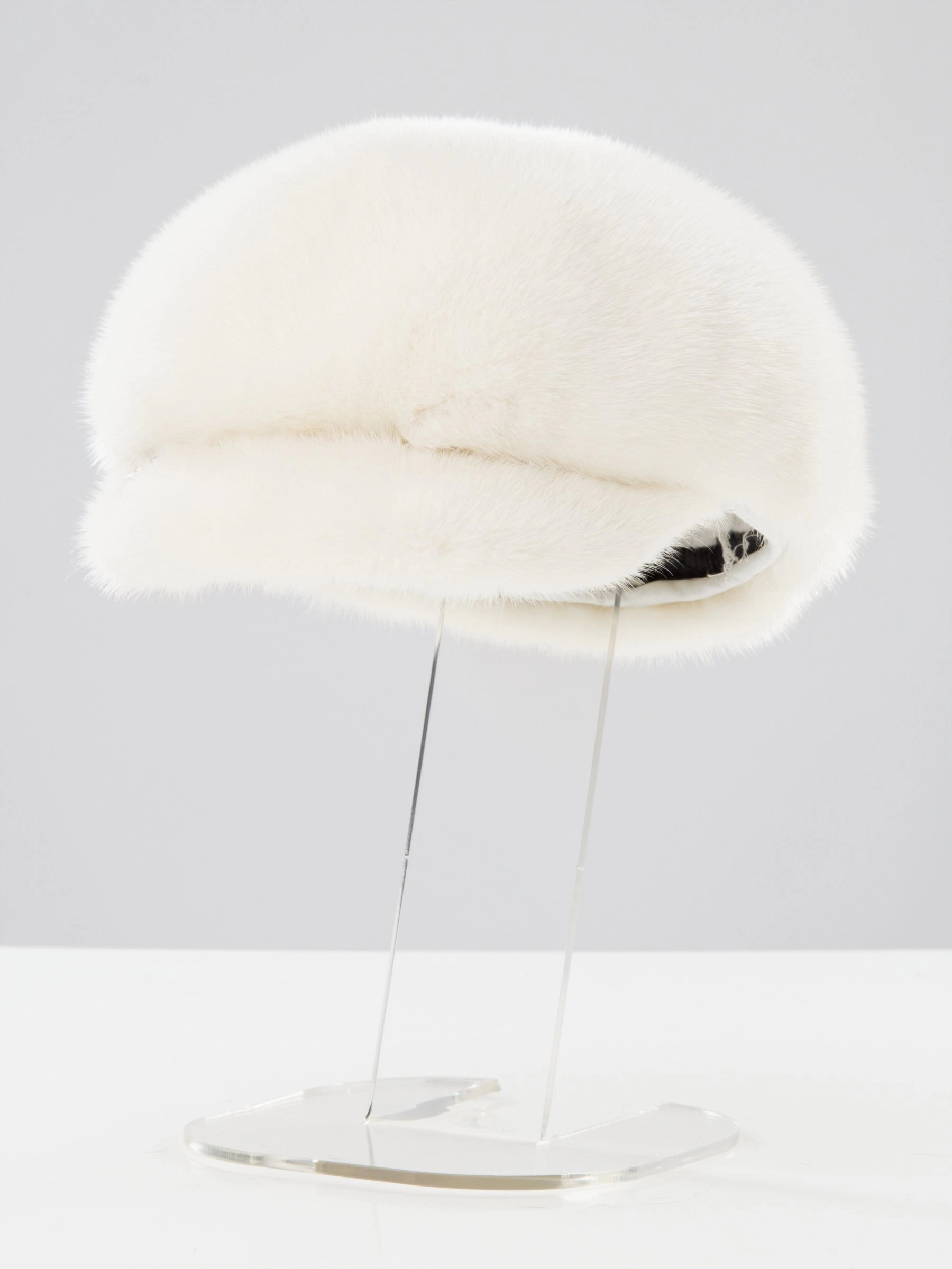 Белая фуражка не выглядит традиционно. Вместо привычного хлопка для пошива- мастера использовали шелковистый мех норки. Таким же материалом обтянули слегка изогнутый жесткий козырек, внутри фуражки вставлен кожаный кант и регулятор размера. Такой аксессуар поможет подстроиться под одежду в любой цветовой гамме.