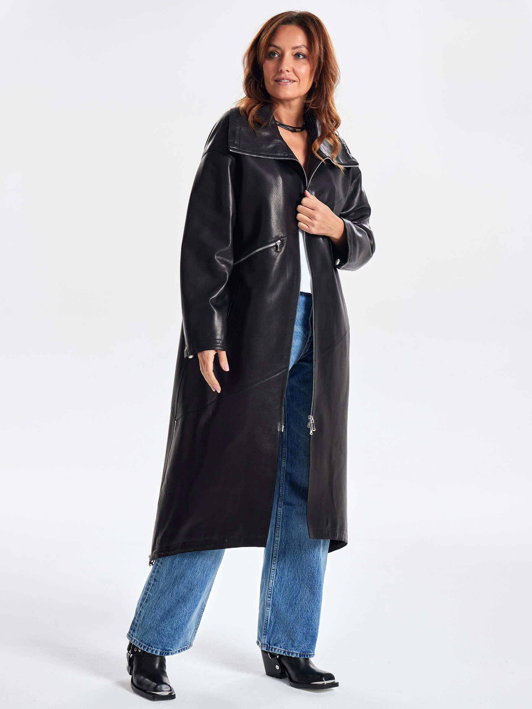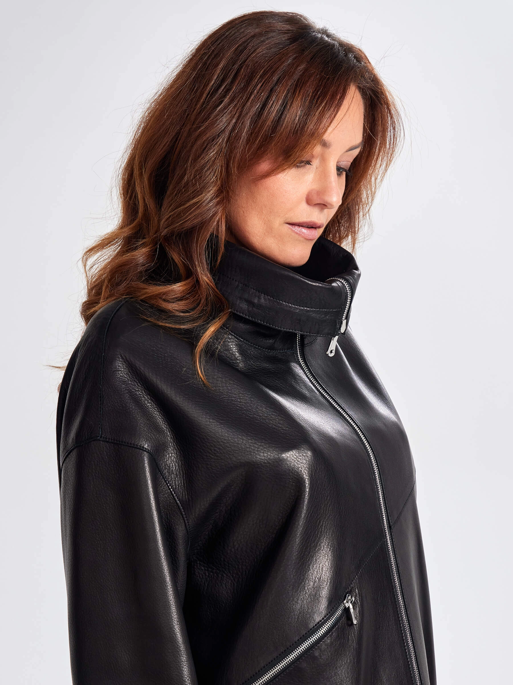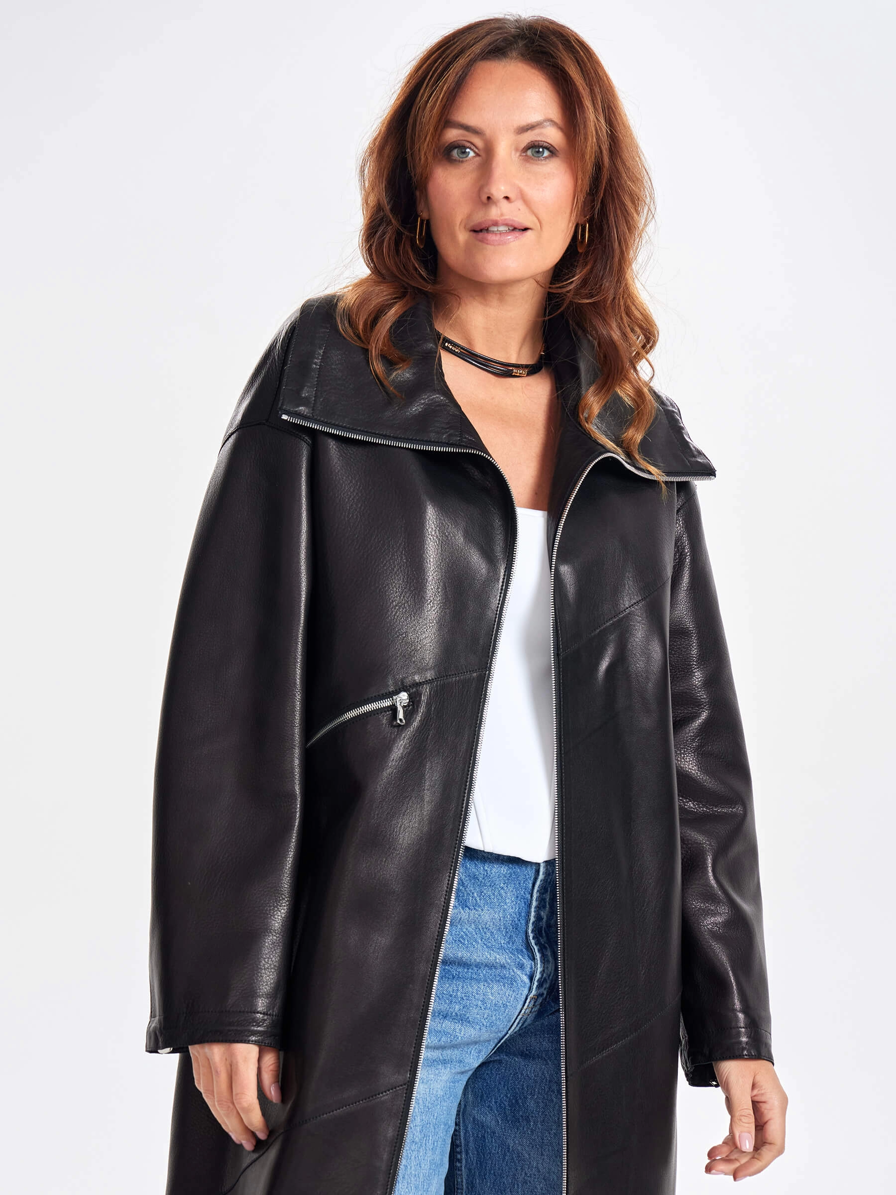 Товар женское кожаное пальто оверсайз на молнии премиум класса 3062, черное, размер 50, артикул 63360 выполнен из натуральной кожи с застежкой молния. Рассчитан на сезон: весна-осень. Длина изделия 115 см, силуэт оверсайз.