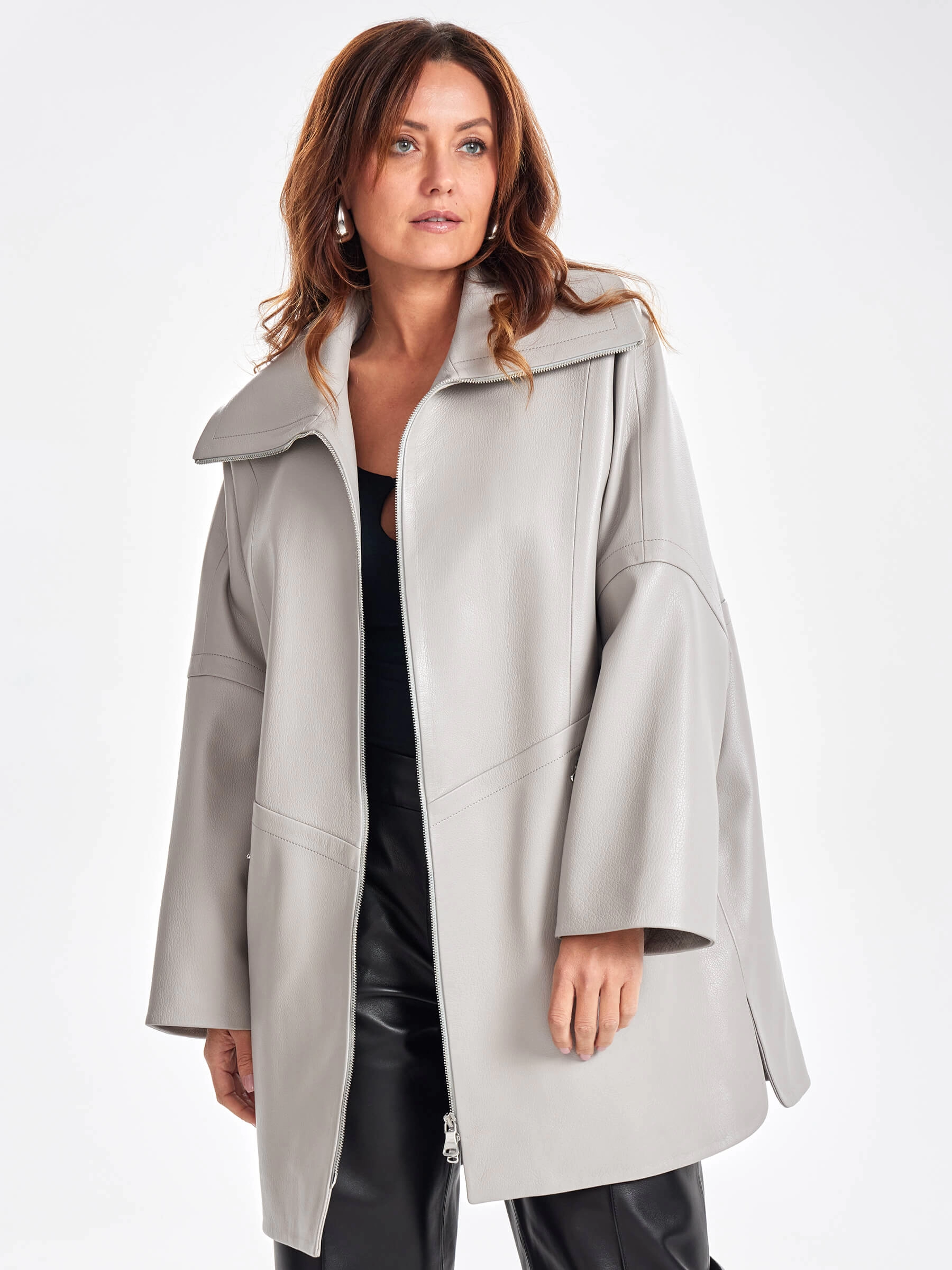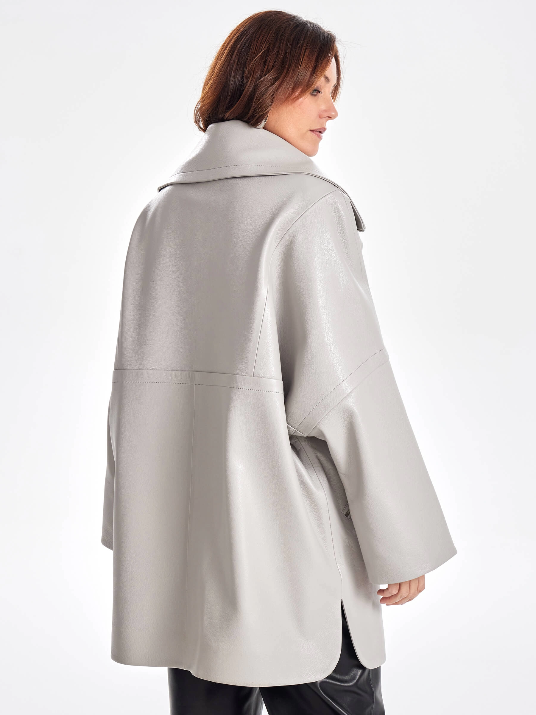 Женское кожаное полупальто оверсайз премиум класса 3057, серое, размер 52, артикул 64040