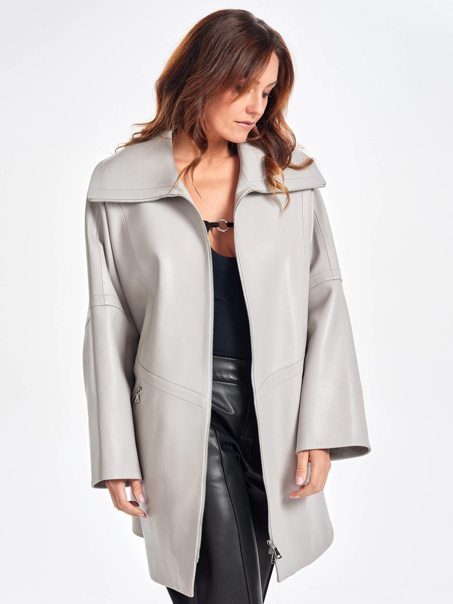 Стильное полупальто выполненное из фактурной мягкой кожи премиум класса гармонично завершит ваш ежедневный образ. Изделие свободного кроя, со спущенной линией плеч застегивающейся встречной молнией серебристого цвета. Дополнительный комфорт в ветренную погоду добавит воротник-стойка, Для большей свободы движения предусмотрены боковые разрезы.