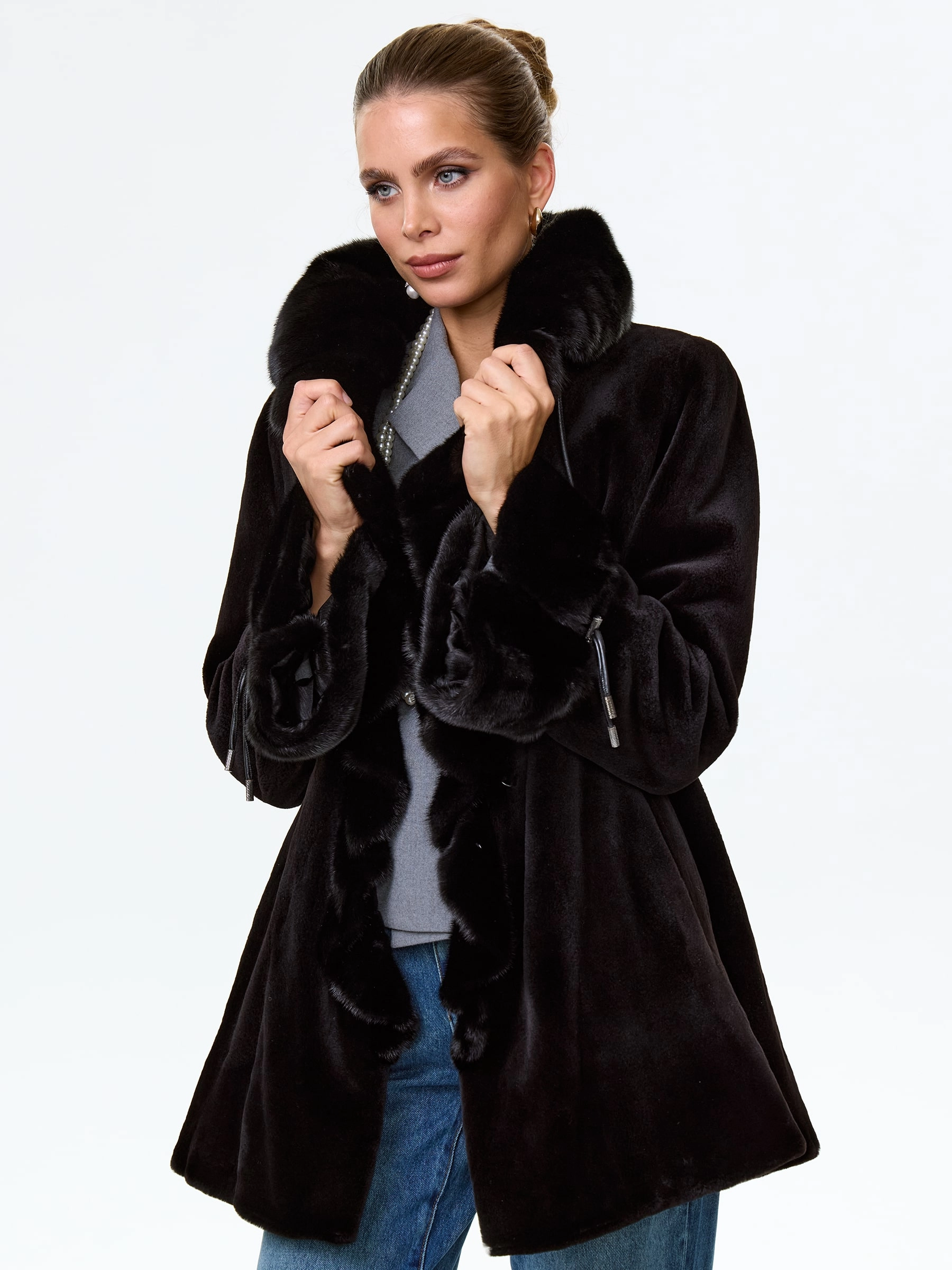 Для пошива этого полупальто использовали бархатистый щипаный мех норки в тандеме с низковорсовой, которой подчеркнули детали изделия. Прямой крой, комфортная посадка по фигуре. Шалевидный воротник и манжеты регулируются кулисками. Застежка-клипсы.