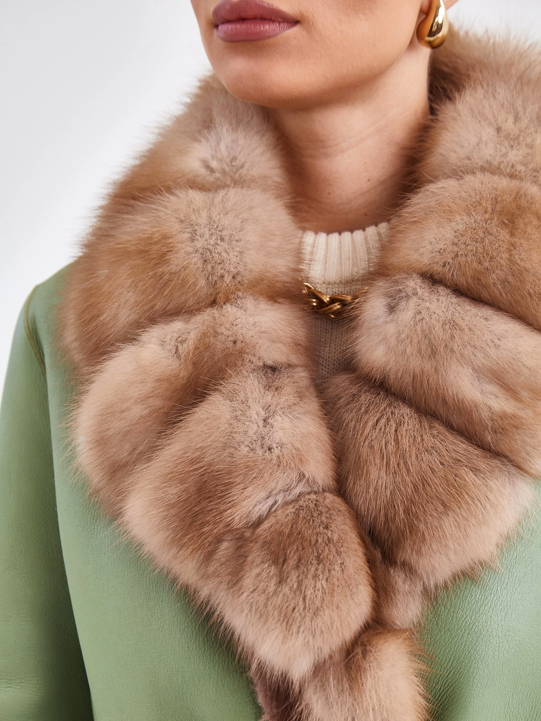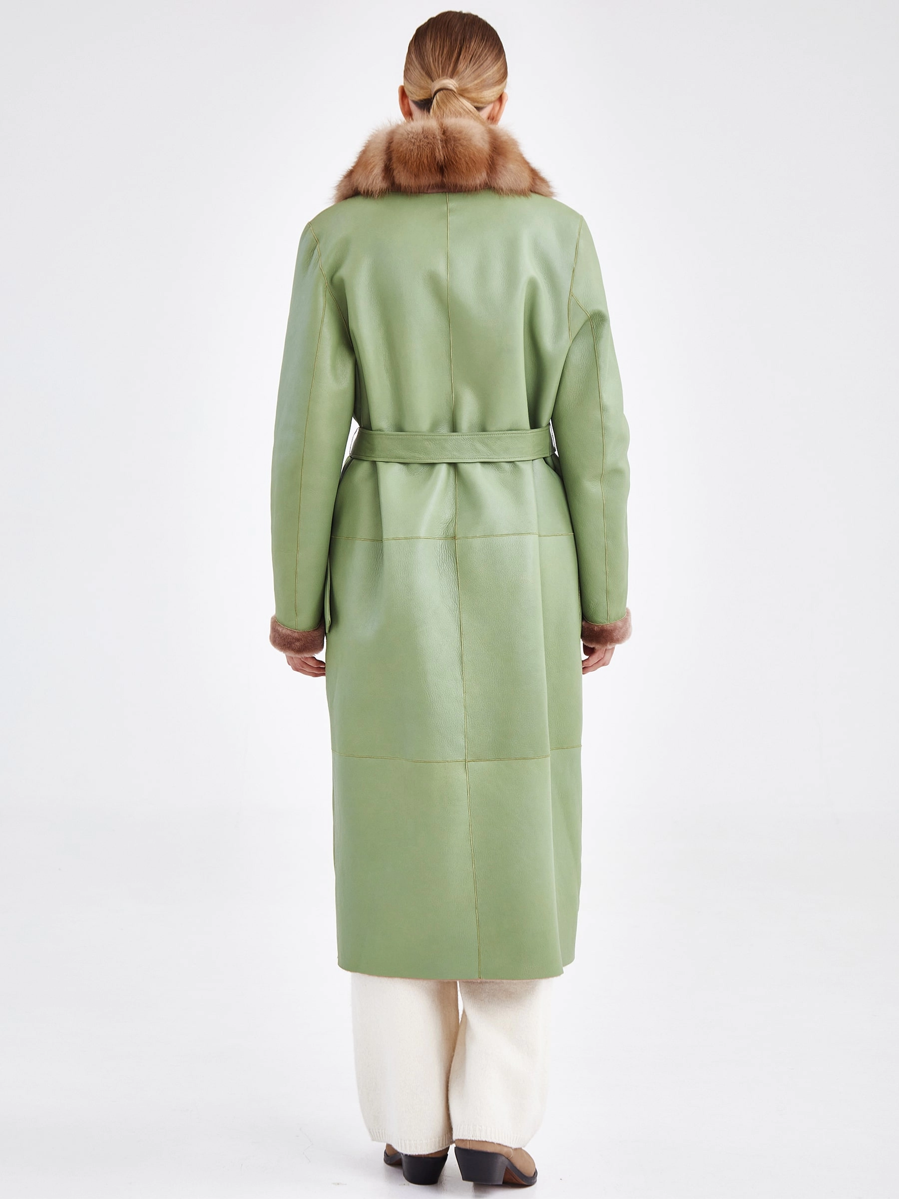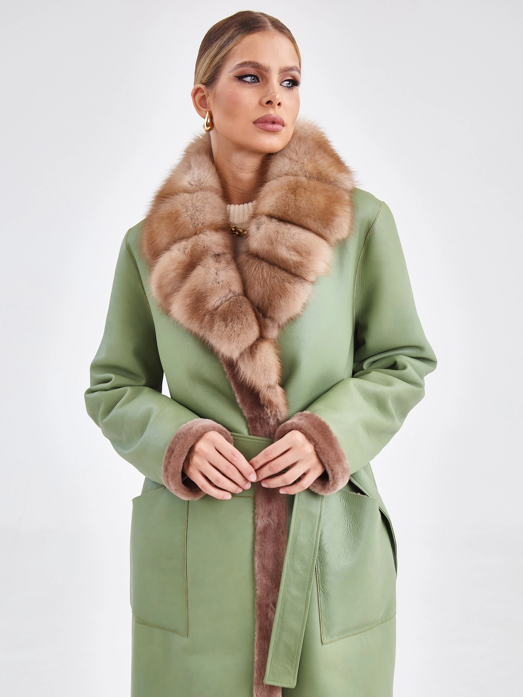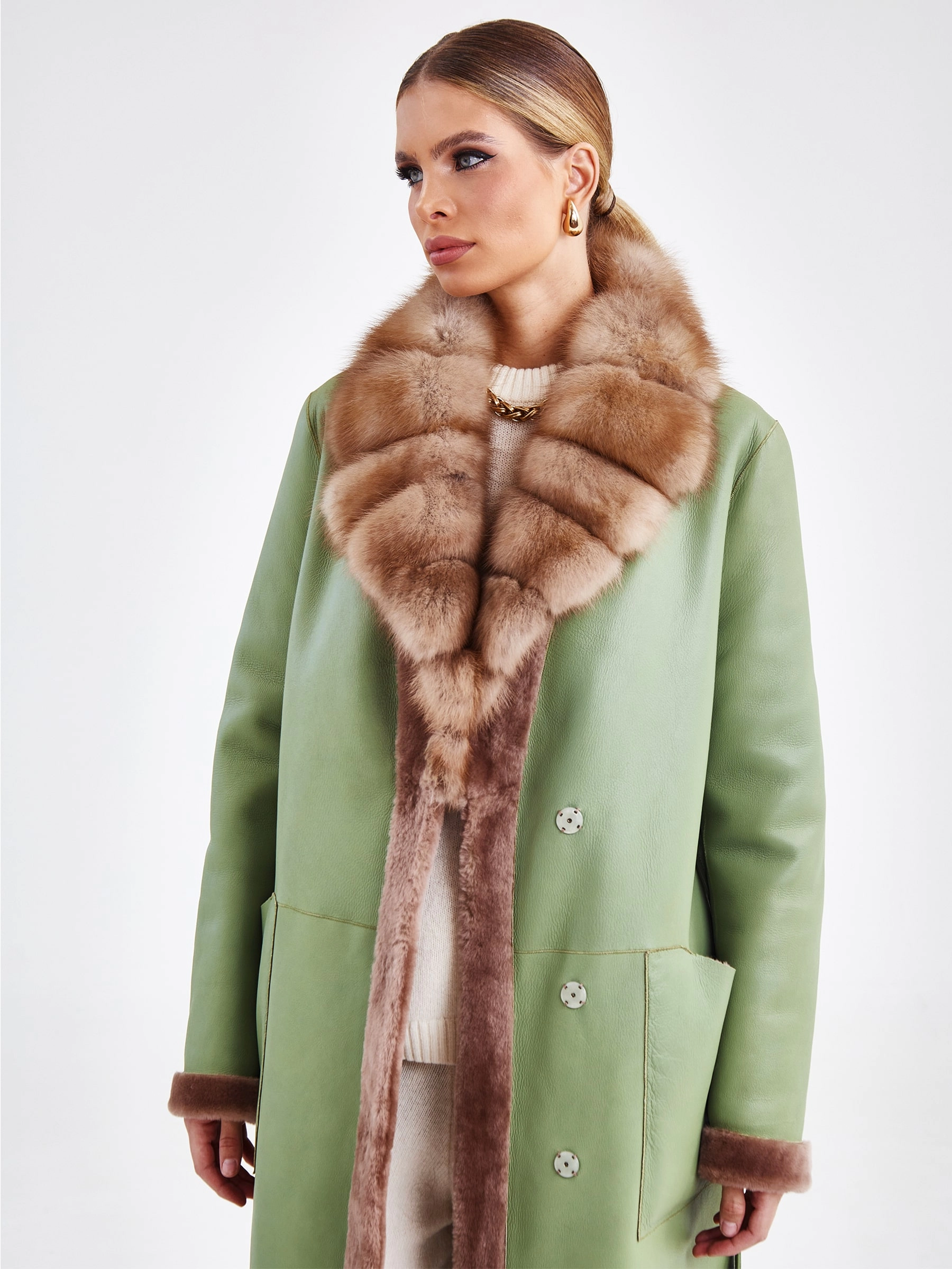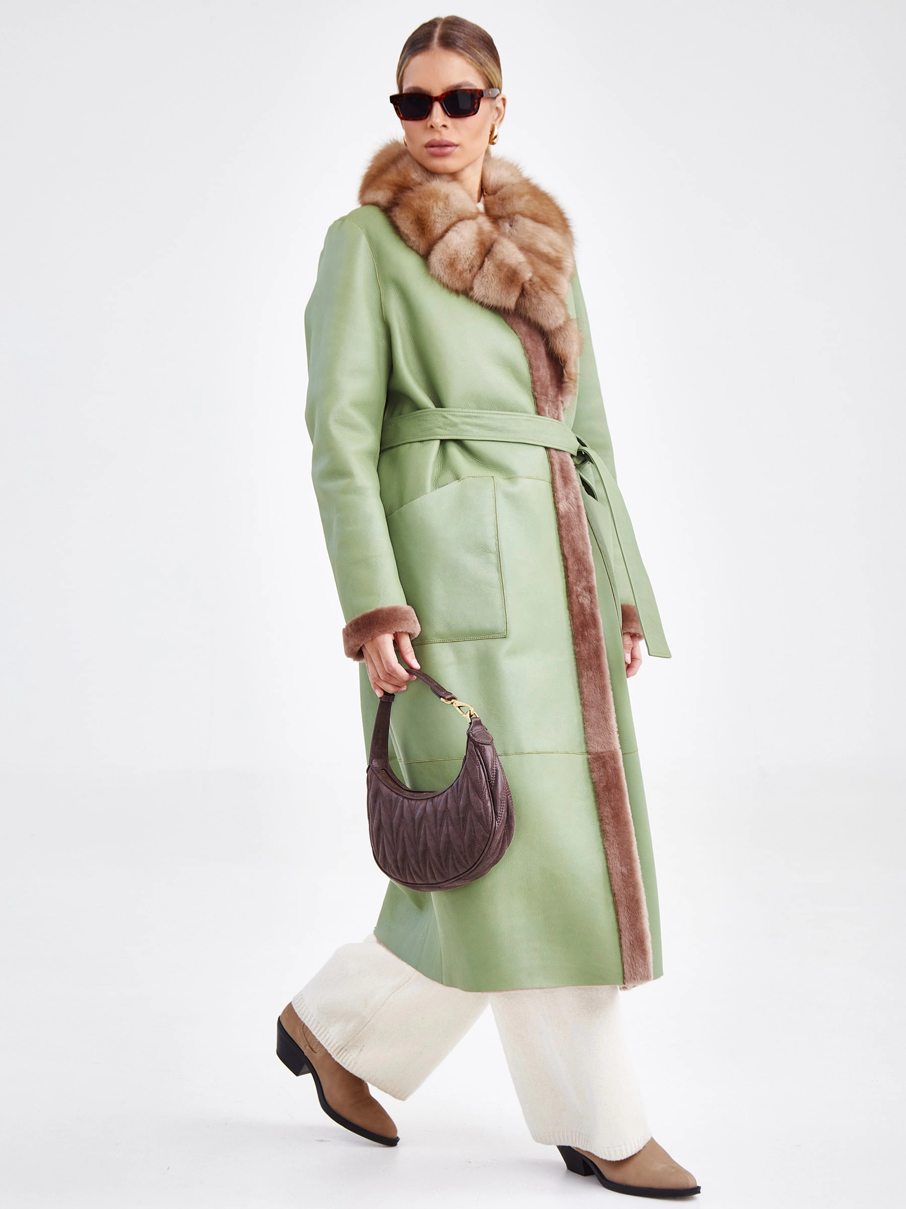Это длинное (свыше 90 см) пальто прямого силуэта с втачным рукавом, выполненно из мягкой овчины в эффектном двухстороннем сочетании цветов — оливкового снаружи и бежевого внутри, воплощает элегантную женственность. Его лаконичный дизайн с застежкой на кнопках и отделкой из шелковистой овчины по борту и манжетам получает роскошный акцент — английский воротник из меха куницы, а длинный пояс позволяет легко трансформировать прямой крой в приталенный. Стилистически модель балансирует между современной классикой и неброской роскошью, что делает его идеальной основой для капсульного гардероба. Ключевой стилистический прием — контрастное цветовое решение: сдержанный оливковый создает строгий внешний образ, а теплый бежевый, открывающийся при движении или расстегнутой застежке, добавляет неожиданную глубину и мягкость. Сочетайте его с прямыми джинсами и грубыми ботинками для дерзкого образа или с платьем-миди и поясом на талии — для романтичного, играя на контрасте текстур и подчёркивая универсальность этой вещи.