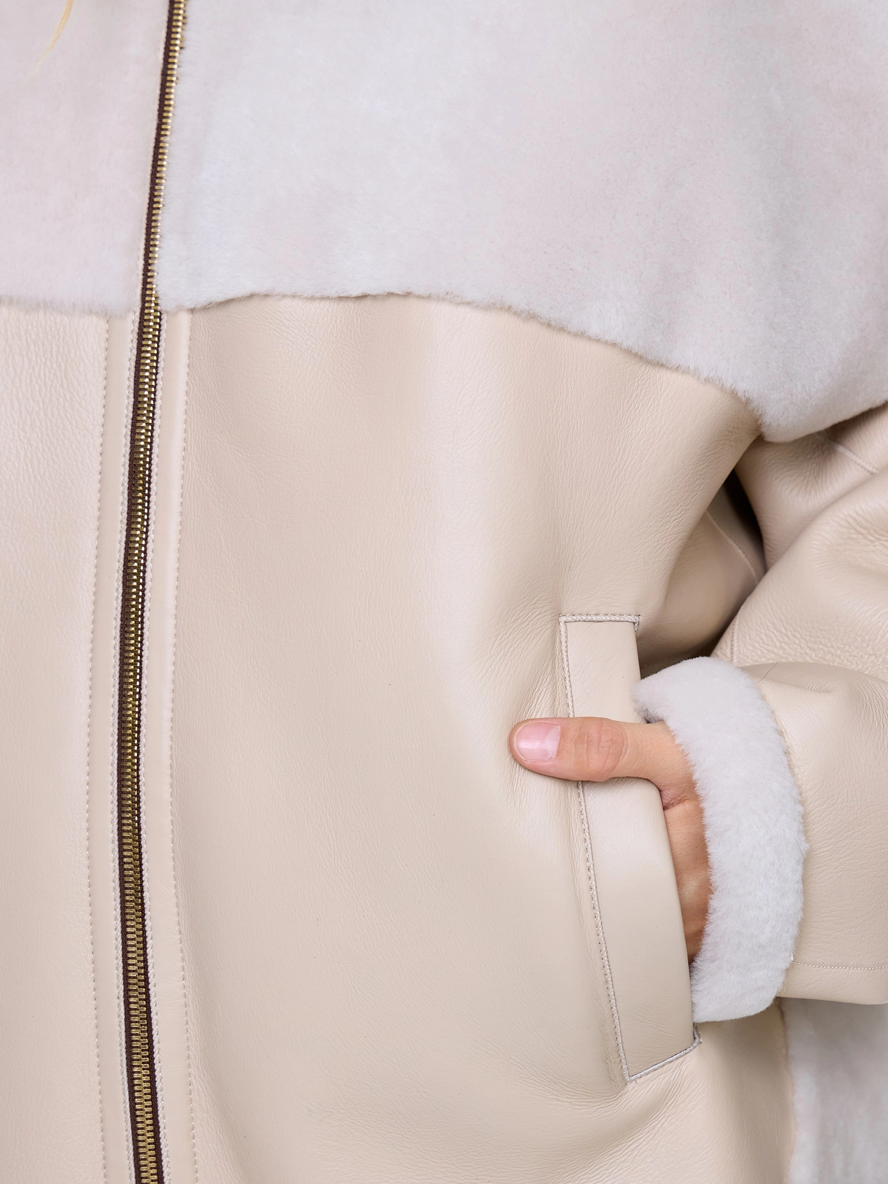 Товар женское полупальто из натуральной овчины с норковым воротником премиум класса 2034, бежевое, размер 52, артикул 64400 выполнен из овчина "мерино" с застежкой молния. Рассчитан на сезон: осень-зима. Длина изделия 76 см, силуэт свободный.