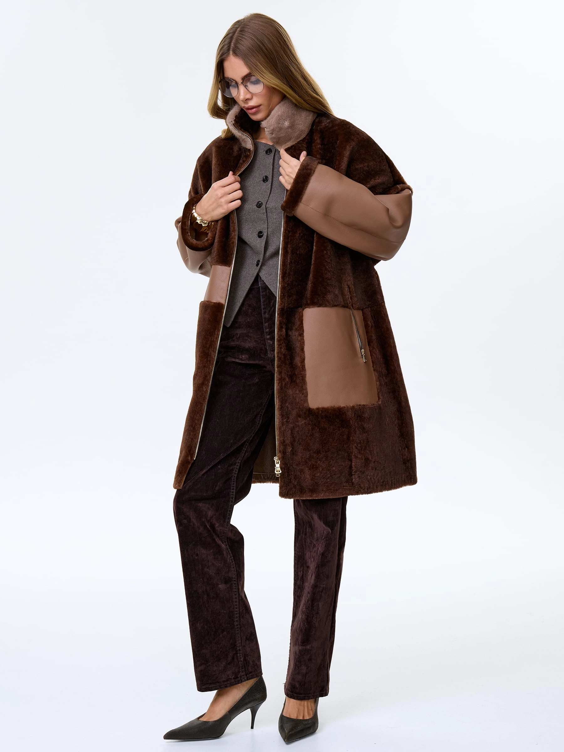 Для пошива этого полупальто из натуральной овчины использовали мягкую овчину с коротким бархатистым ворсом в комбинации с гладкой поверхностью. Свободный крой не сковывает движения. Объемный воротник-стойку подчеркнули густым мехом норки. Два врезных боковых кармана как и само полупальто застегиваются крупными молниями.