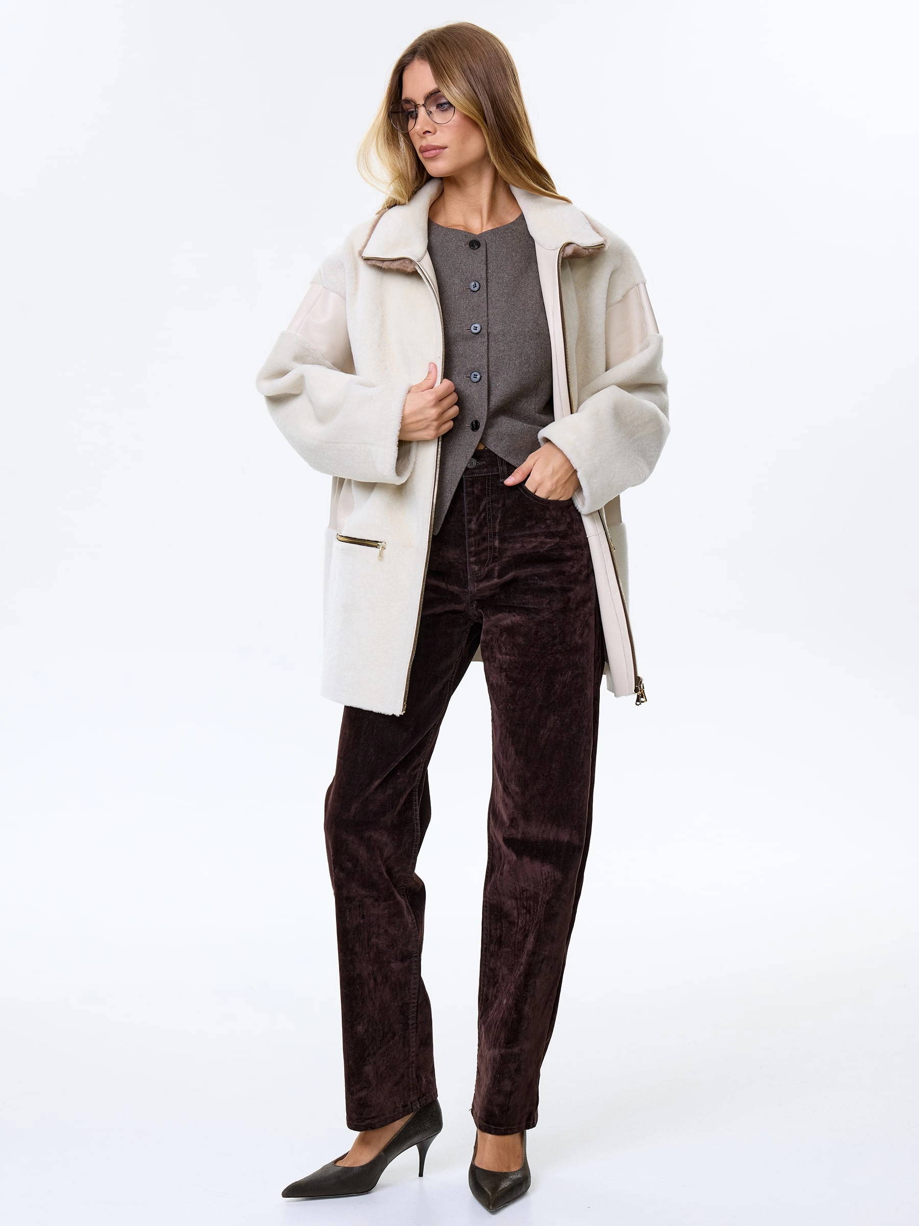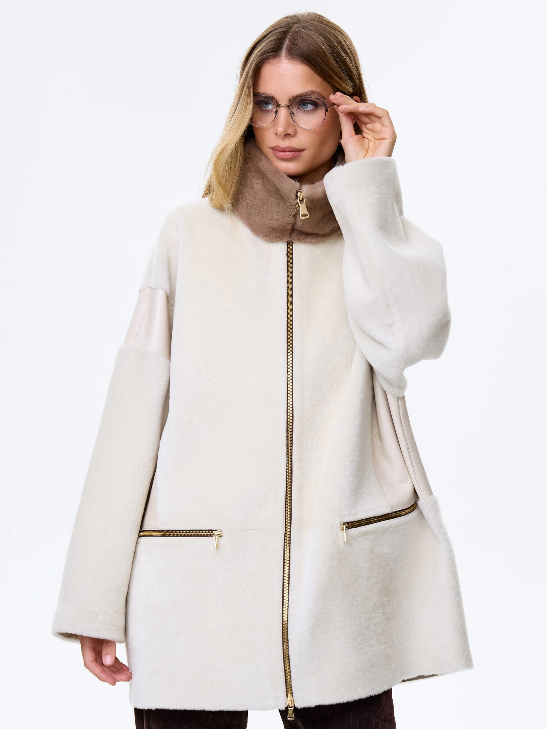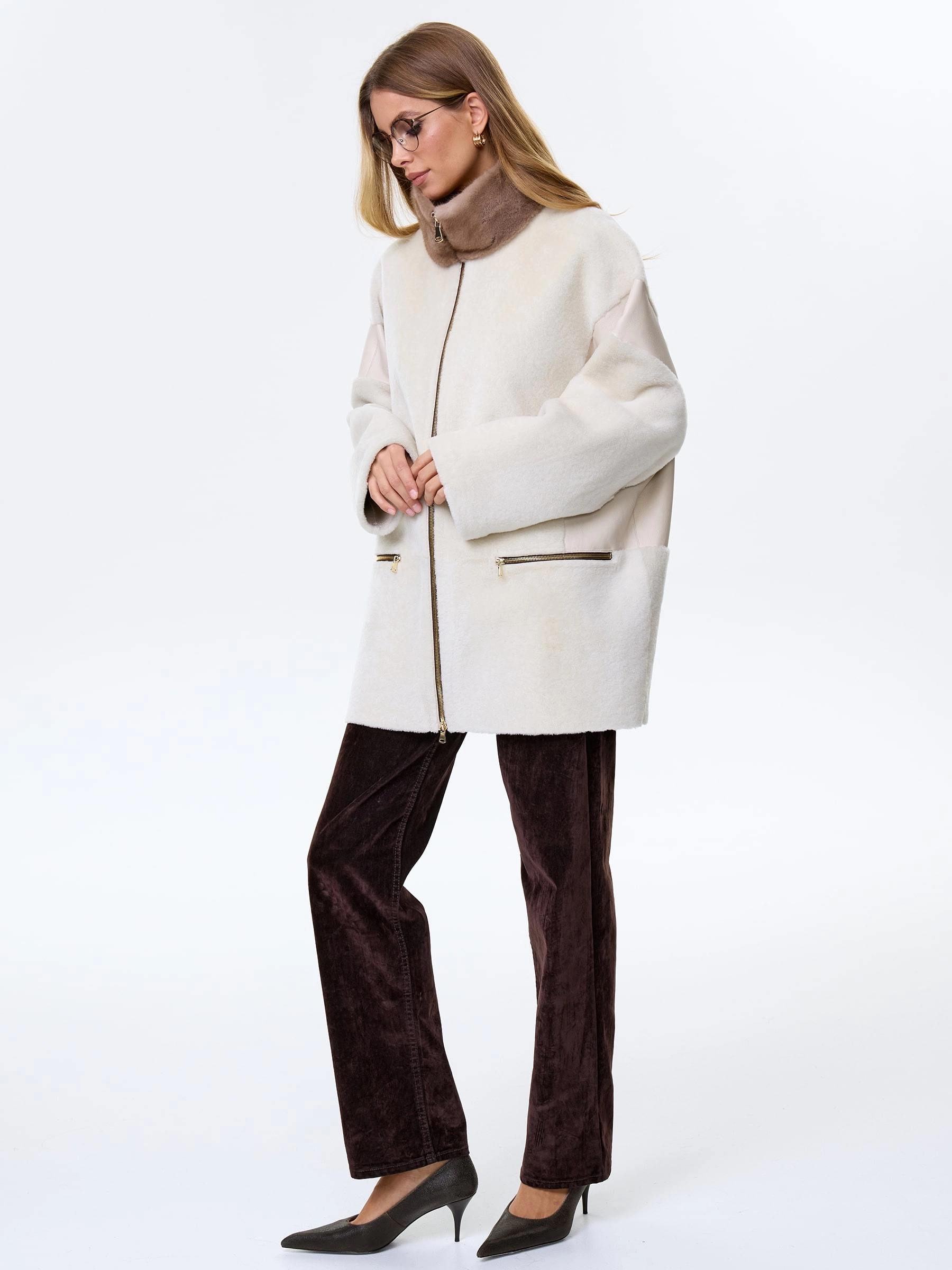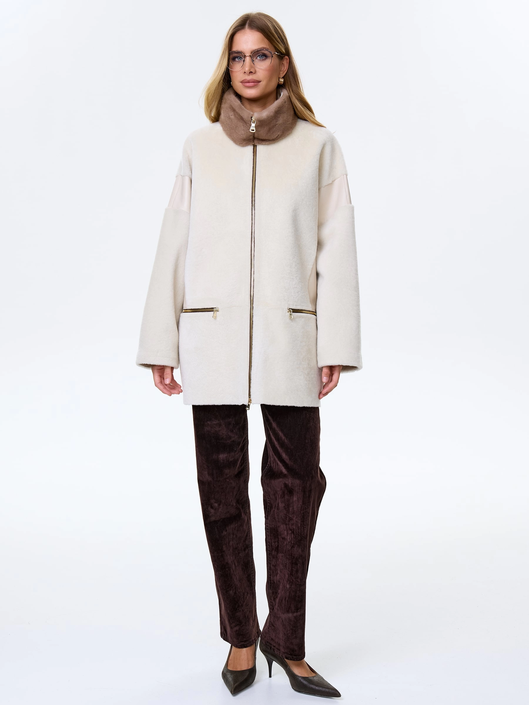 Товар женское полупальто с норковым воротником из натуральной овчины премиум класса 2057, белое, размер 44, артикул 64510 выполнен из овчина "мерино" с застежкой молния. Рассчитан на сезон: осень-зима. Длина изделия 77 см, силуэт свободный.