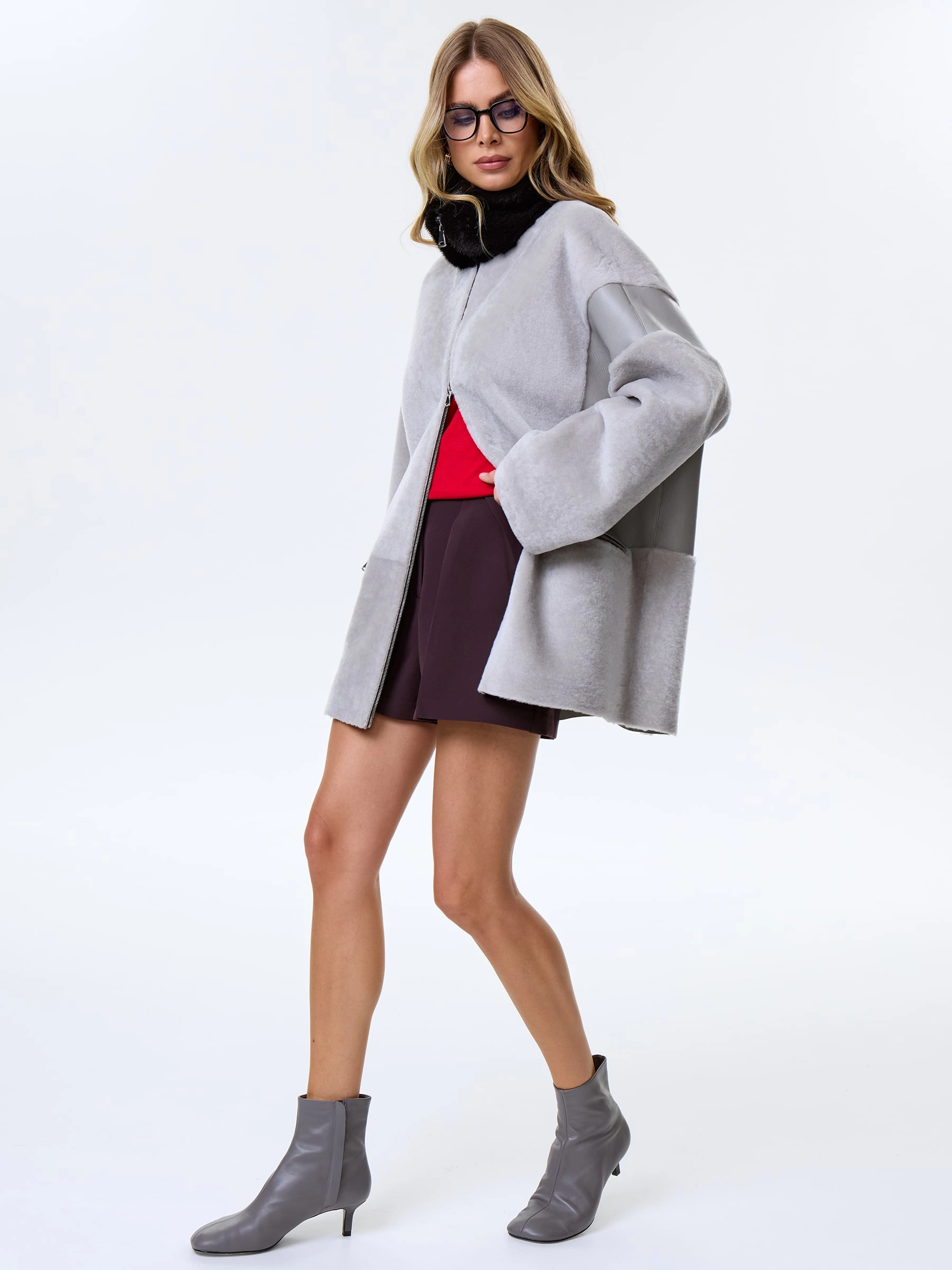 Товар женское полупальто с норковым воротником из натуральной овчины премиум класса 2057, серое, размер 44, артикул 64500 выполнен из овчина "мерино" с застежкой молния. Рассчитан на сезон: осень-зима. Длина изделия 77 см, силуэт свободный.
