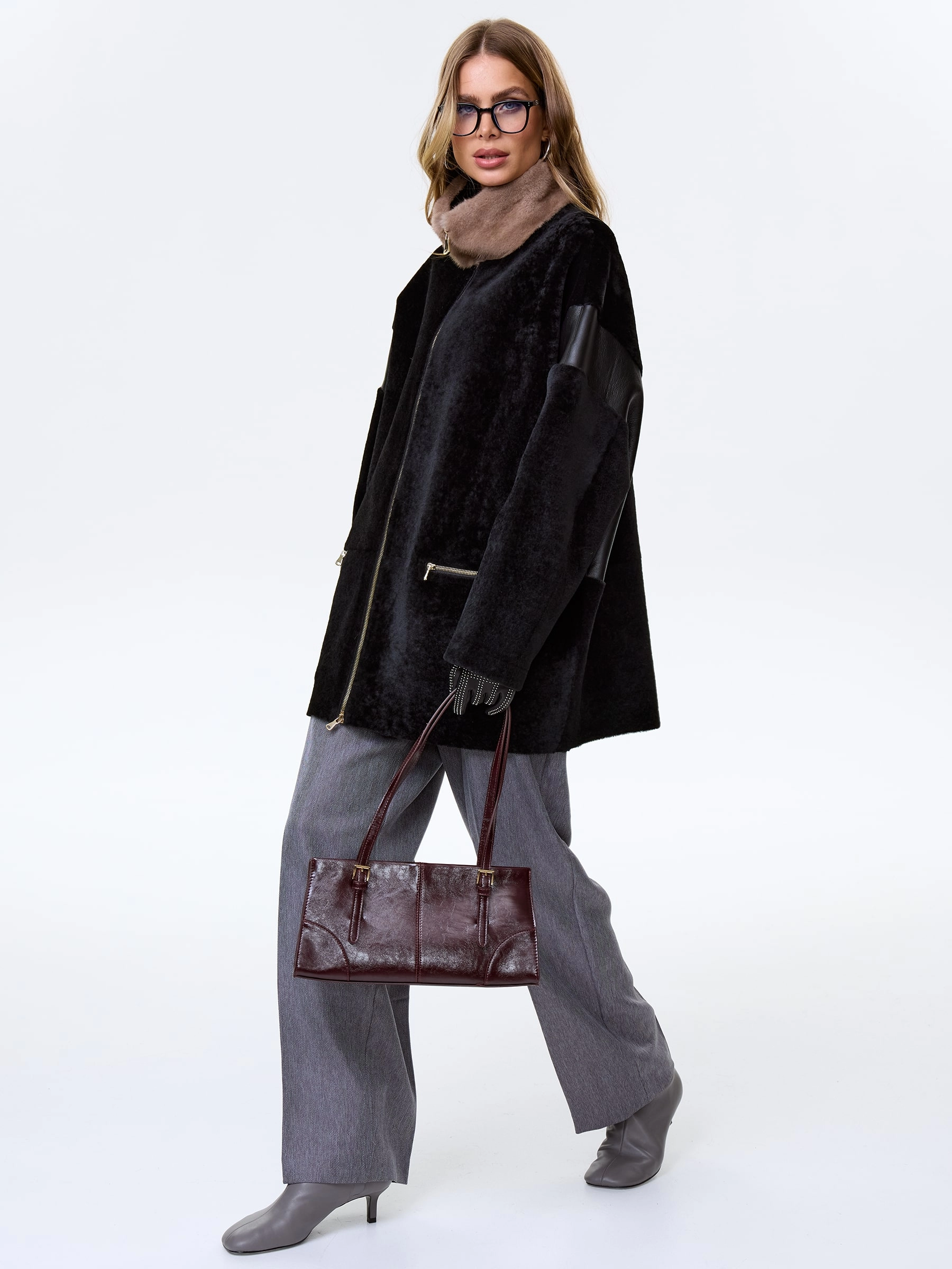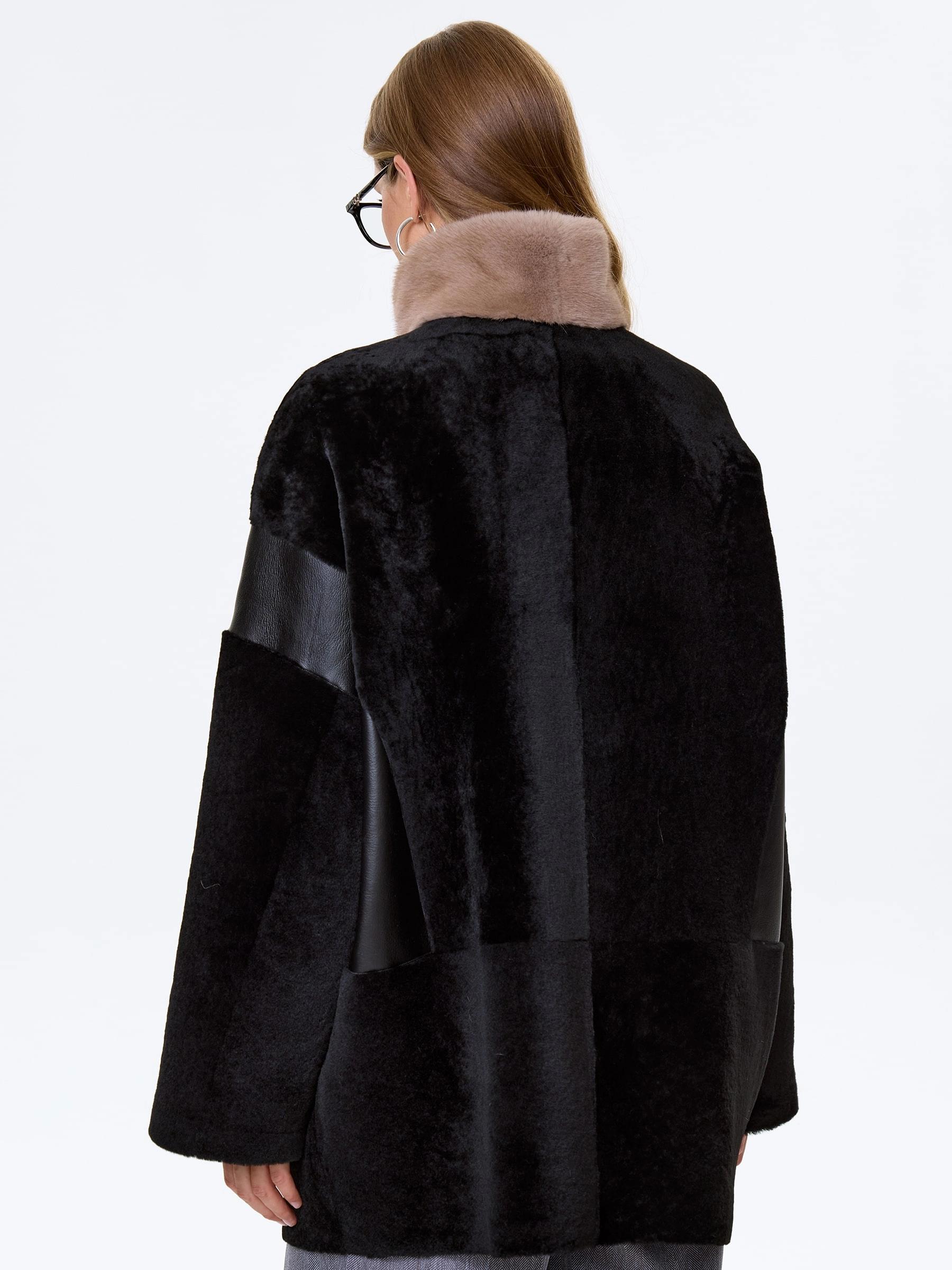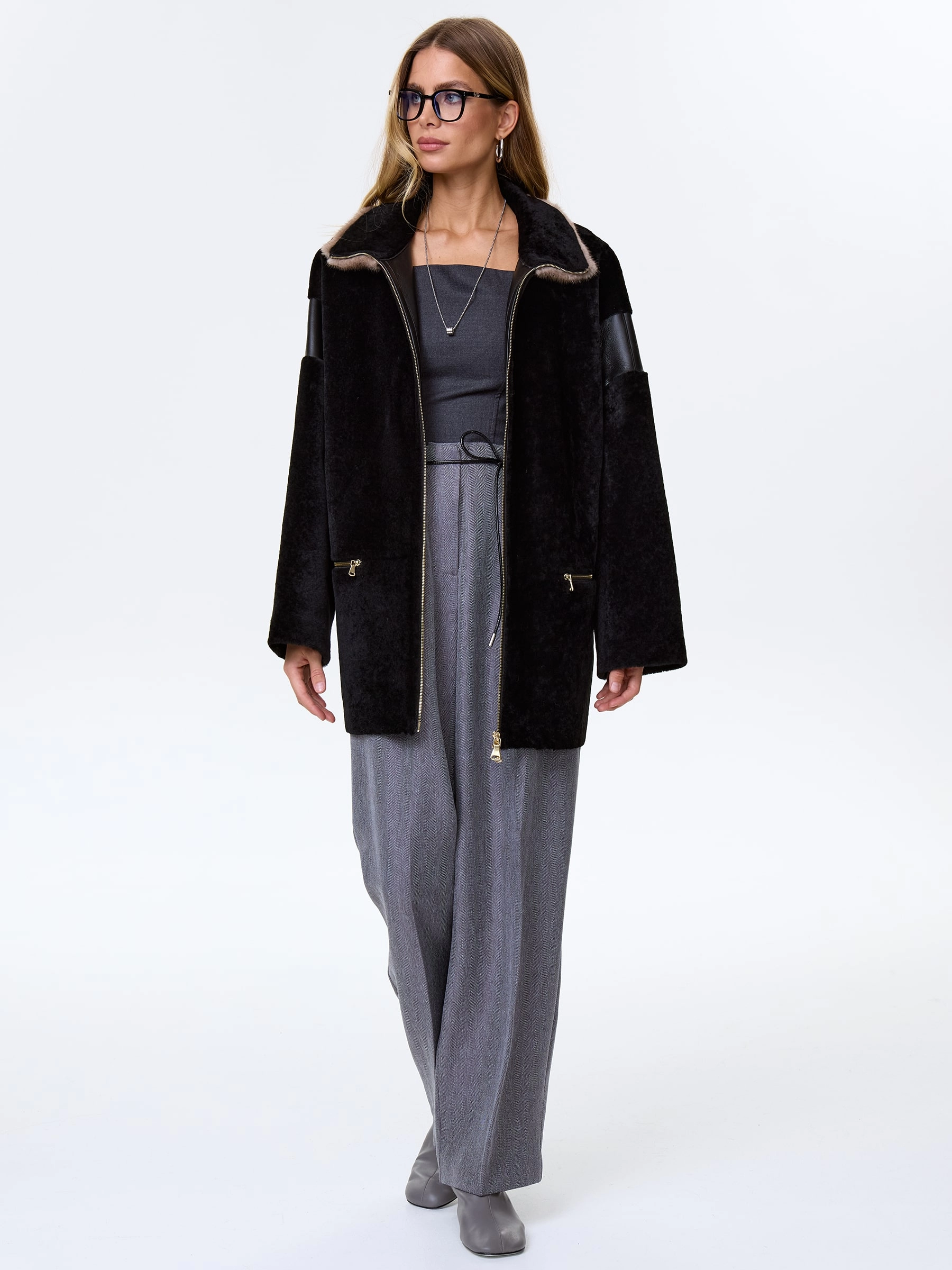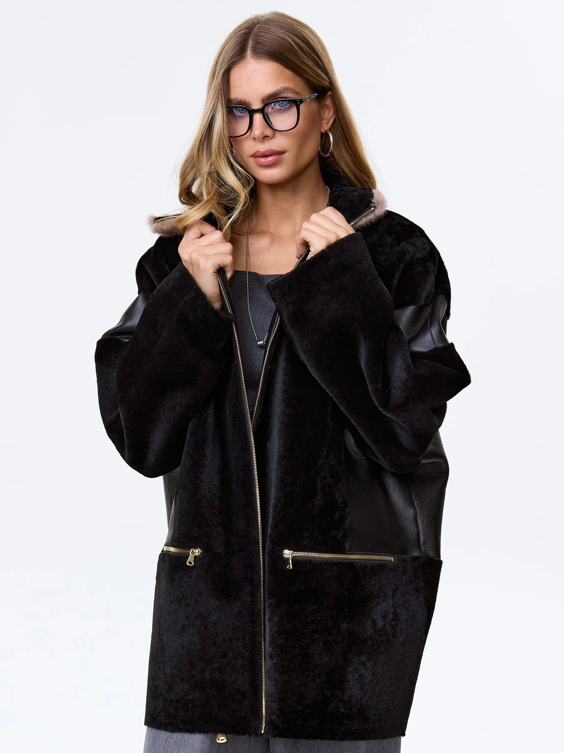 Полупальто свободного кроя выполнили овчины премиум класса в классическом черном цвете. Модель получилась максимально теплой, но при этом легкой и комфортной. Боковые карманы как и само изделие застегиваются молниями. Объемный воротник- стойку дополнили густой норкой.