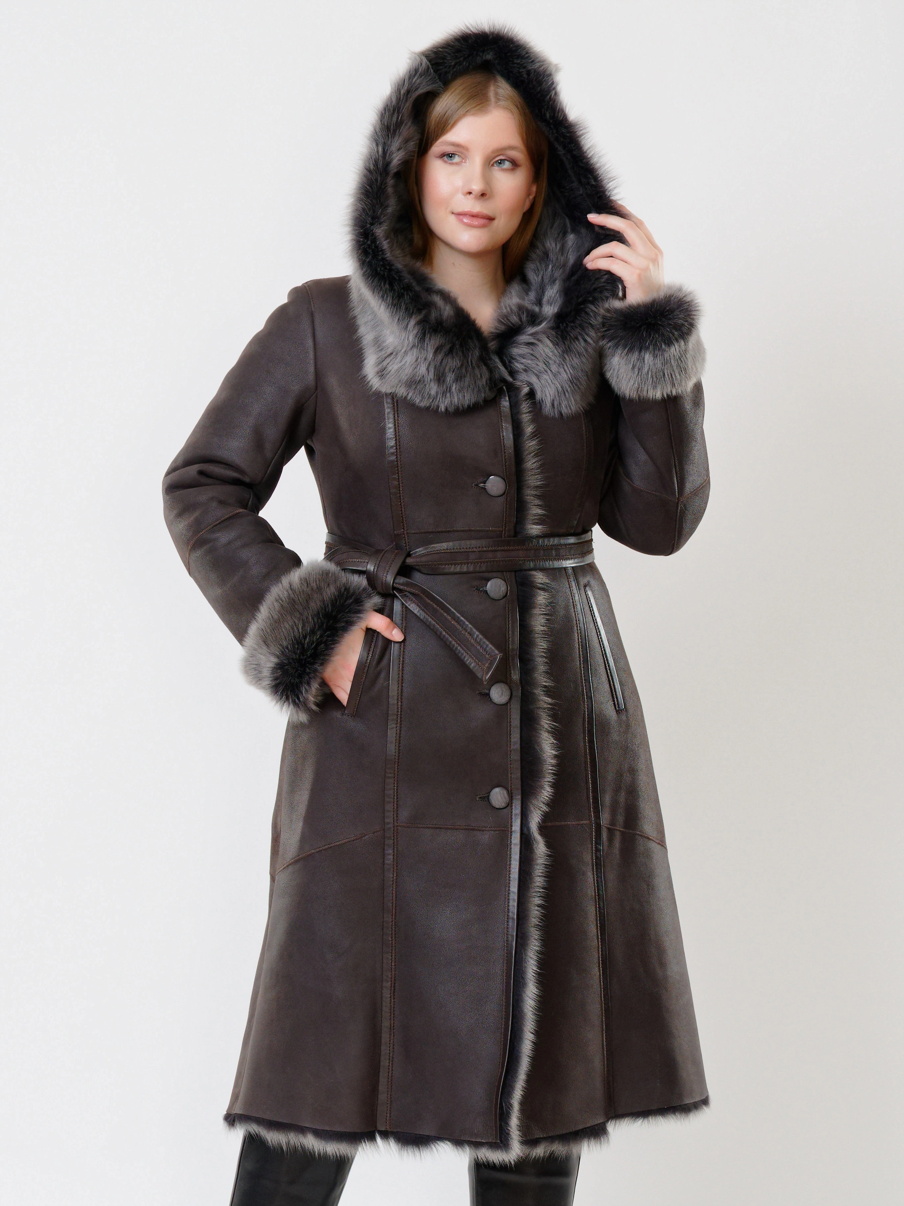 Прекрасная дубленка из тосканской овчины сумеет противостоять любым морозам. Модель получилась легкой и теплой. Отличным дополнением к образу, послужат брюки из натуральной кожи высшего качества. Супер комфорт.