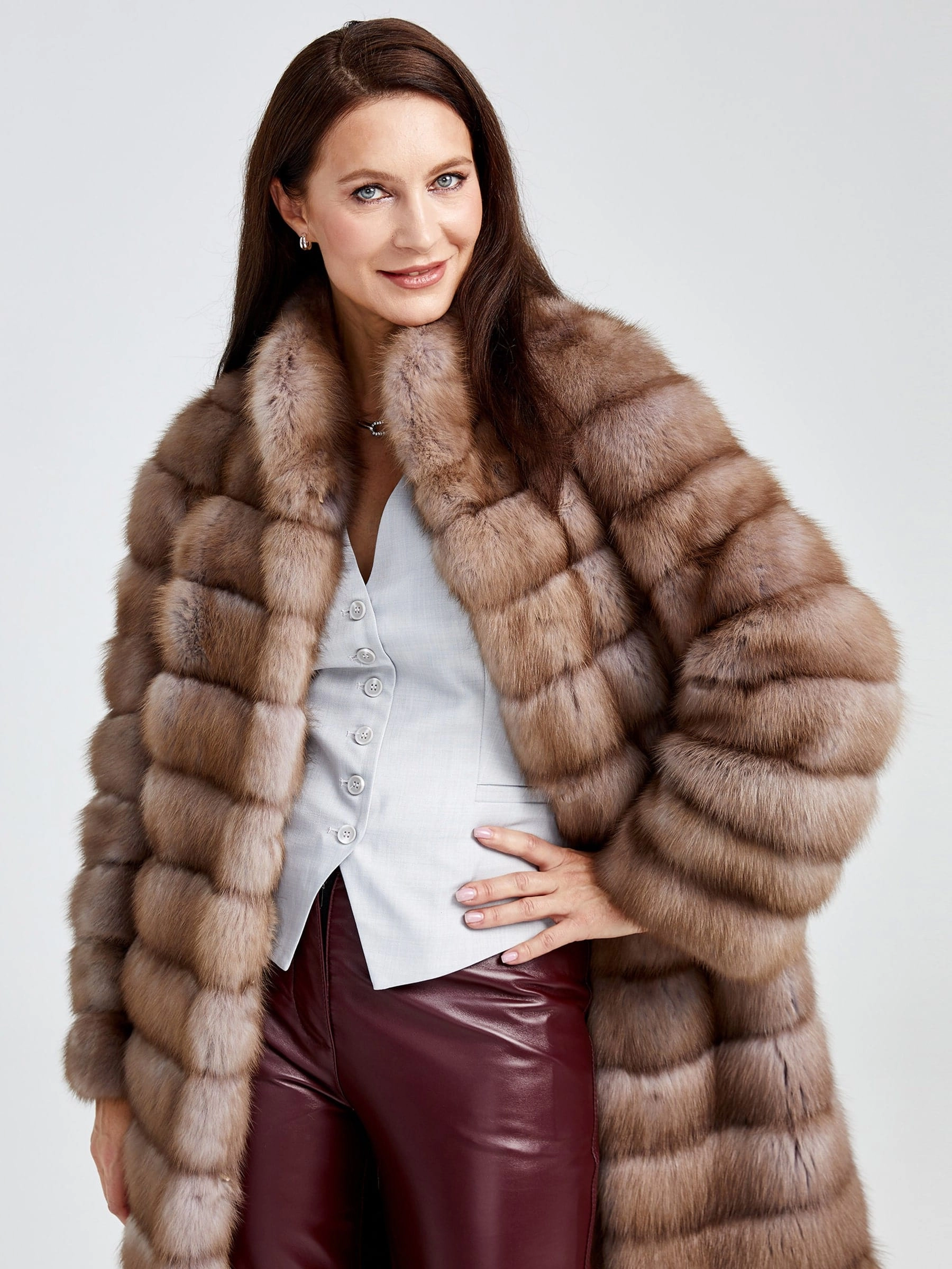 Зимний комплект женский: Шуба из меха соболя Ольга + Брюки 02, коричневый/бордовый, р. 44, арт. 111315